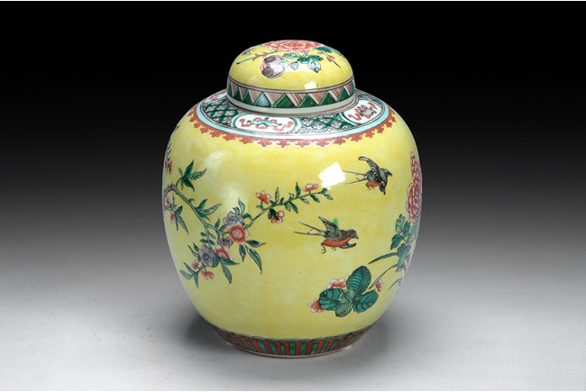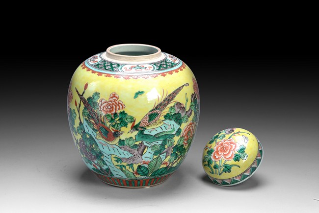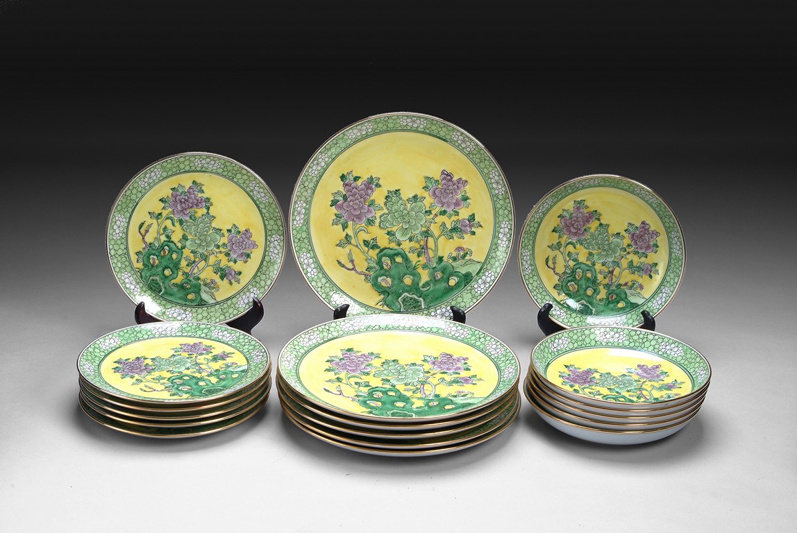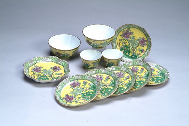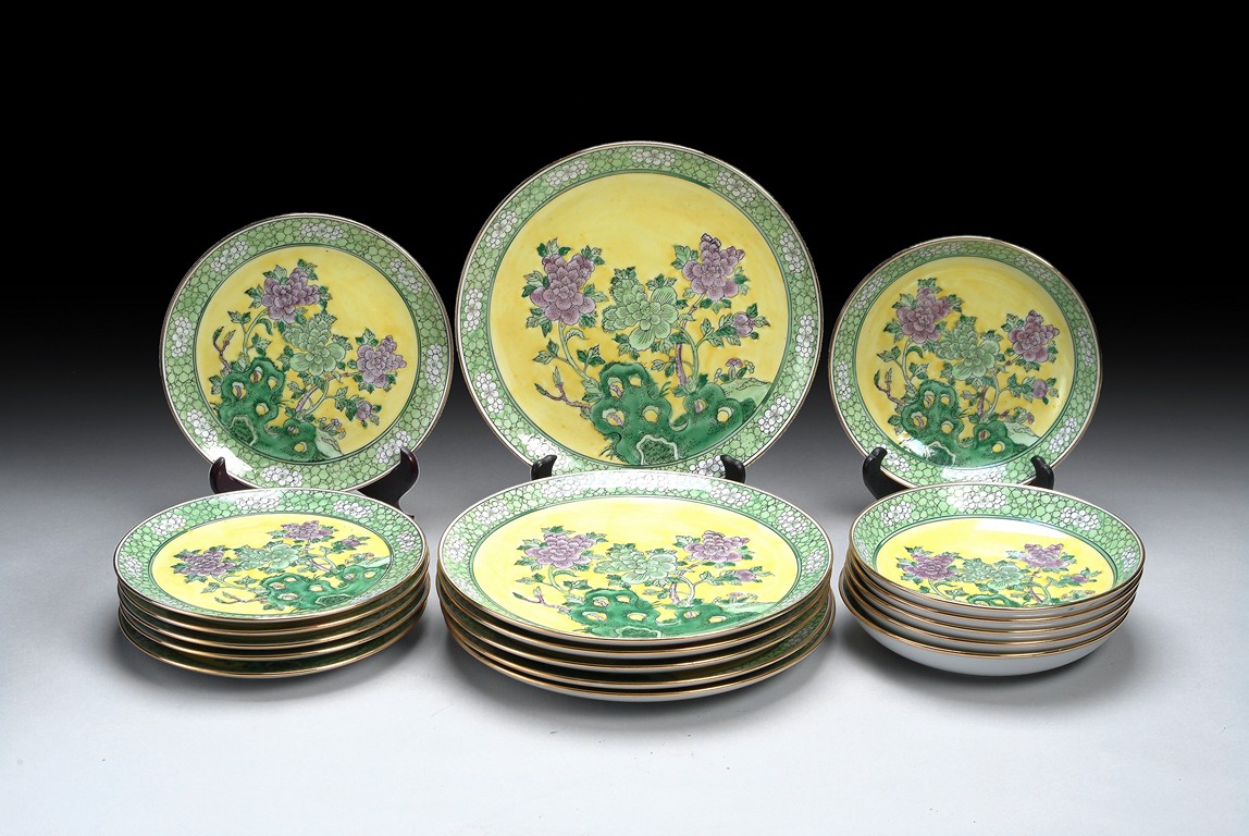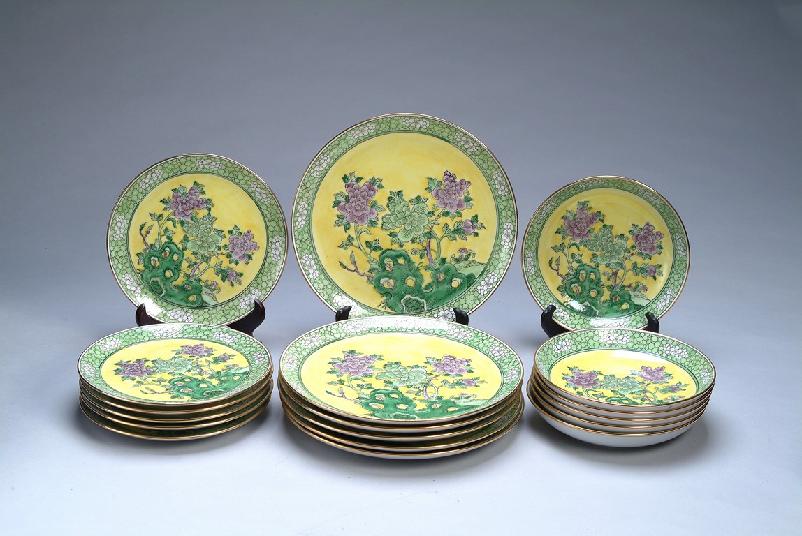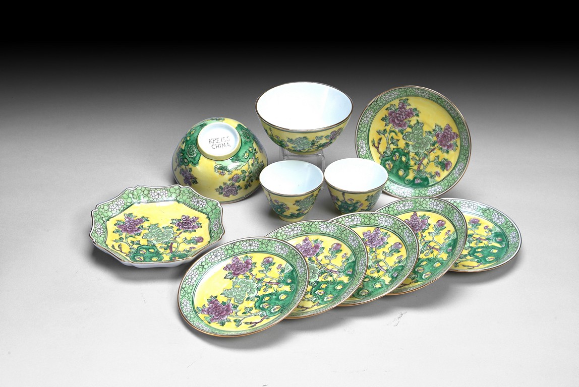 This dinnerware set includes two bowls, two cups, and twenty-six dishes; all decorated with yellow glaze, green flowery edge patterns, and flowers in the center; mark of 'KREISS CHINA' at bottom. The jar features short neck, globular body, and flat base
