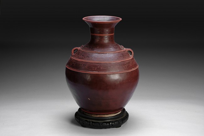This jar features wide opening, short neck, and ovoid shaped body; two small handles on the side; circular rings on the body and neck. It is engraved with wave patterns. Han Dynasty period.