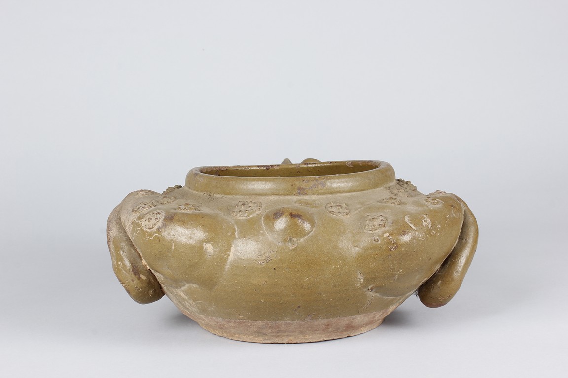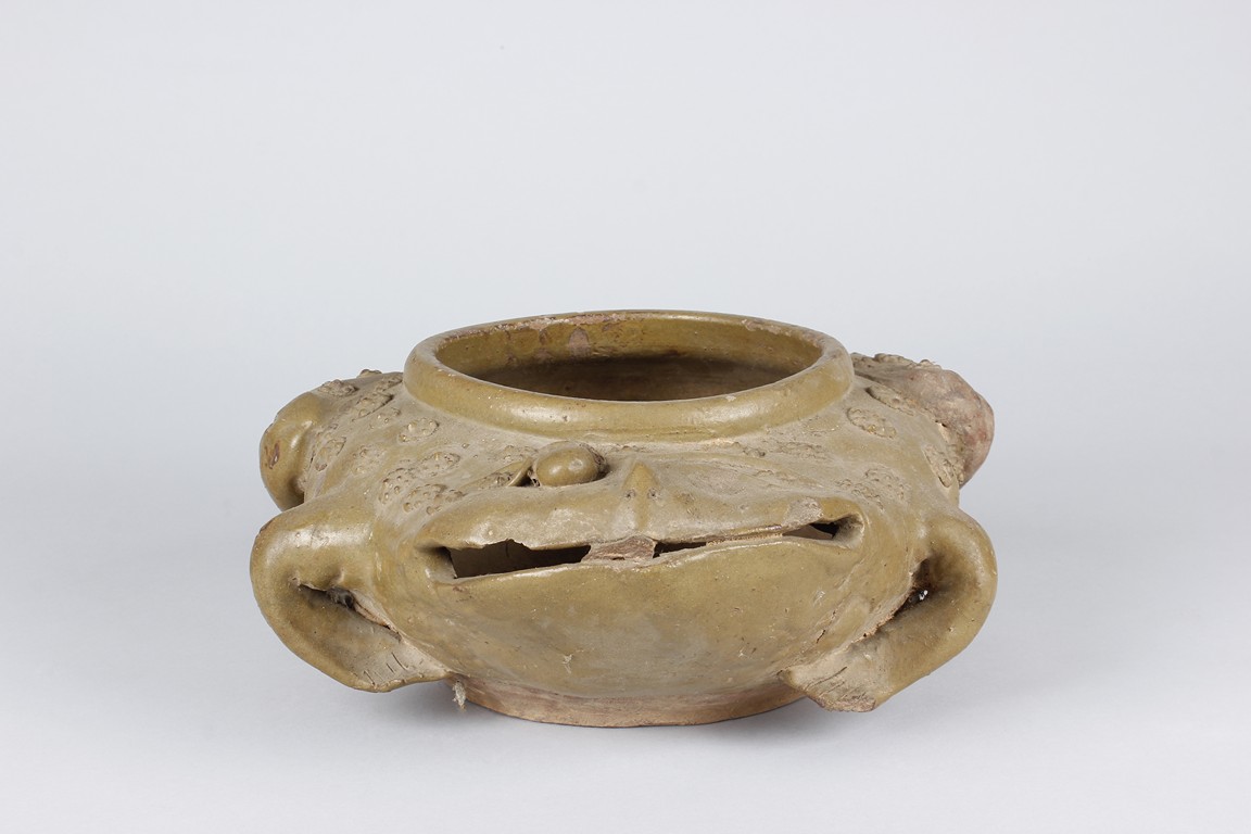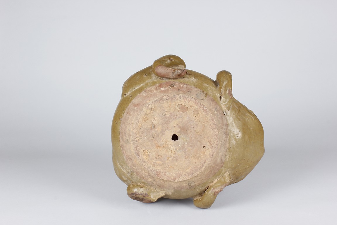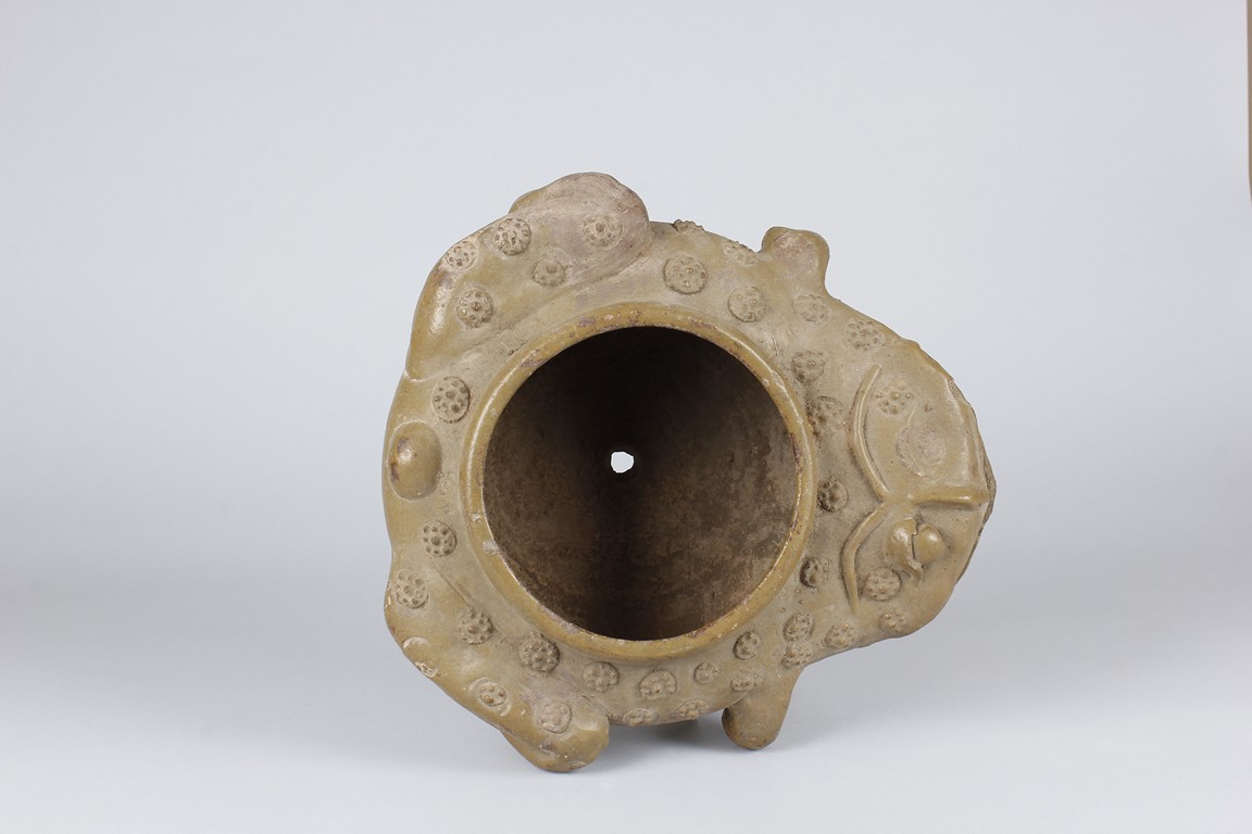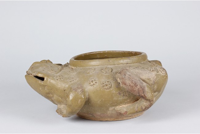 In the form of a toad, this pottery planter glazed in yellow, with vivid details on the surface. Missing an eye.