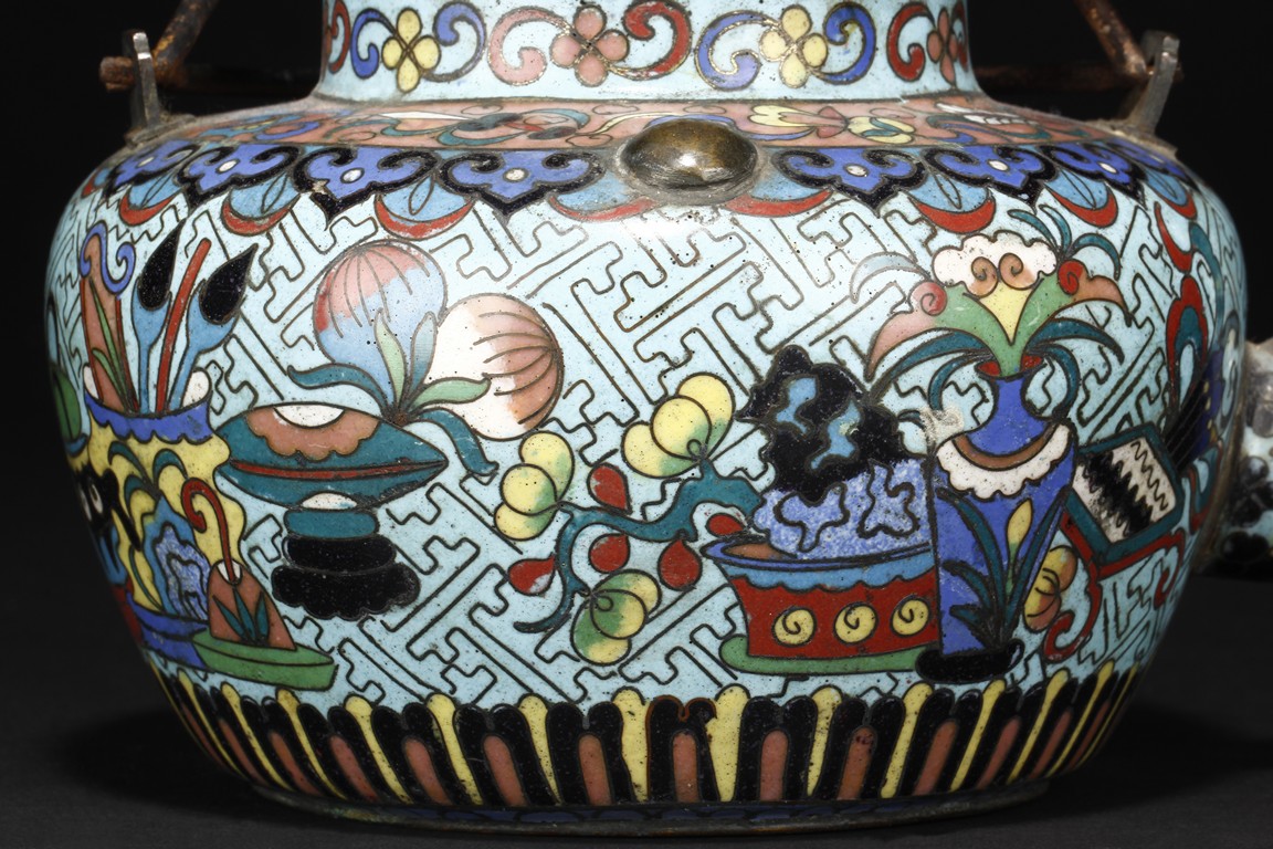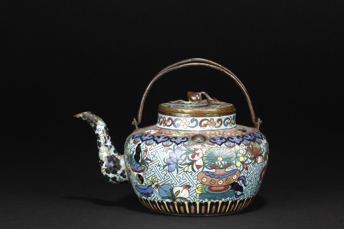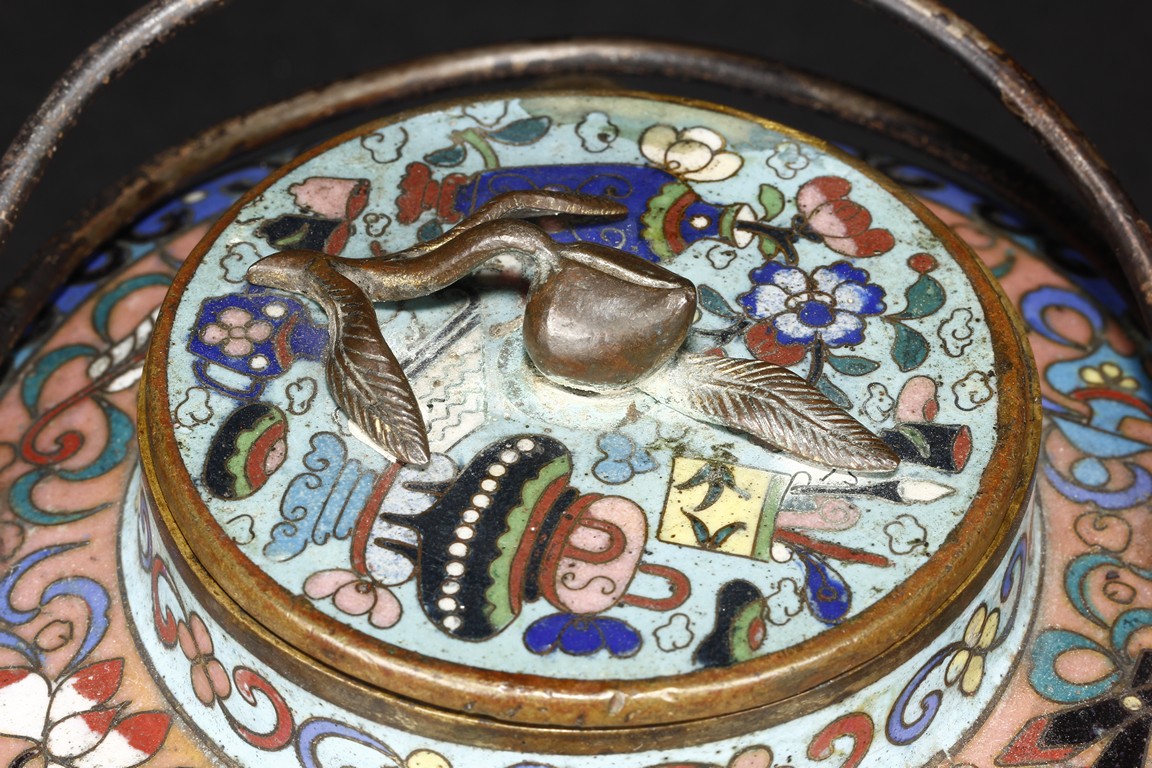 Of globular form, the wide shoulder tapers sharply to a round foot, the body decorated with lotus flowers, peaches, vases, and other auspicious items, against teal ground, between scrolling banana leaf patterns and ruyi cloud patterns, the finial in the shape of peach, below two arching metal handle bars.