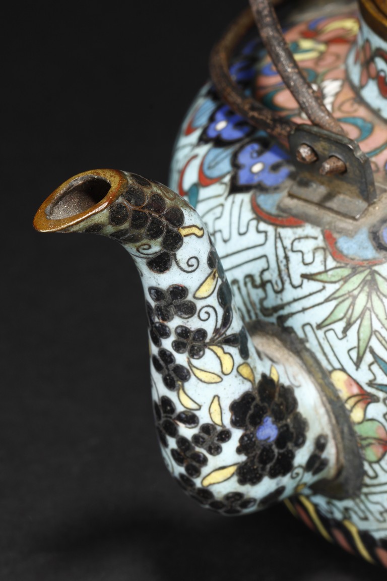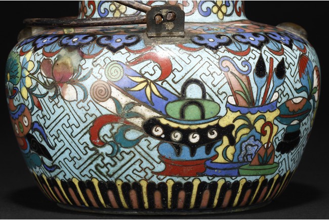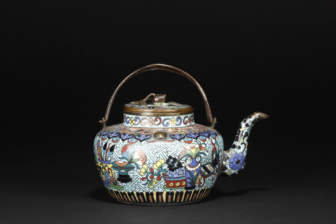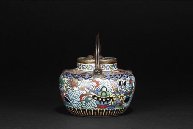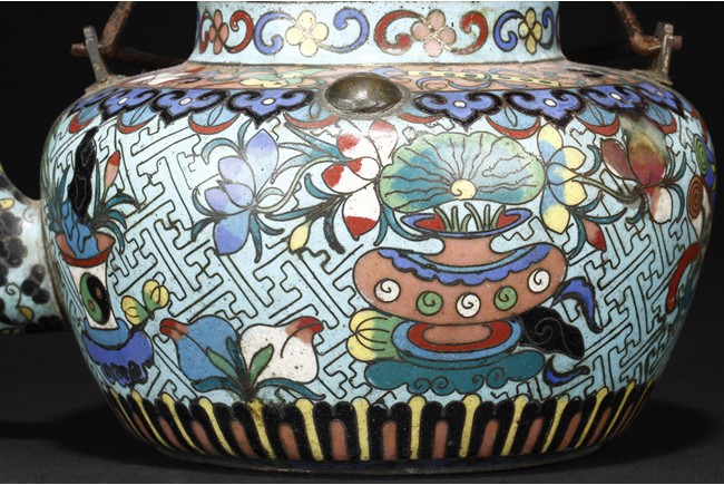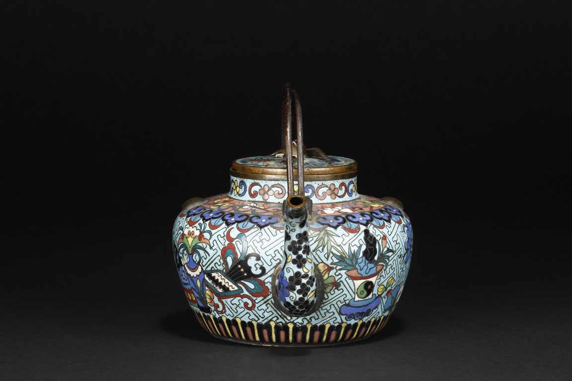 Of globular form, the wide shoulder tapers sharply to a round foot, the body decorated with lotus flowers, peaches, vases, and other auspicious items, against teal ground, between scrolling banana leaf patterns and ruyi cloud patterns, the finial in the shape of peach, below two arching metal handle bars.