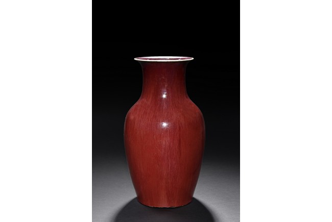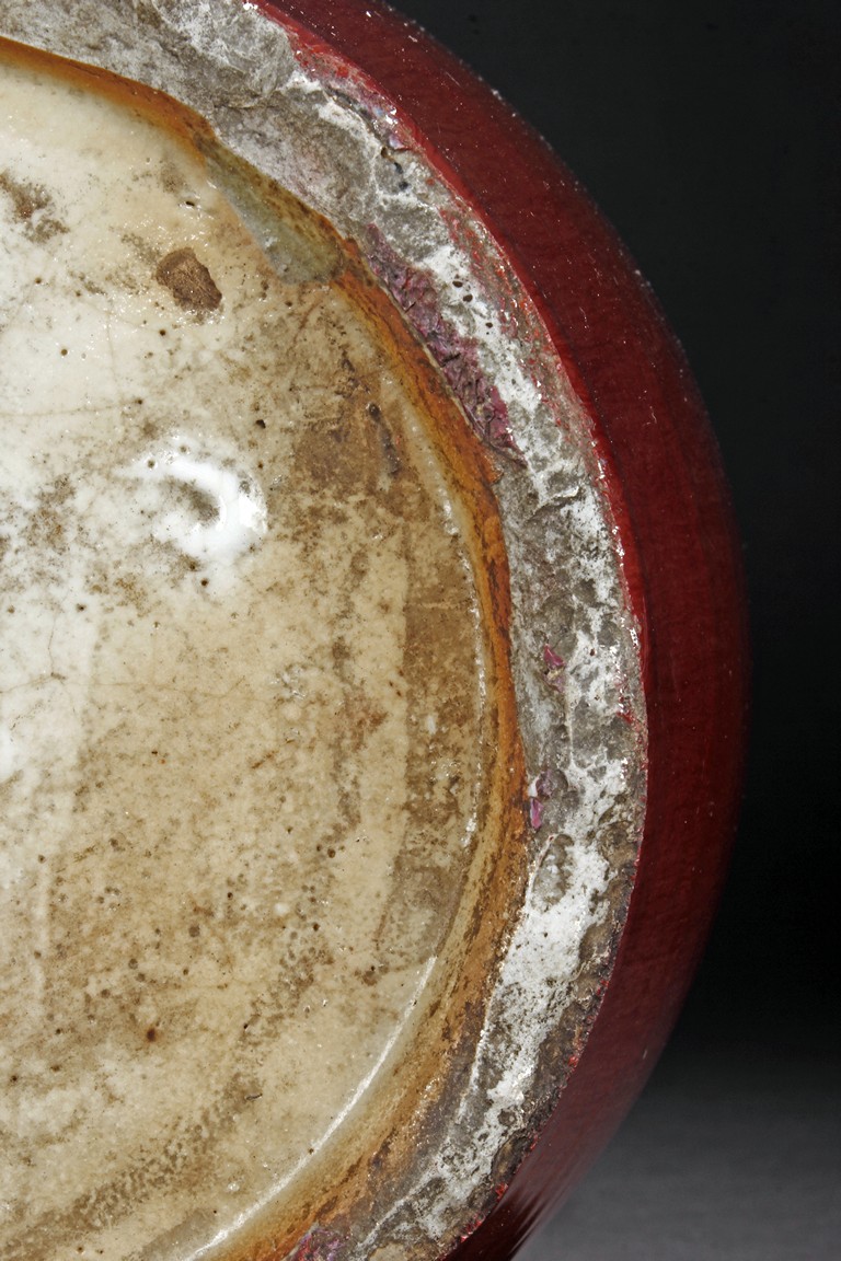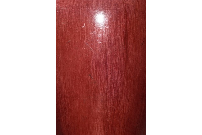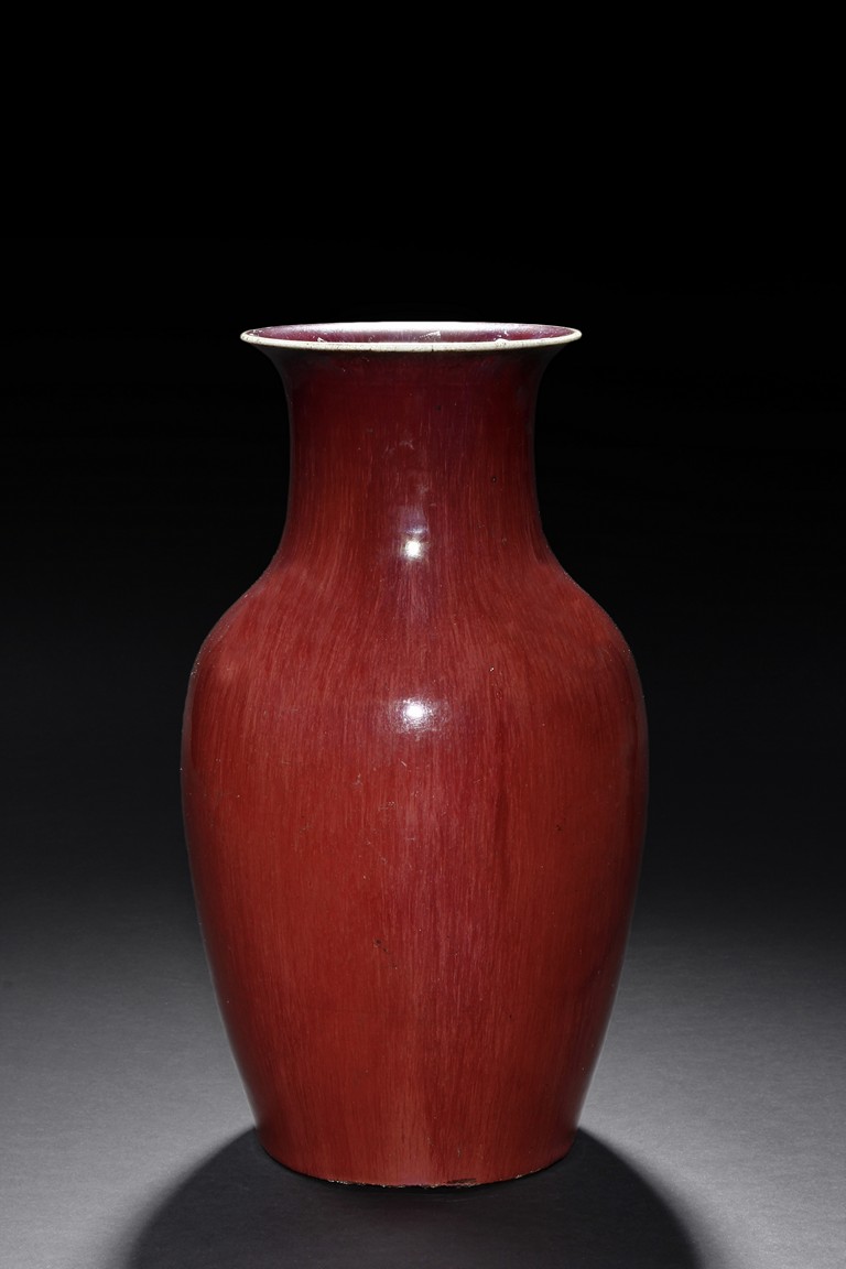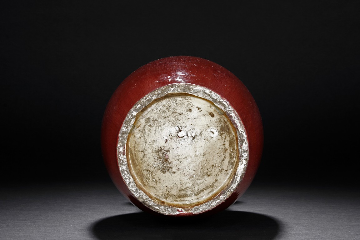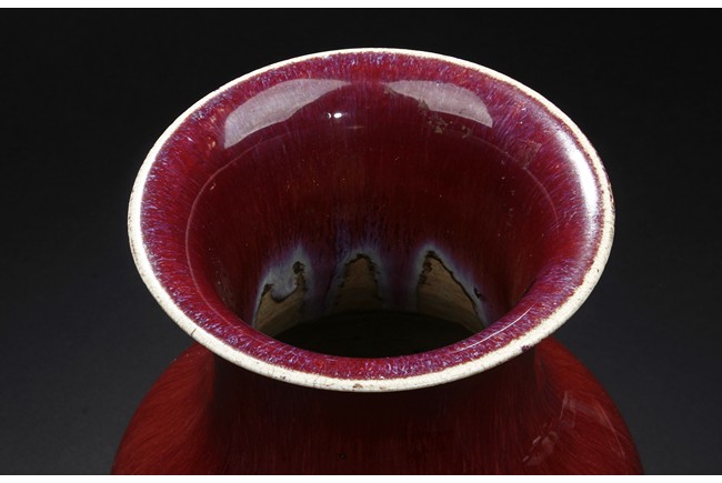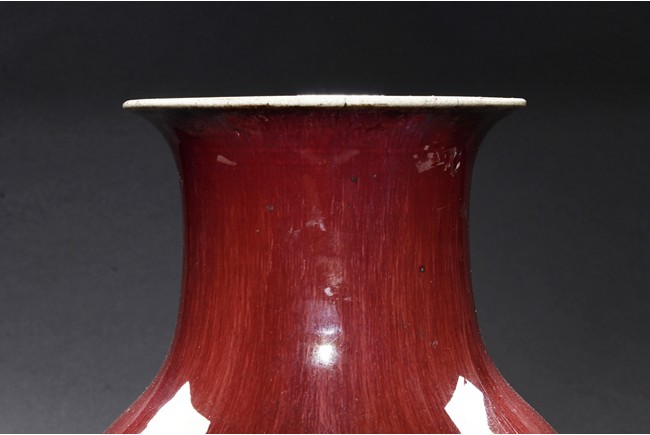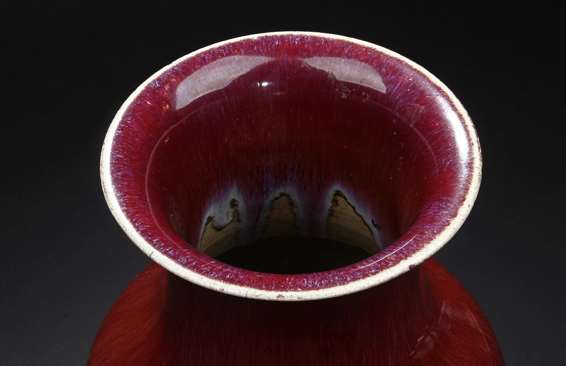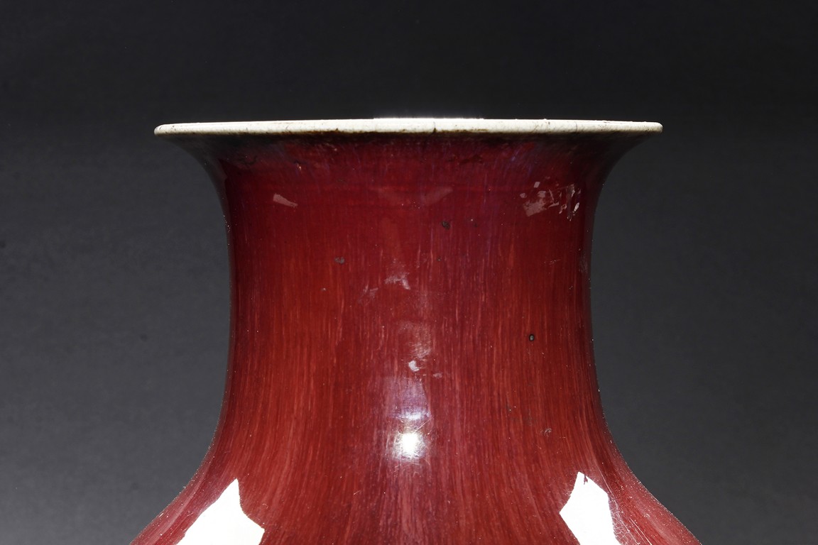 The vase is suffused overall with red glaze to the exterior and interior of the neck. The bottom is unglazed.
