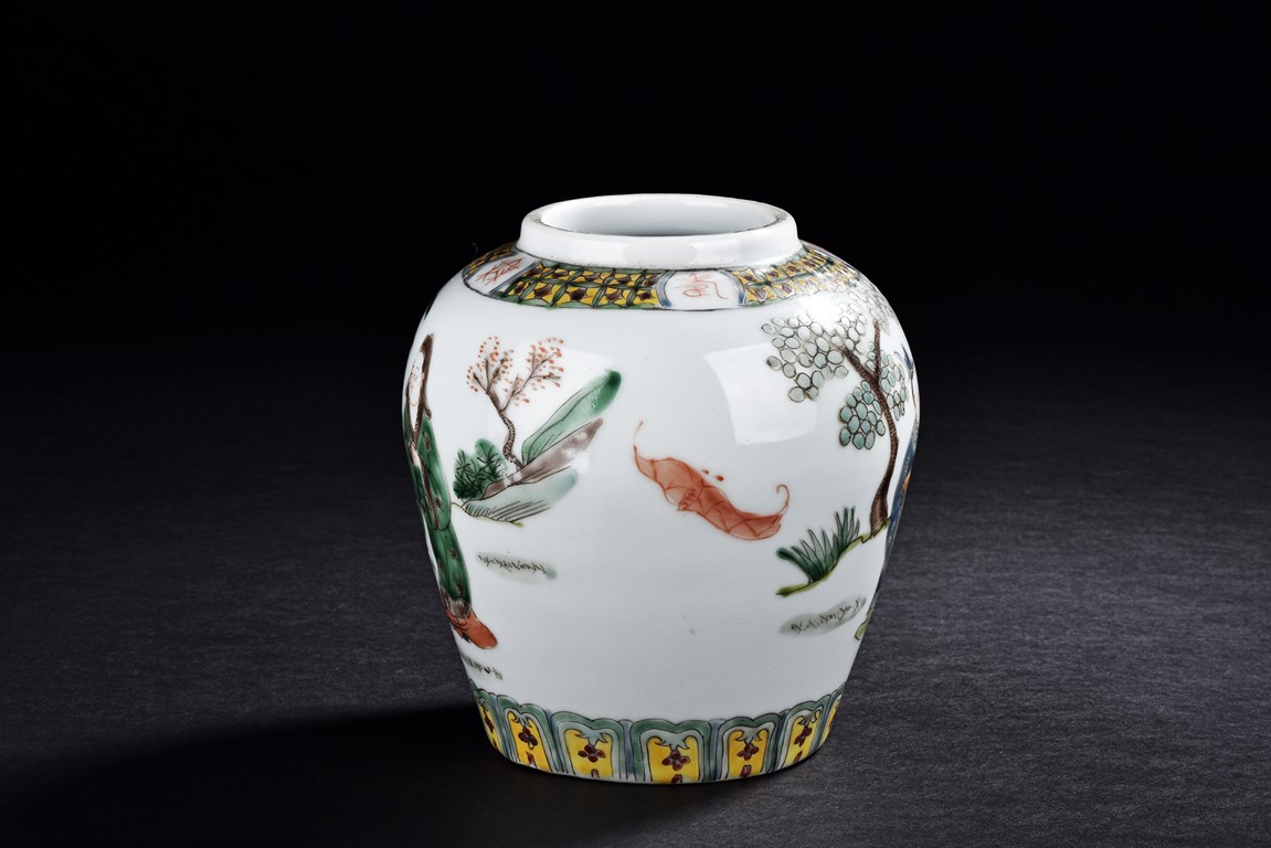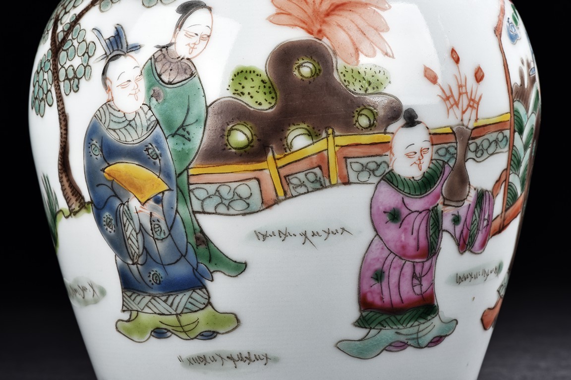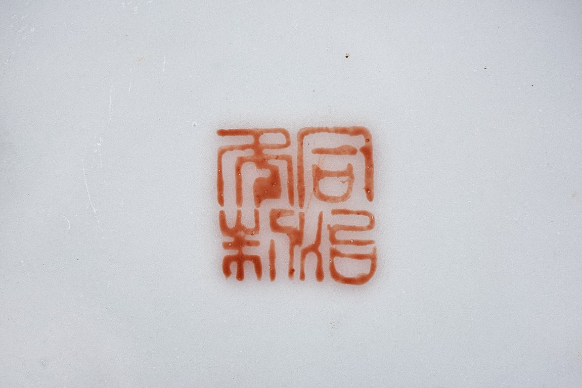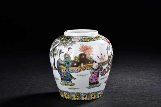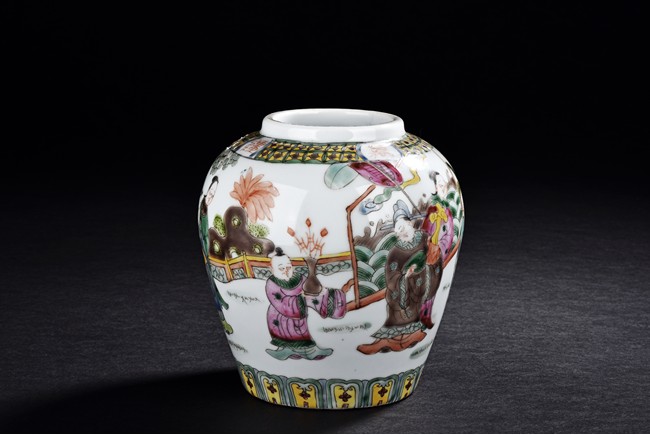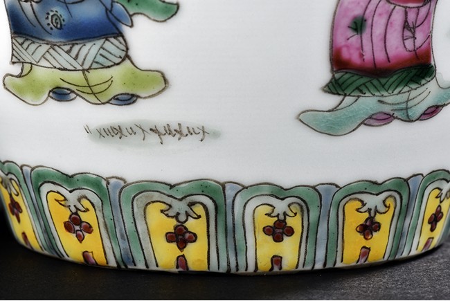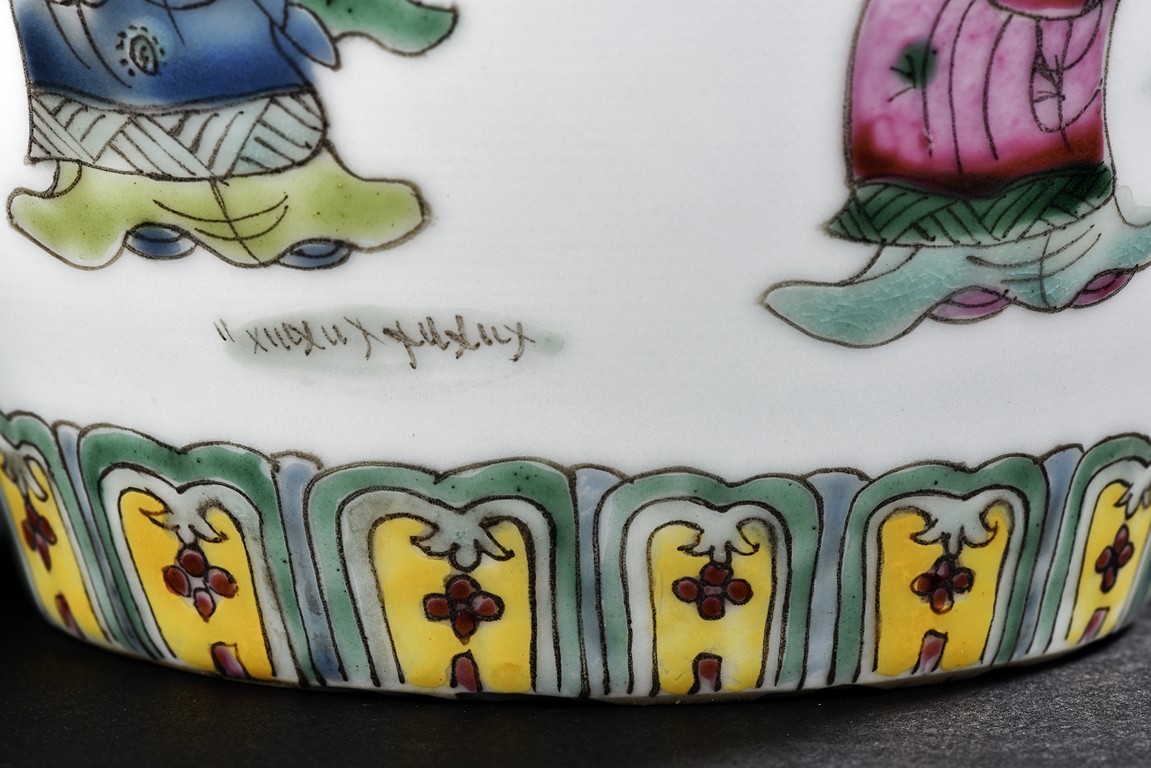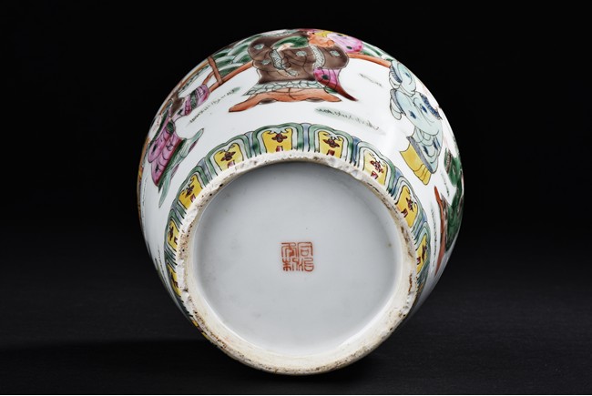 Painted around the sides with a continuous scene depicting a group of guests presenting their birthday gifts to an official, flanked a band of four character 'wan shou wu jiang' spaced by geometric pattern encircling the mouth rim, and a band of leaves around the bottom. The base with four character 'Tongzhi' mark. Qing Dynasty period.