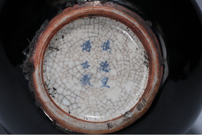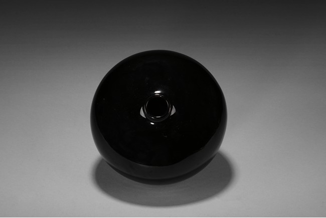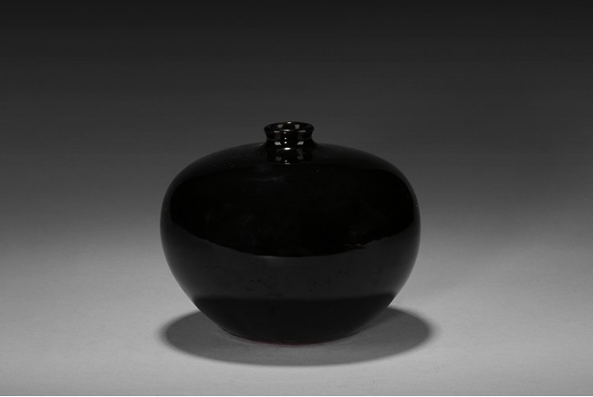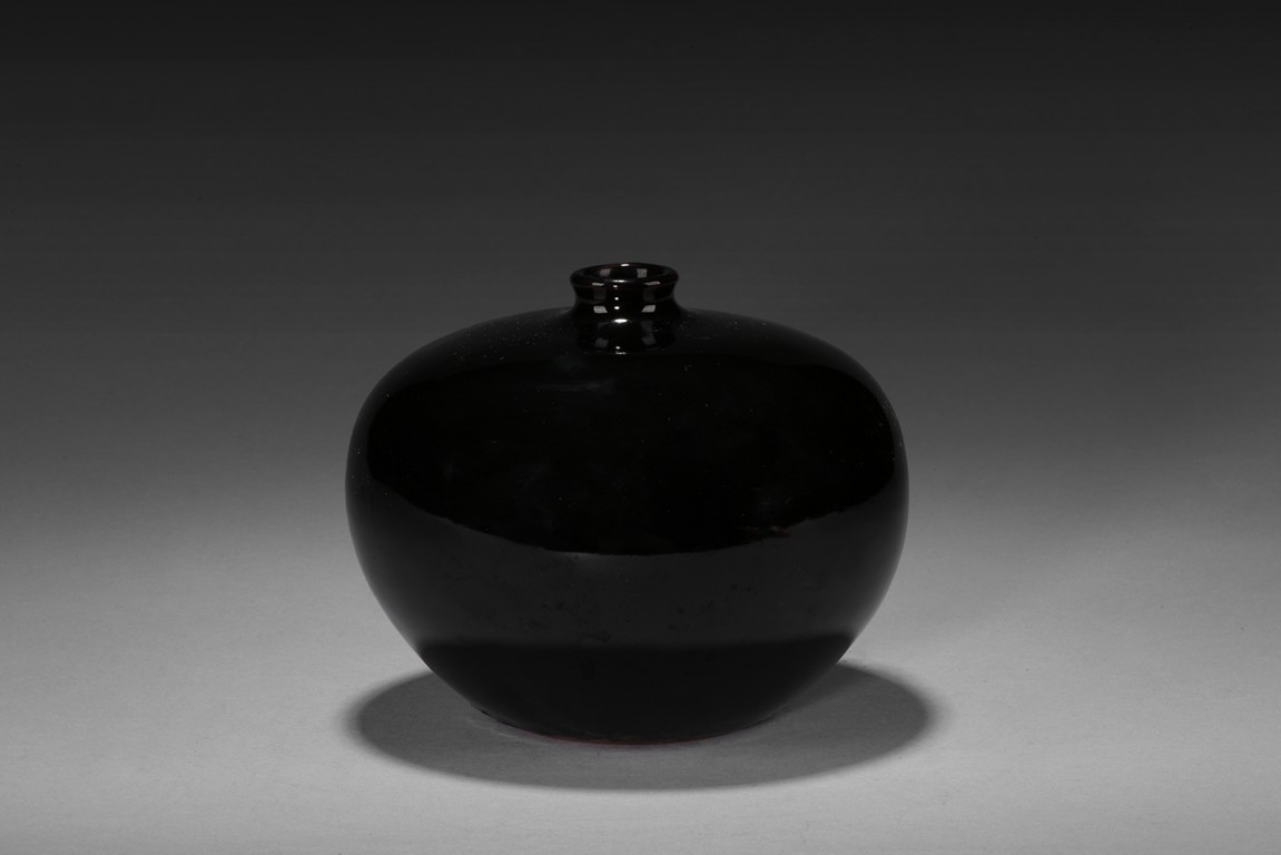 Of compressed ovoid form rising from a recessed base to a small short waisted neck, covered overall with polished black glaze tone.