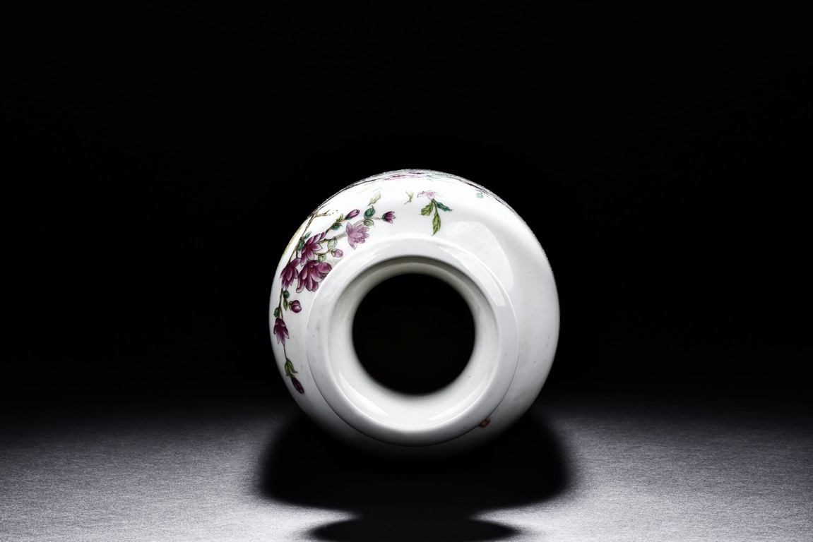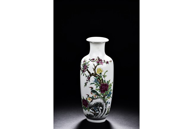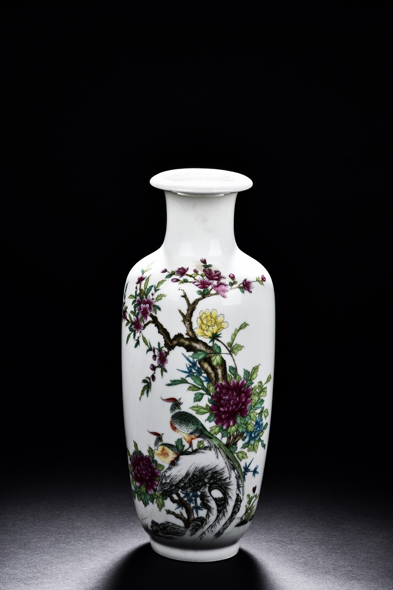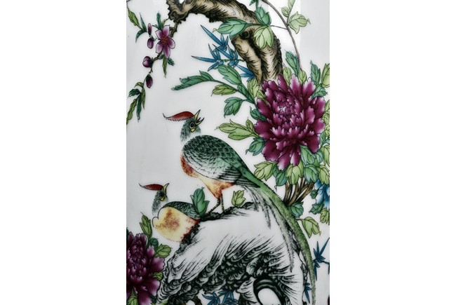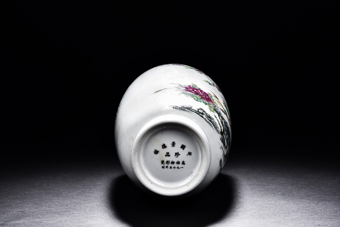Decorated with two birds sitting upon a branch with blossoming flowers issuing from rockwork, the bottom with Jingdezhen mark dated to year of 1975.