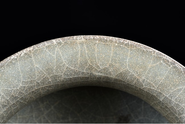 The compressed body raised on three conical supports, with a straight neck rising to flat everted rim, the body with fine crackle and pale celadon tone.