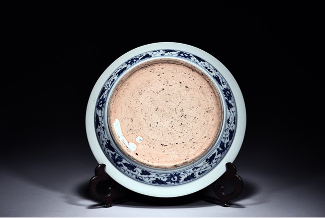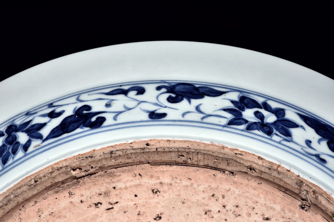 The dish is finely painted in deep cobalt blue to the center with a scene comprising banana leaves issuing from the rock base, with further decoration of bamboo and scrolling morning glory pattern above, encircled by floral scrolls and outermost further decorated with repeated rhombus motif. The bottom unglazed.