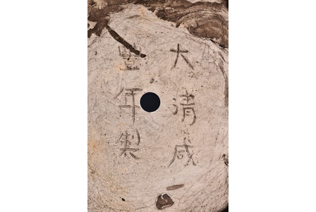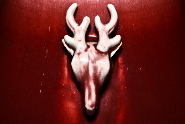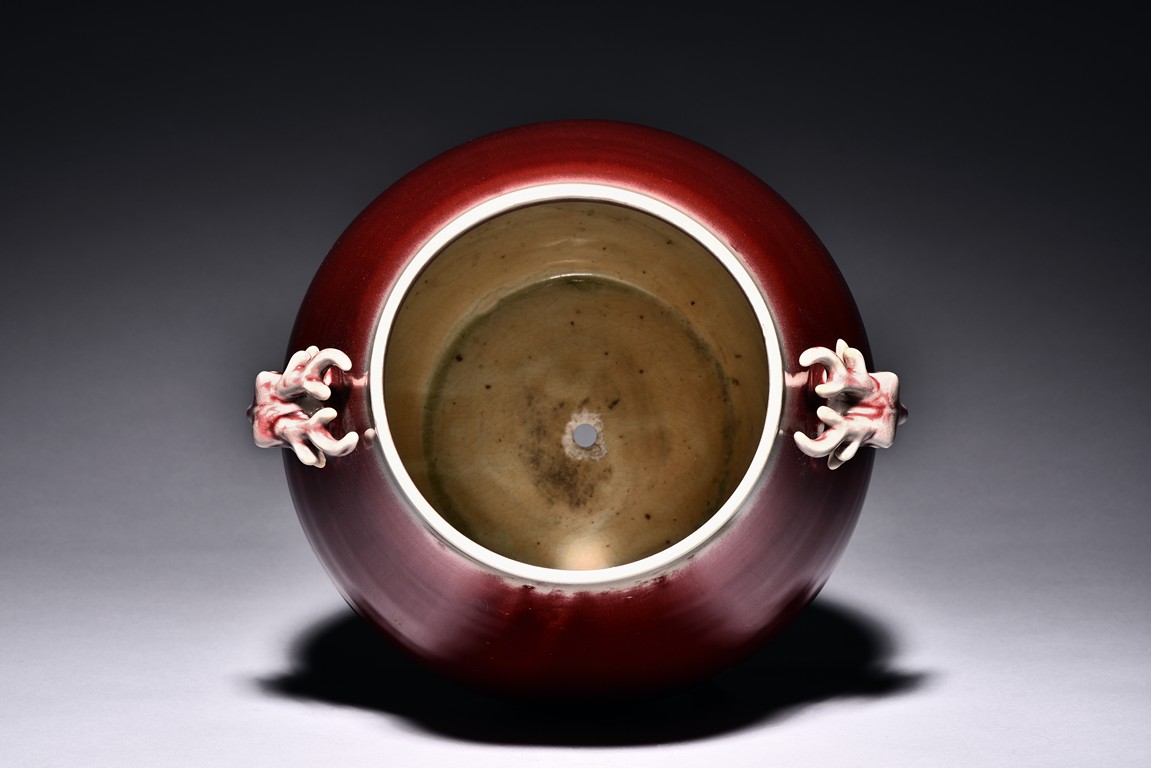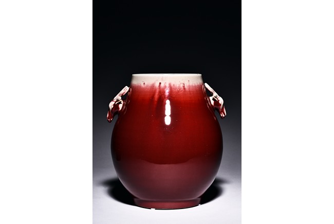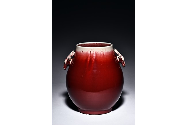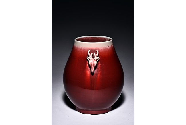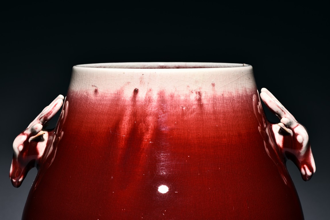 Of archaistic hu form, the body raises from a circular foot and rises to the neck flanked by two deer-head handles, the exterior covered with evenly deep red glaze and thinning towards the mouth rim. The bottom incised with six character 'XIANFENG' mark. Qing Dynasty period.