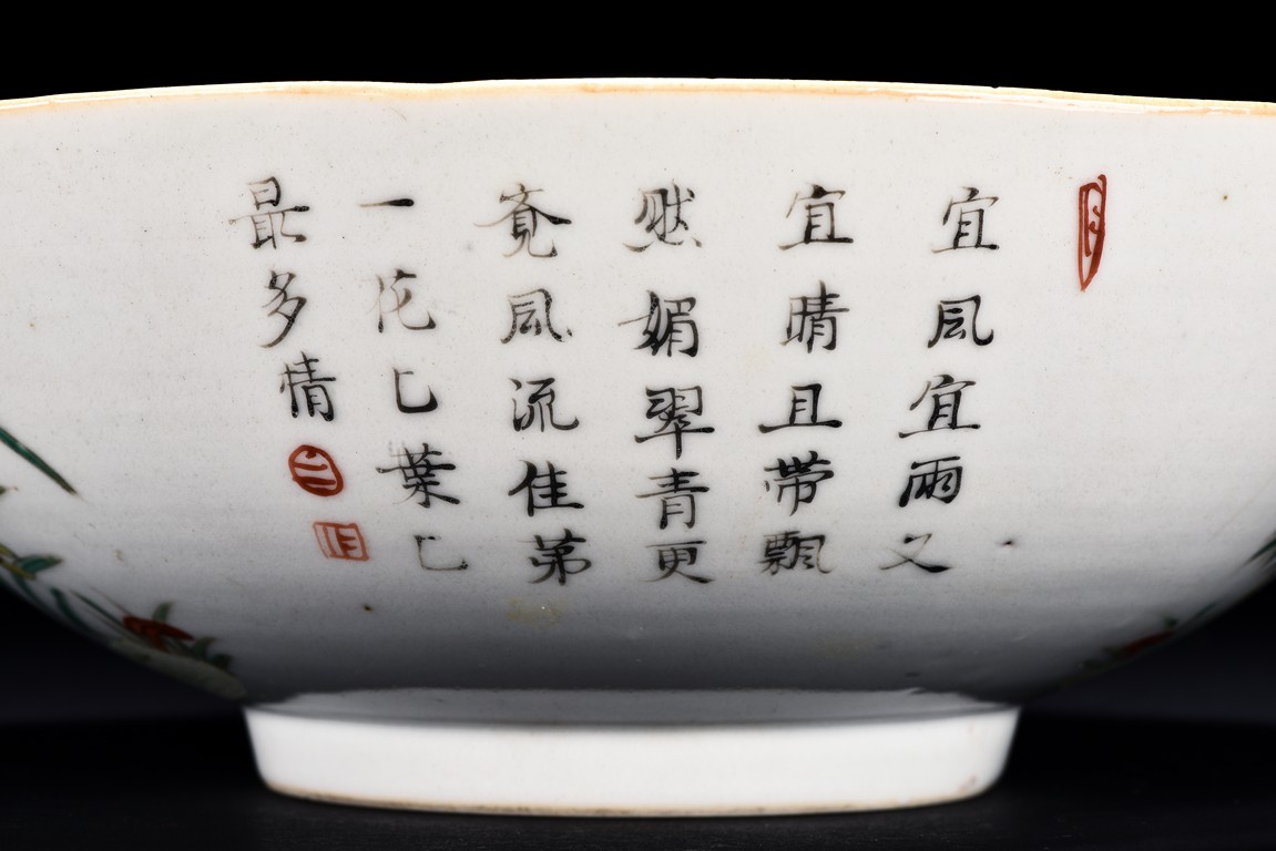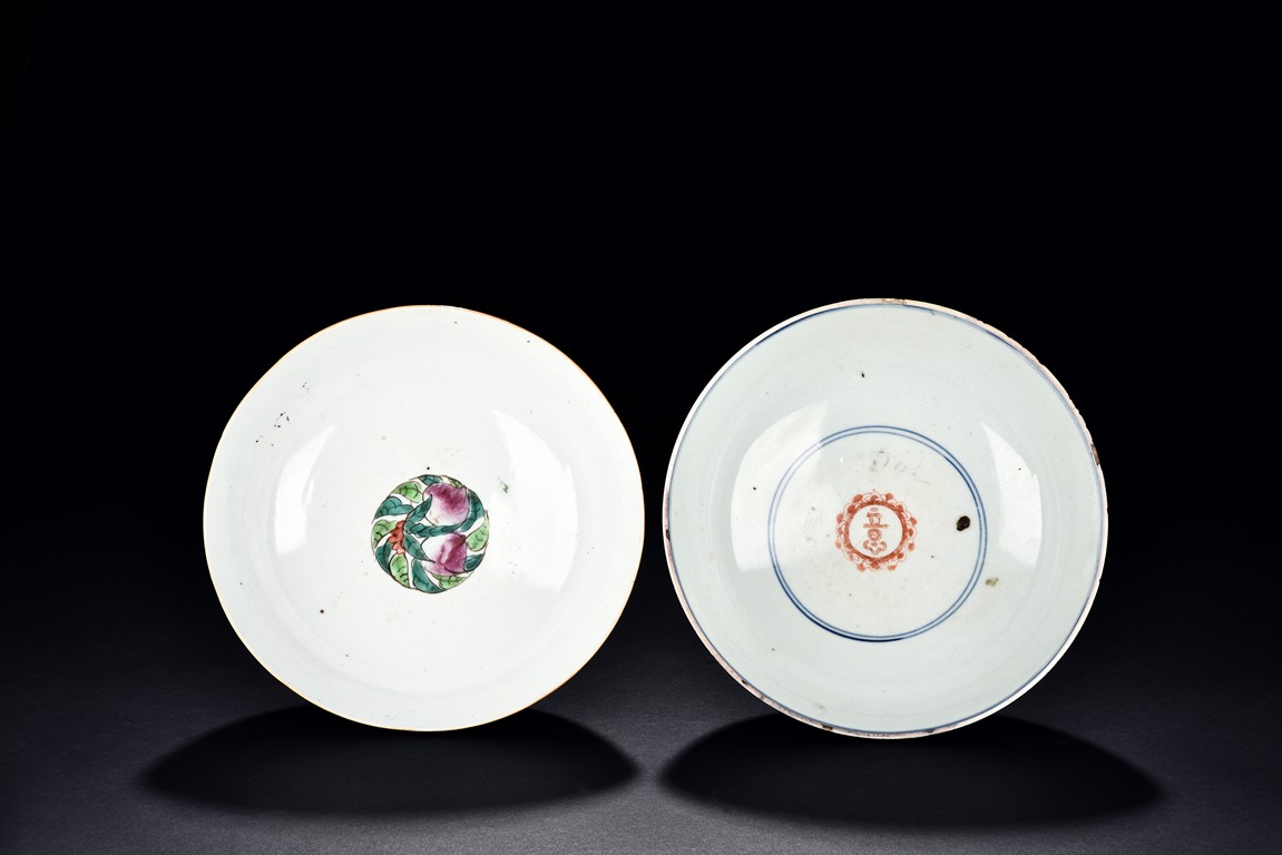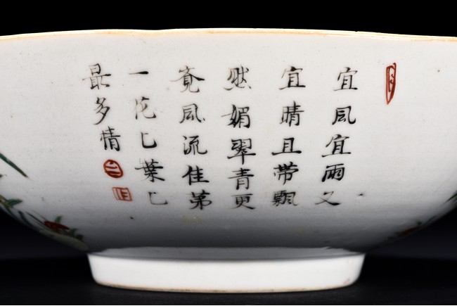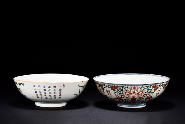 Including one bowl painted with four character Ji Xiang Ru Yi interspersed with scrolling floral pattern, bottom with dynasty mark, the other with poems and bamboo, orchid, bottom with pictograph mark. Republic period.