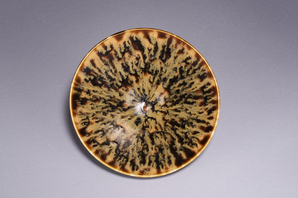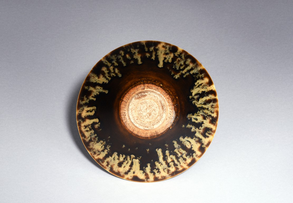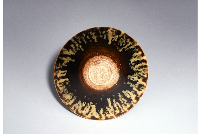 Potted with conical sides rising towards rim, it is overall covered with a rich dark brown glaze splashed in translucent brown yellow glaze in style of tortoiseshell, ending short of the foot to expose the unglazed foot ring. Song Dynasty period.