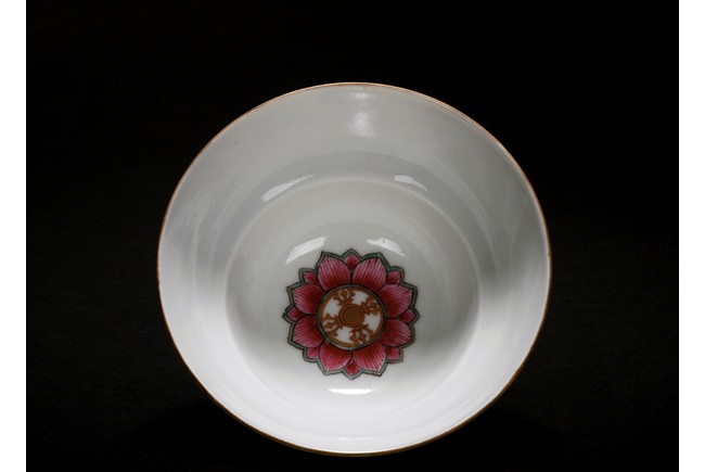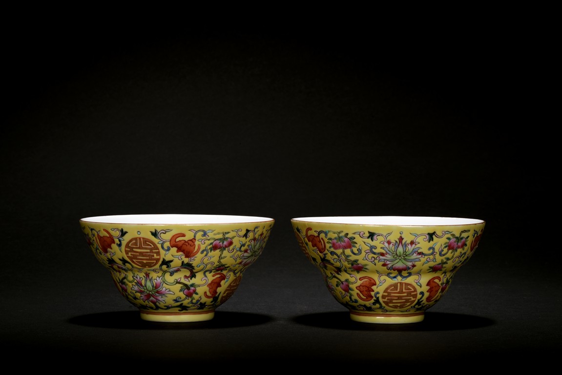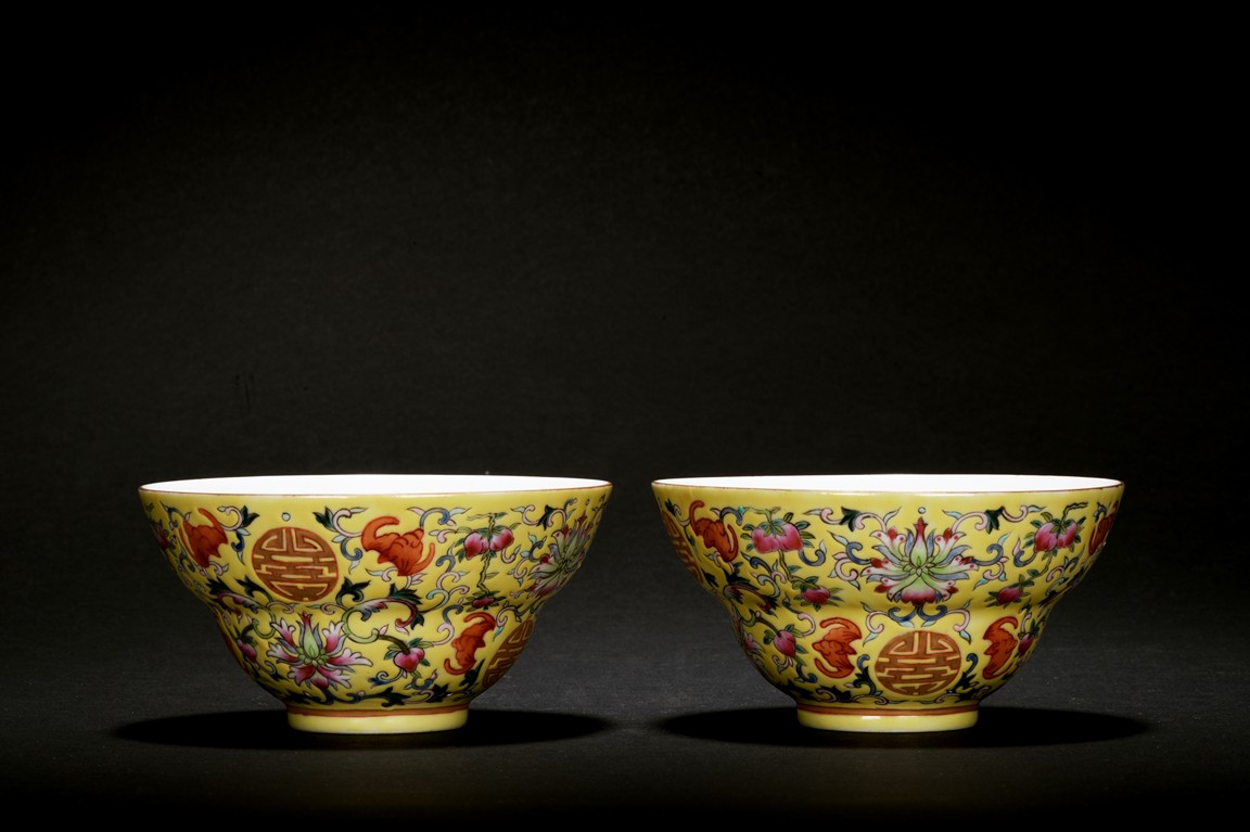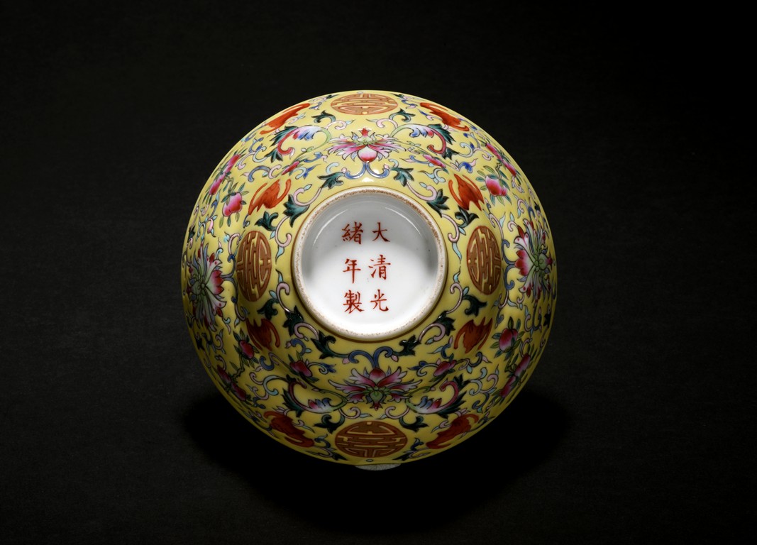 Enamelled on the exterior with gilt shou medallions each flanked by two iron-red bats, the medallions divided by auspicious lotus between two pairs of peaches above and below, all reserved on a rich yellow-ground, the interior decorated with a vajra motif within a circle surrounded by lotus flower petals. The base with six character 'GUANGXU' mark. Republic period.