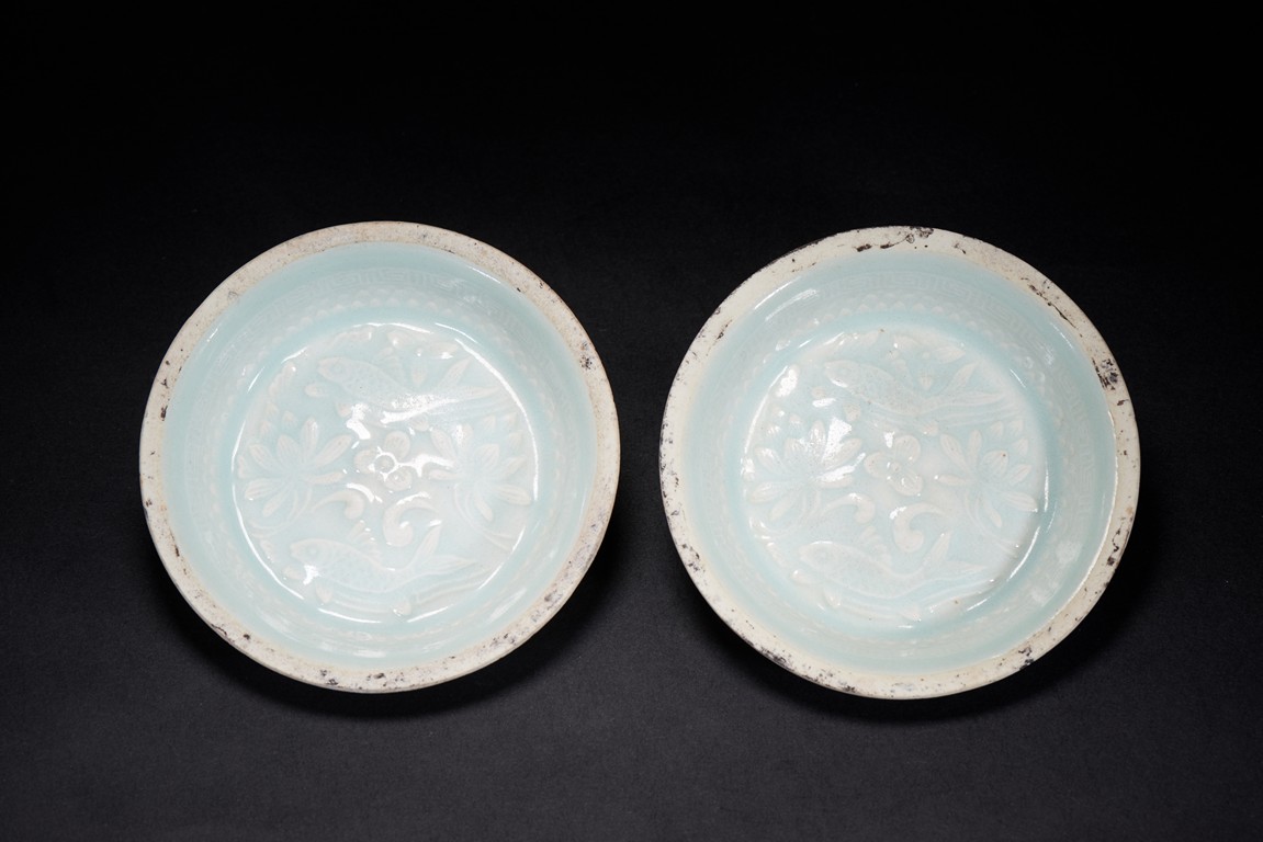 Each dish moulded with twin fishes and floral pattern.