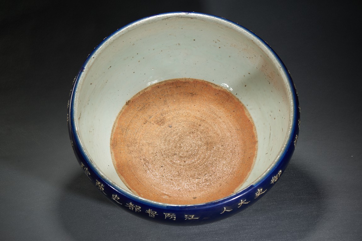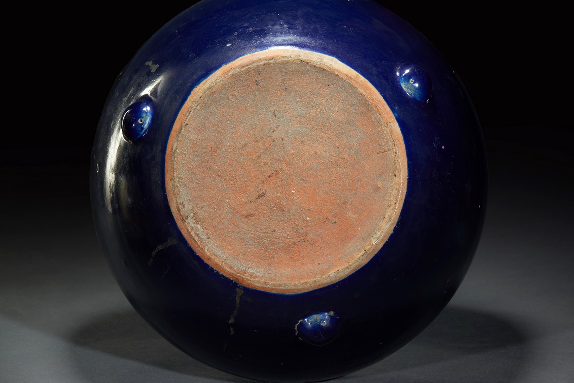 With rounded sides, the jar is finely covered in rich blue glaze to the exterior, moulded around the rim with inscription describing the date it was made and name and rank of the commissioner, with three raised knobs above base. Ming Dynasty period.