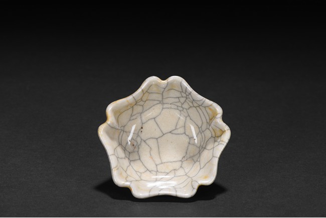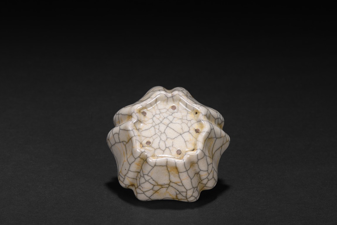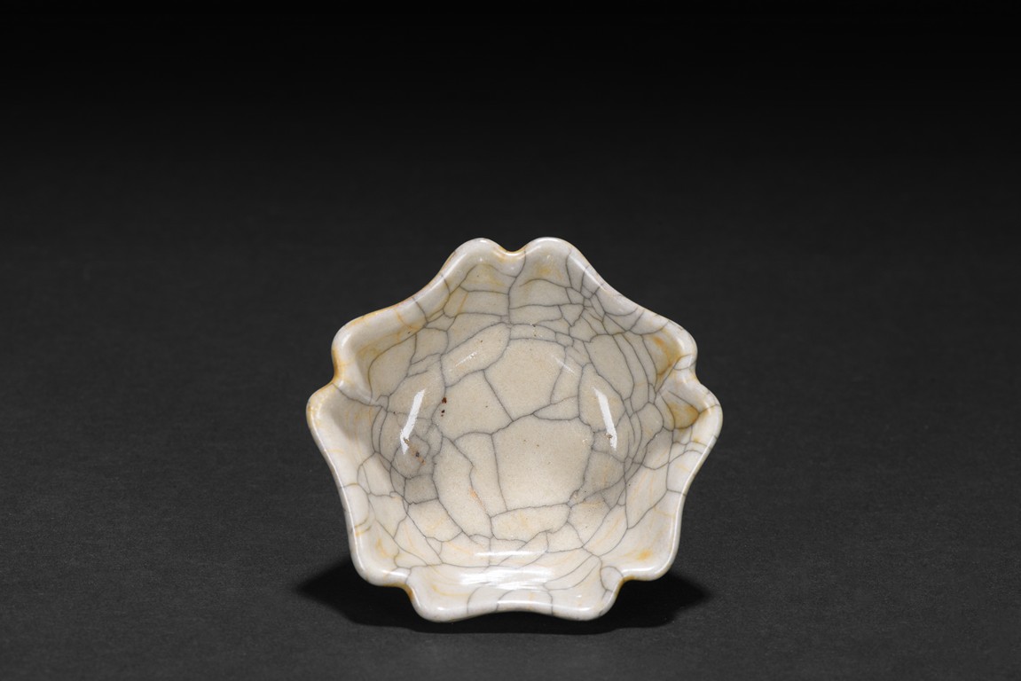 Of lobed form, overall covered with a glaze of bone-white infused with fine gold and black crackles, the base with five spur marks. Ming Dynasty period.