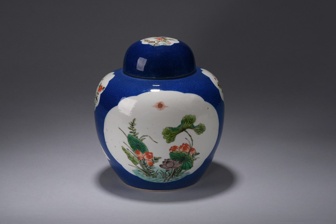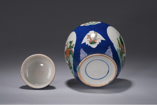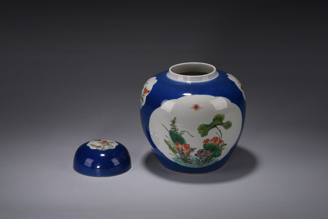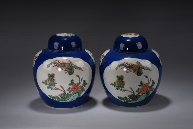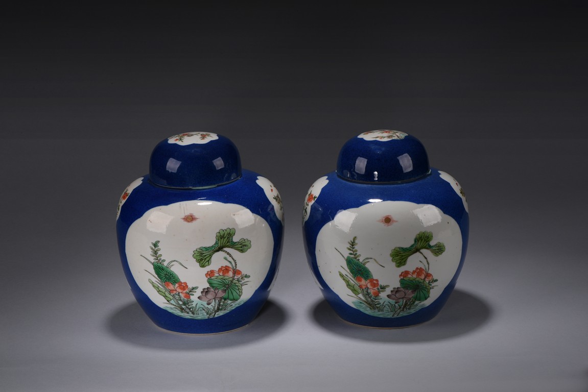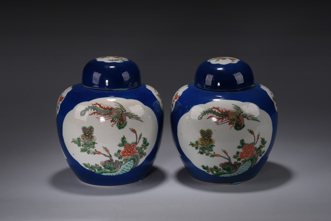 Each of the rounded body tapering to spreading foot, surmounted by a short neck with rounded cover, the front decorated a red and green phoenix flying upon the peony branches enclosed by the white petal-shaped ground, the reverse finely depicting a lotus pond, on the right and left side finely decorated two small white patterns enclosed peony shrubs, all the white ground patterns against the dark blue ground. The base of the jar with a blue double-circle.