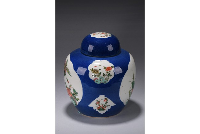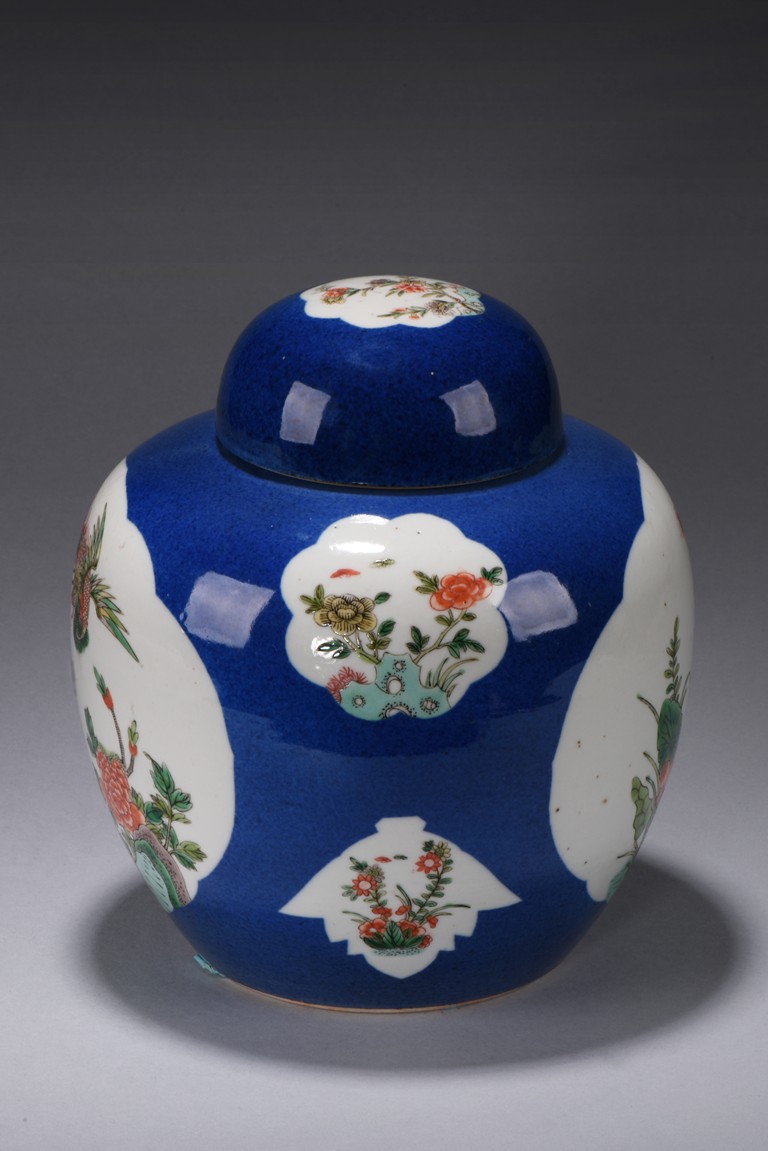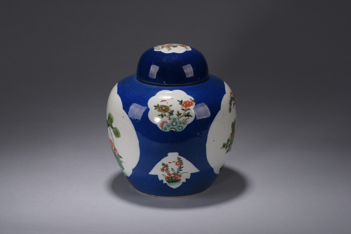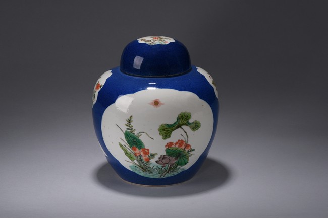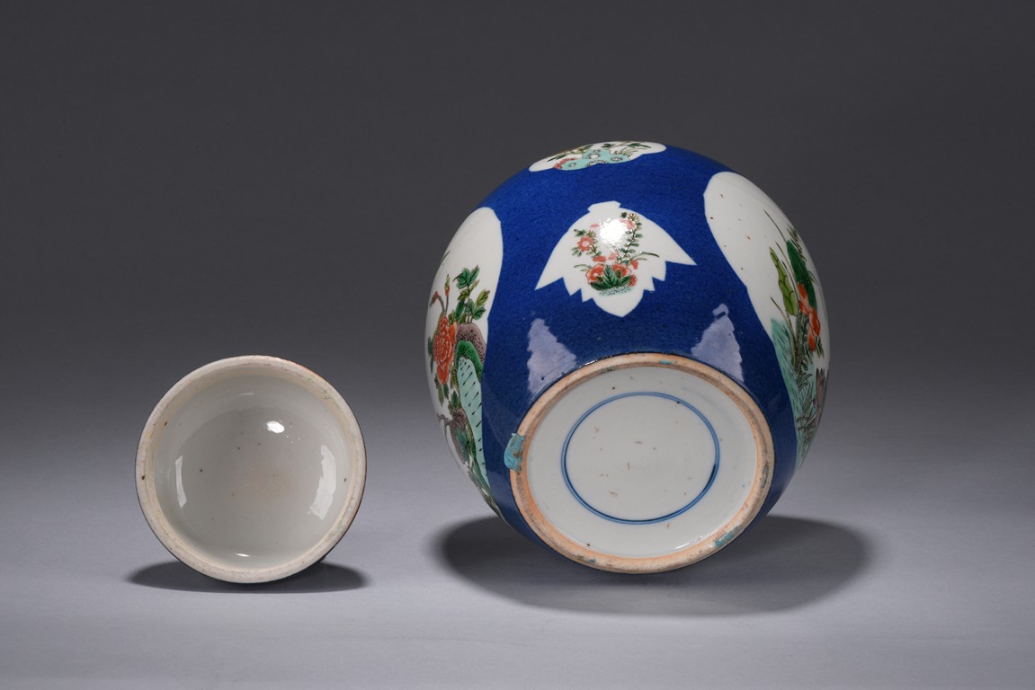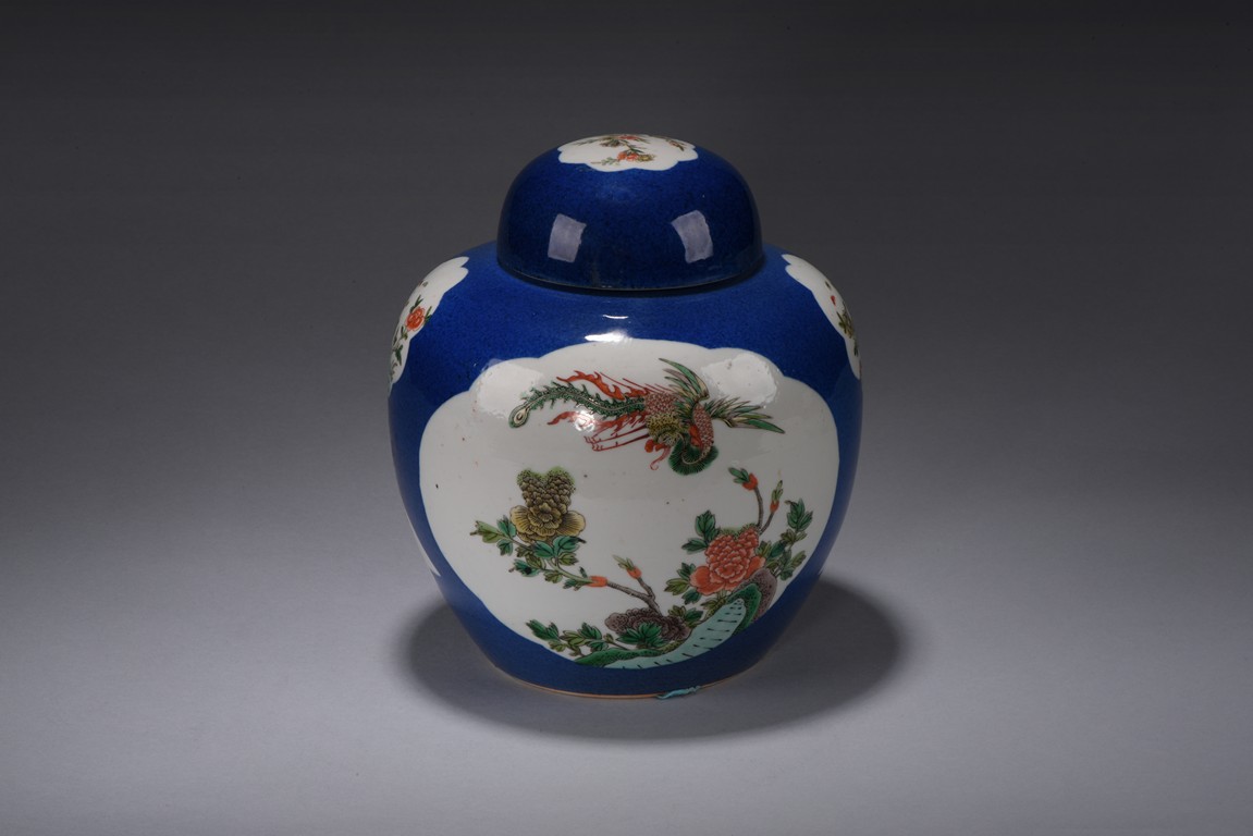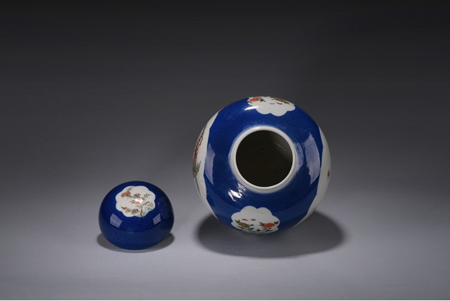 Each of the rounded body tapering to spreading foot, surmounted by a short neck with rounded cover, the front decorated a red and green phoenix flying upon the peony branches enclosed by the white petal-shaped ground, the reverse finely depicting a lotus pond, on the right and left side finely decorated two small white patterns enclosed peony shrubs, all the white ground patterns against the dark blue ground. The base of the jar with a blue double-circle.