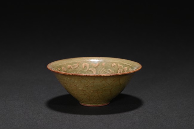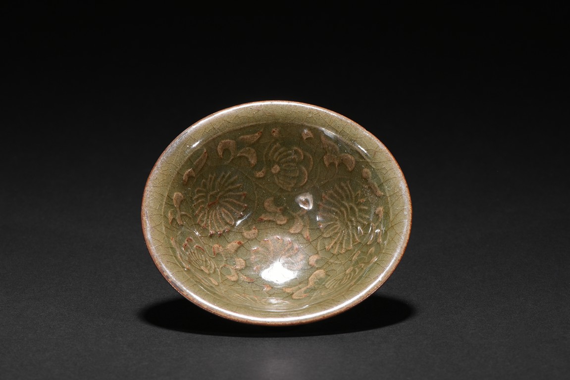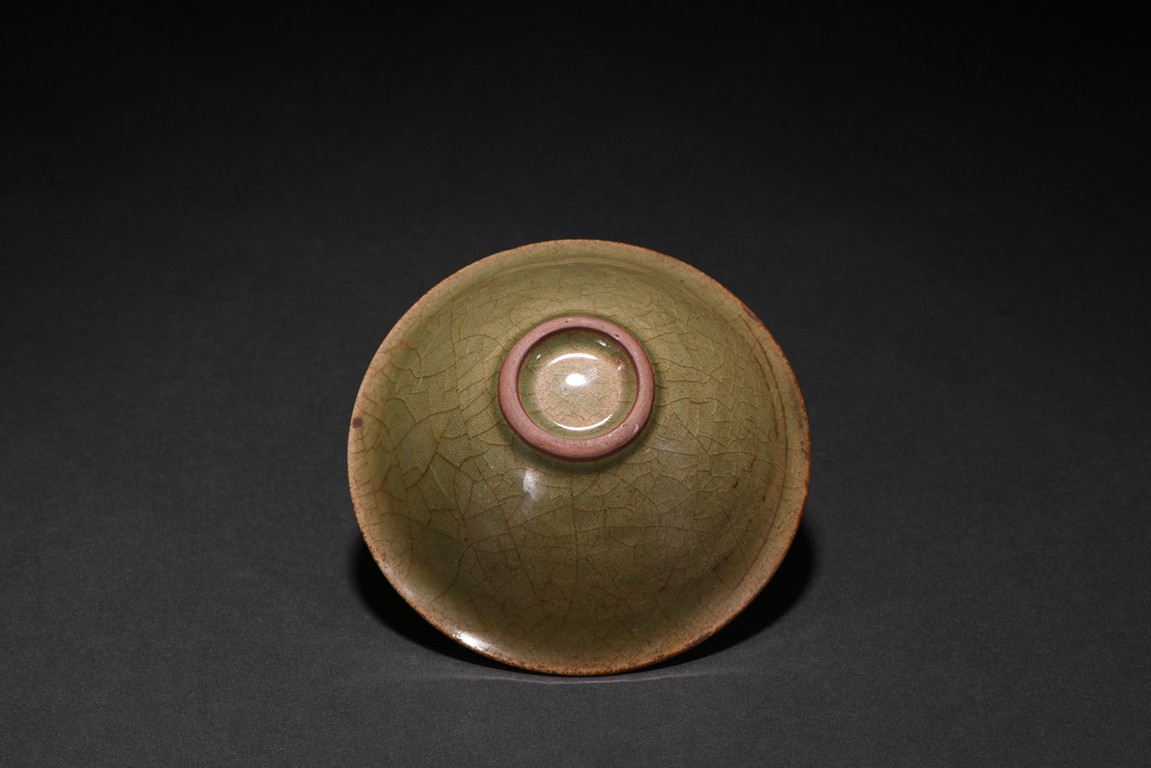 Well potted with shallow conical sides rising from a short foot to a flared rim, covered overall with celadon glaze suffused with a dense network of russet crackles throughout pooling around the outer mouth rim and the extremities on the interior, the interior covered overall of finely floral and scrolled foliate pattern.