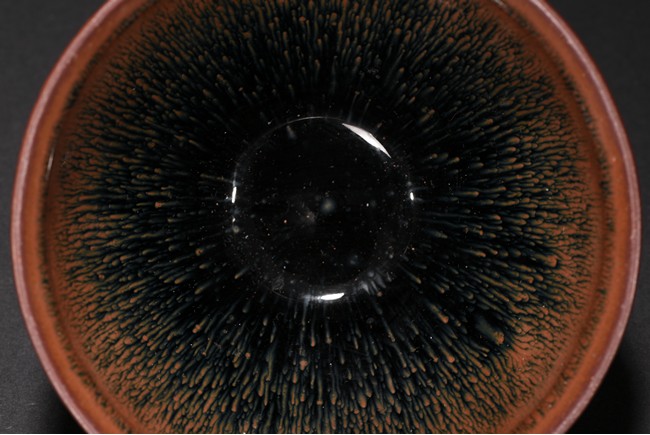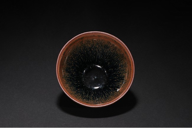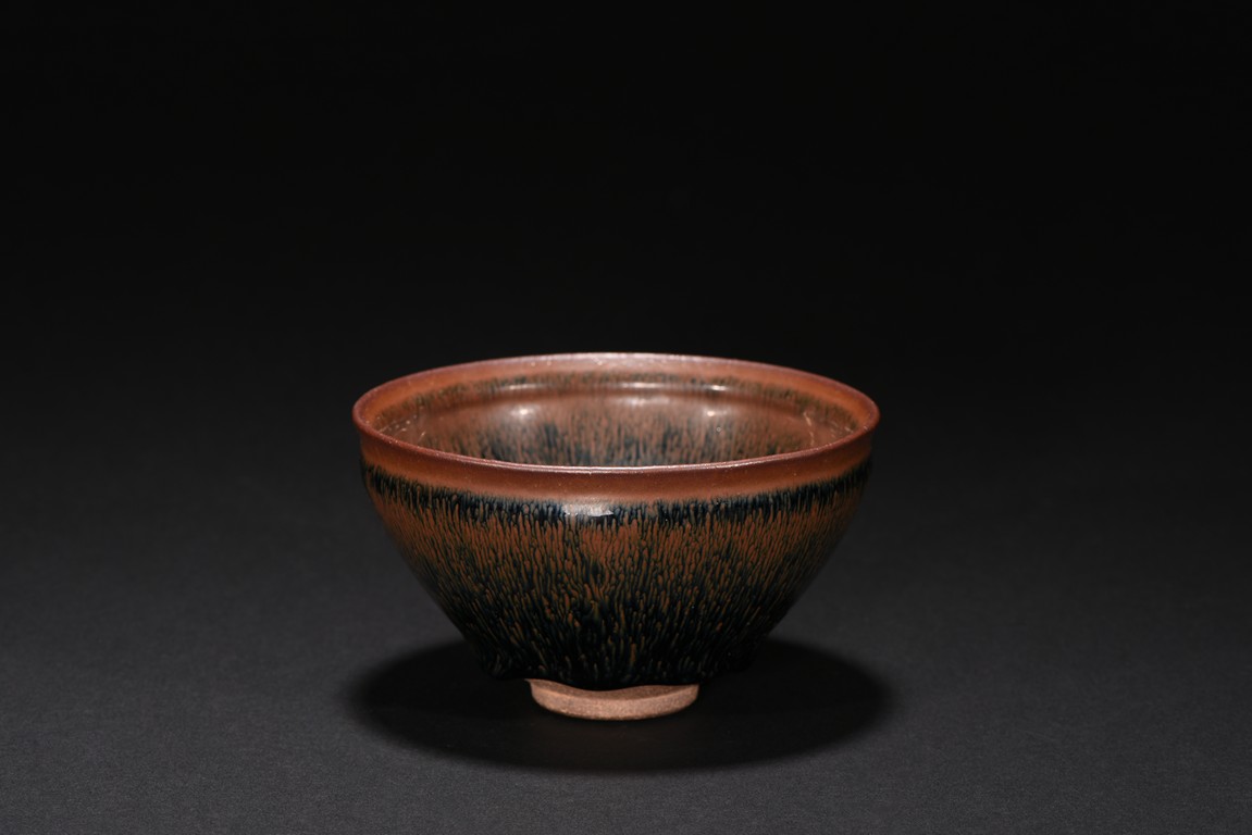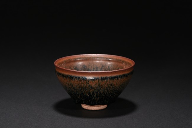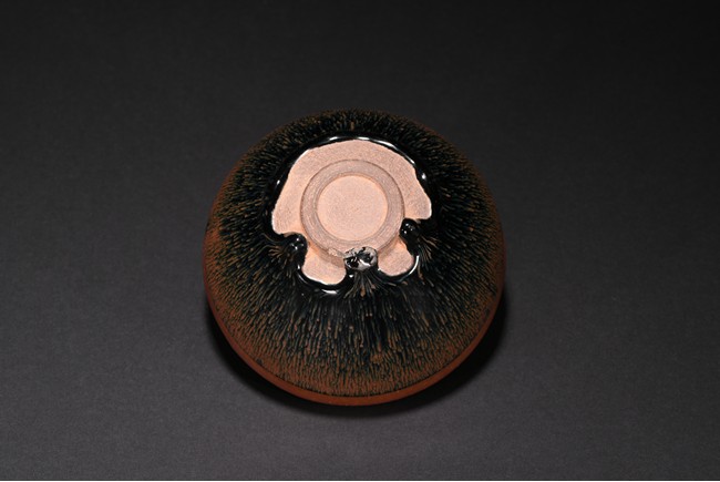The deep rounded sides rising from a short straight foot to a lipped rim, covered overall in a black glaze with cascading reddish-brown streaks and falling short of the foot to reveal the brown body.