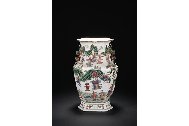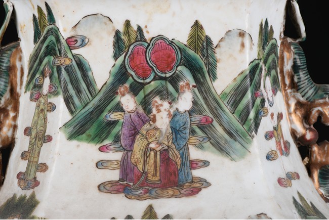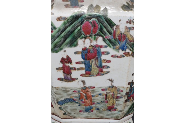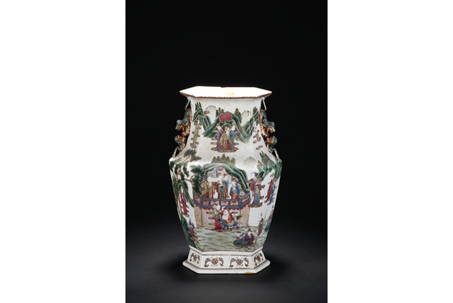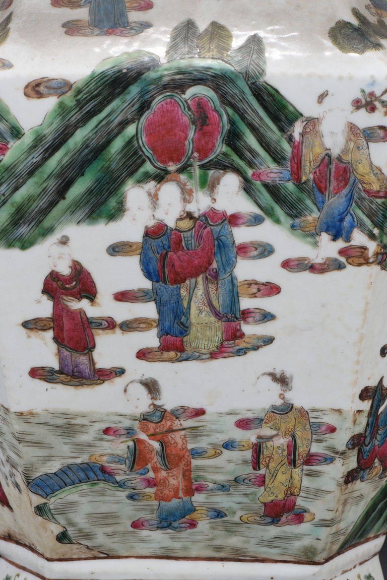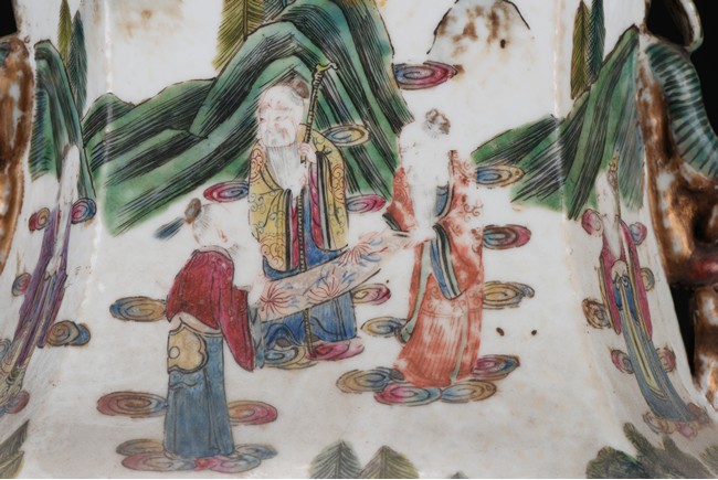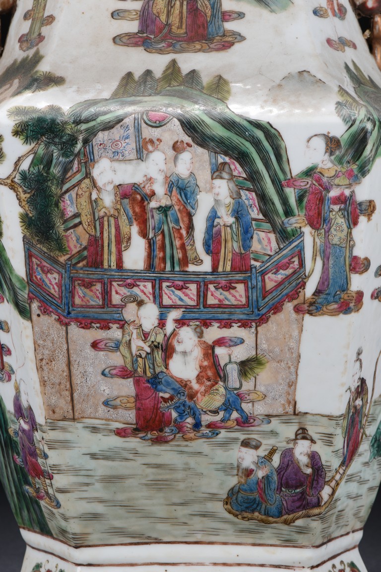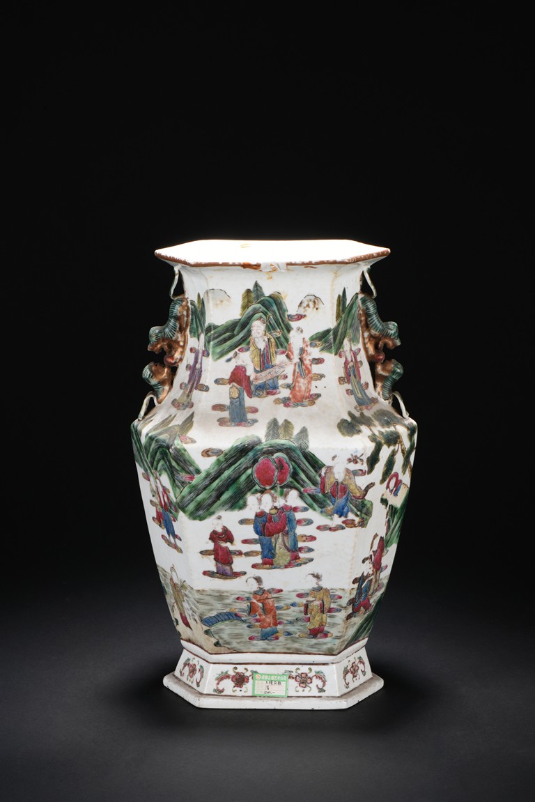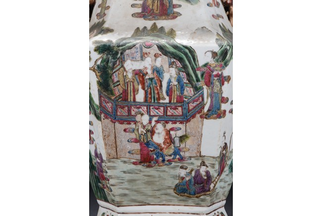 Of hexagonal form, the well-proportioned hexagonal body supported on a splayed foot, the body brightly enamelled with various figures greeting scene among the mountain setting and gently tapering at the angular shoulders to a tall trumpet neck flanked by a pair of confronting cast lions on each side as handles.