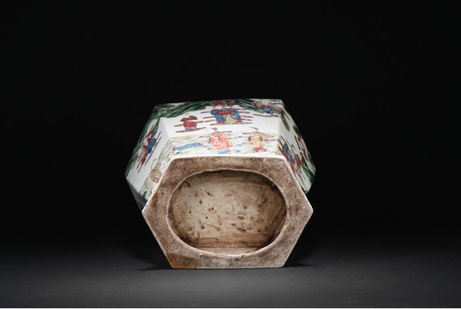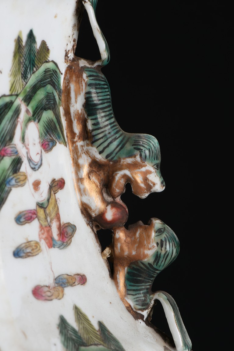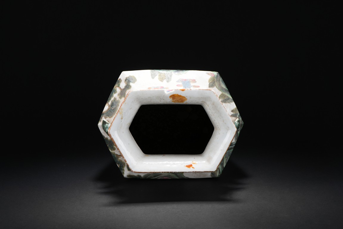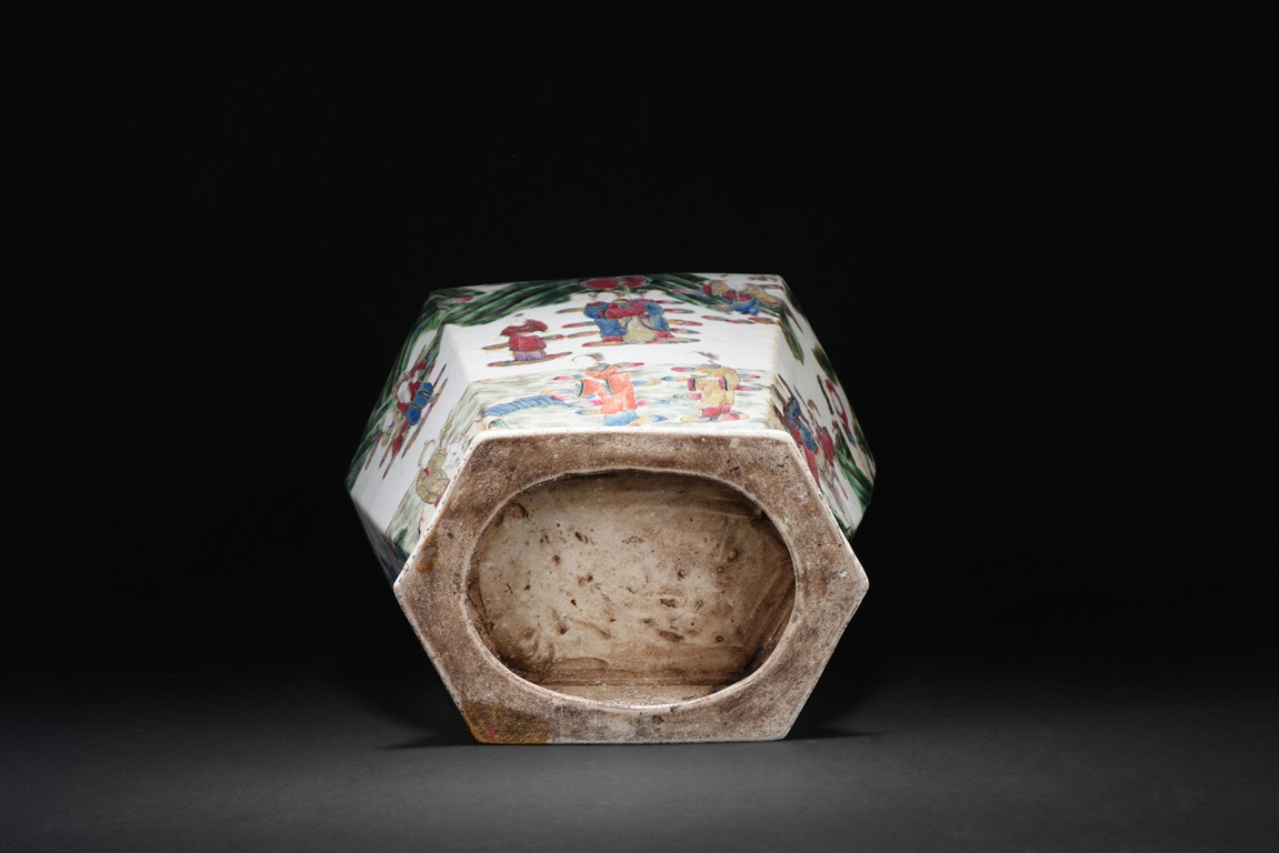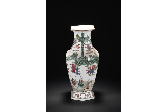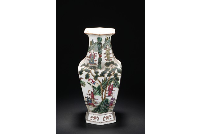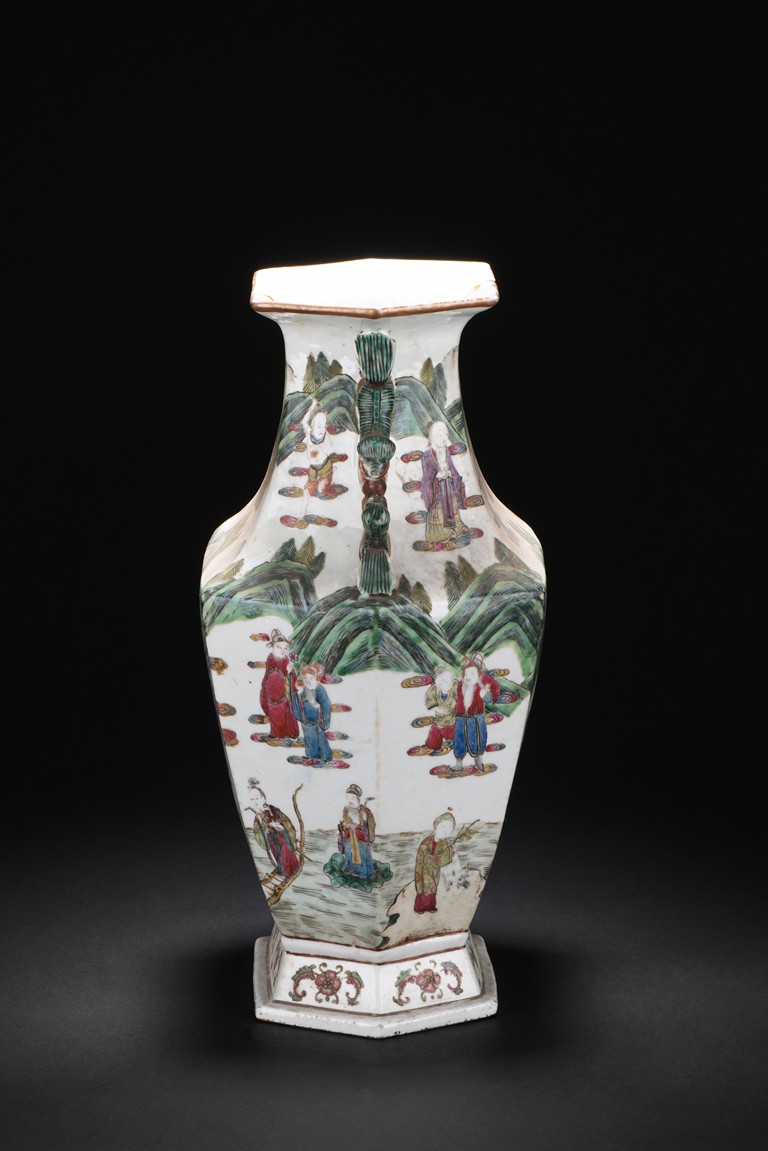 Of hexagonal form, the well-proportioned hexagonal body supported on a splayed foot, the body brightly enamelled with various figures greeting scene among the mountain setting and gently tapering at the angular shoulders to a tall trumpet neck flanked by a pair of confronting cast lions on each side as handles.