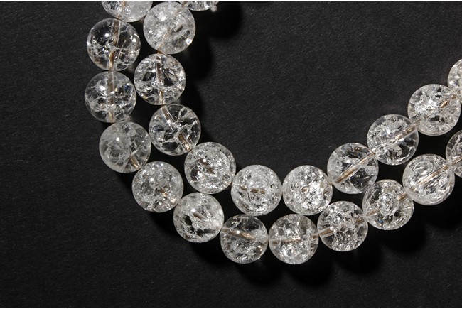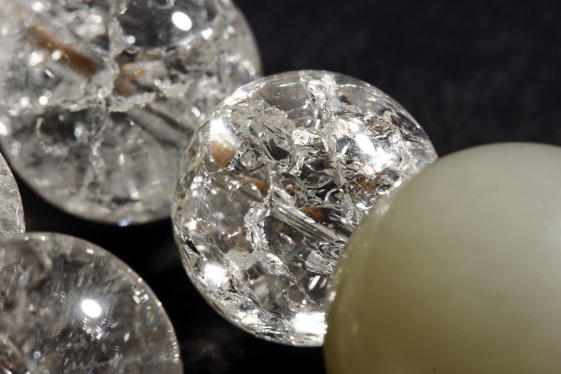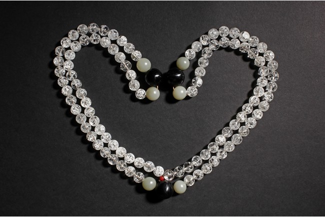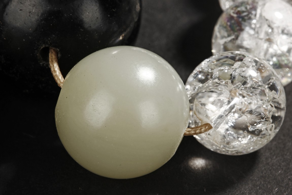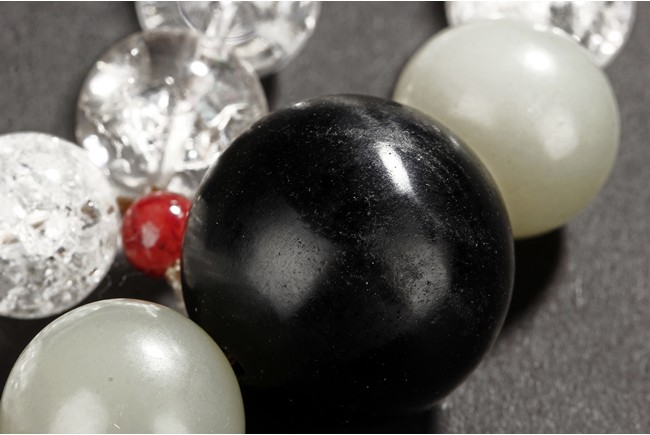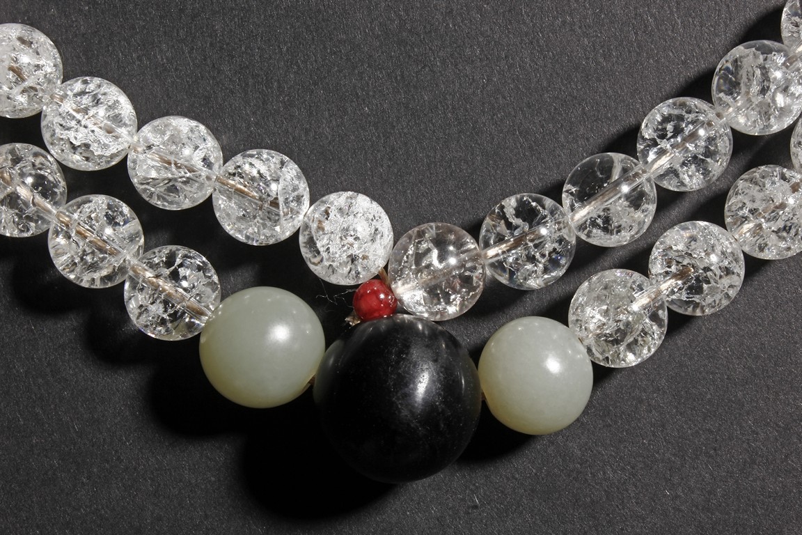 The transparent crystal rounded beads divided by three fotou('Buddha bead') beads of black tone and each flanked by two greenish-white smaller rounded jade beads,