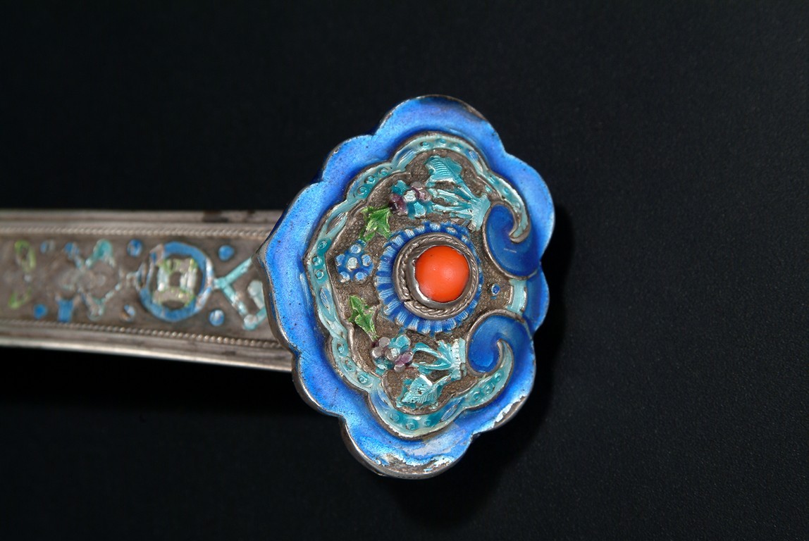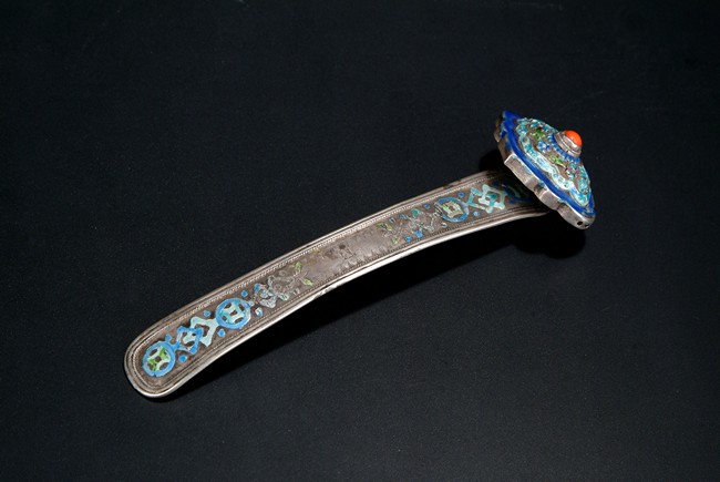 The head and handle are of separate parts, handle depicts fortune patterns, while head depicts cloud, flowers and plants, decorated with a coral. Some loss of color on the handle. Qing Dynasty period.