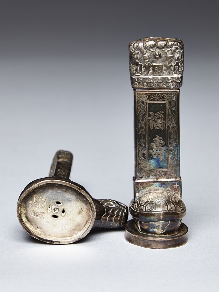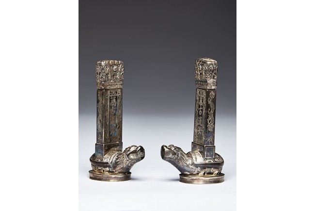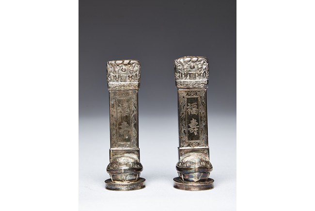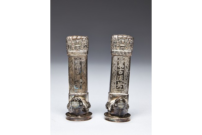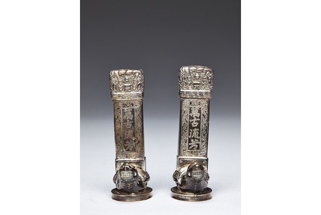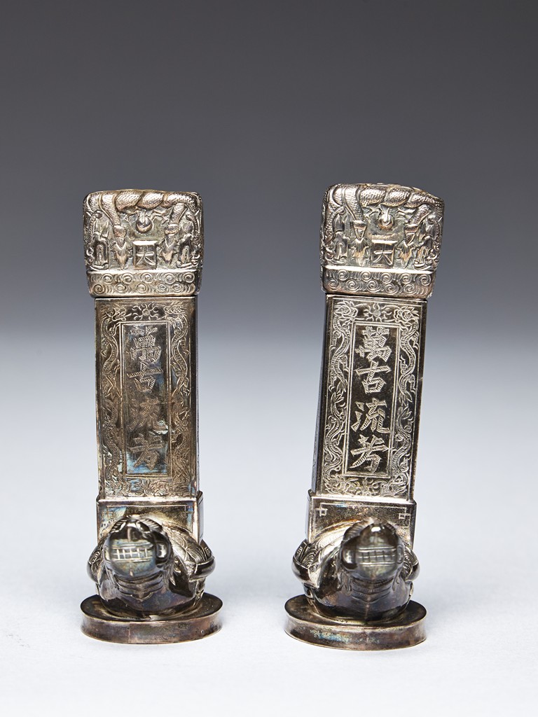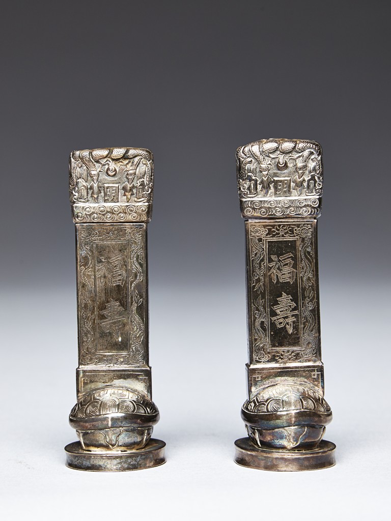 A PAIR OF SILVER TURTLE SUPPORTED STELES    民國 銀龜托碑一對