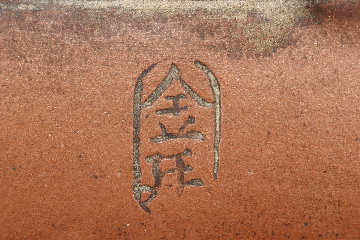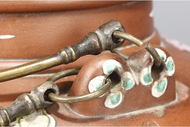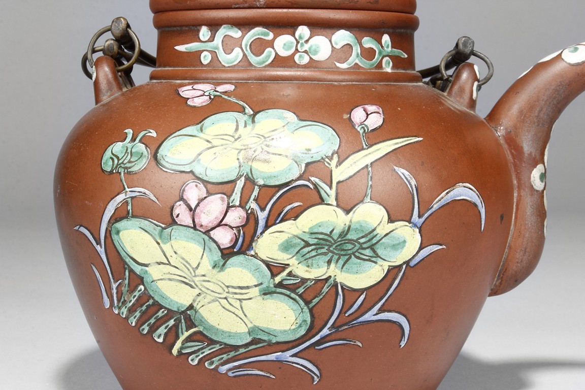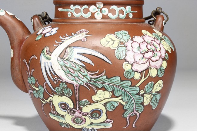 Of bulbous form, the teapot shaped similar to a jar, with arching metal handle, curved and long spout, and body decorated with phoenix, flowers, and lotus design, the lid caved in without finial. Bottom with two character “Yu Feng” mark. The teapot was made during the Republic period, when this type of teapot design was popular amongst civilians.