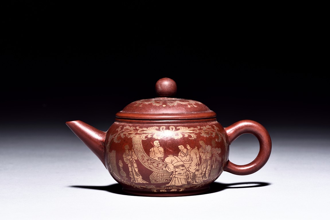 A YIXING GILT-PAINTED TEAPOT 描金人物紫砂壺