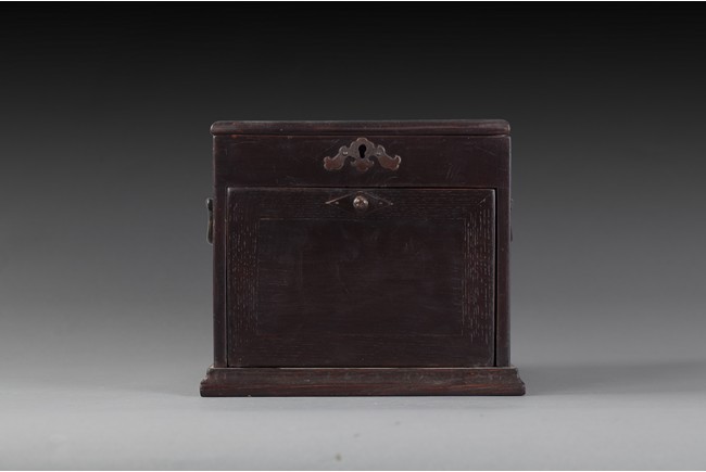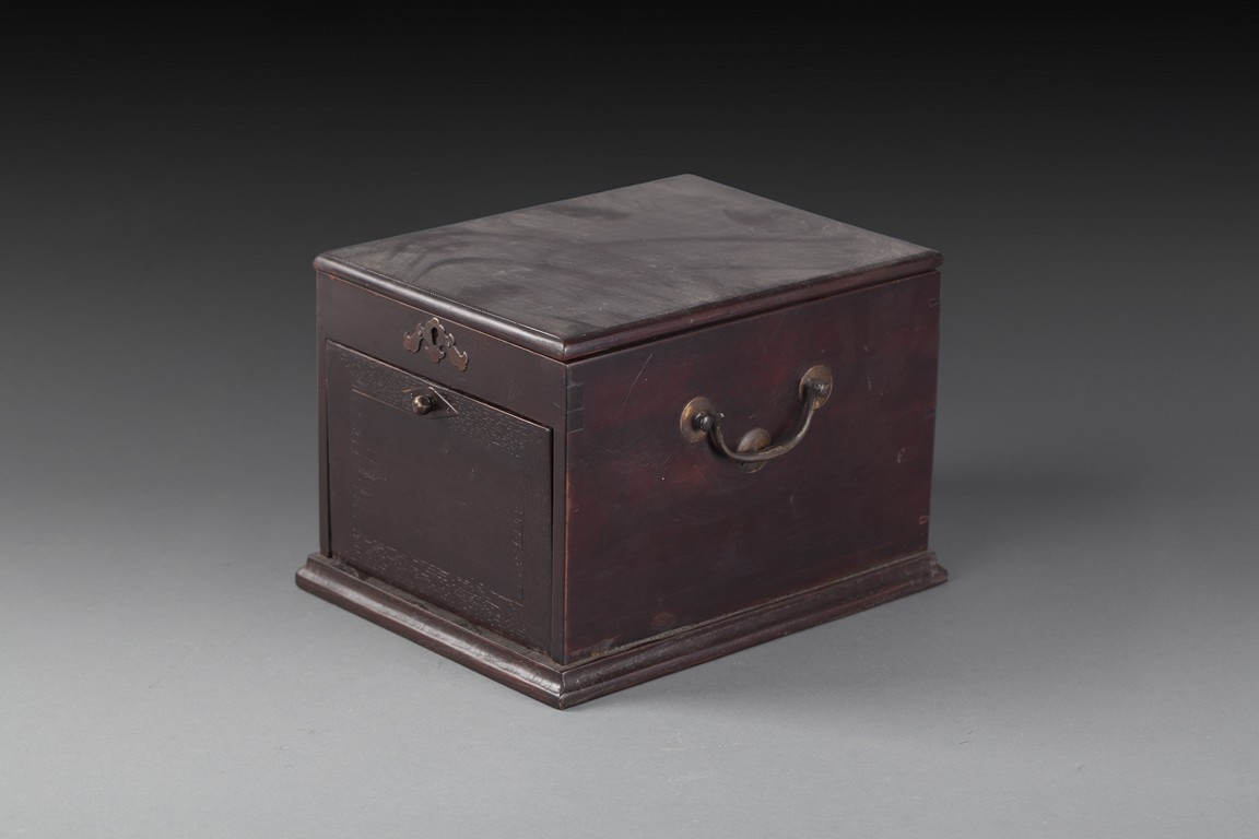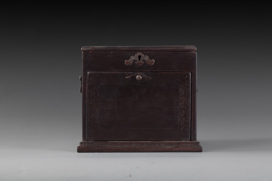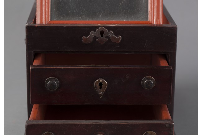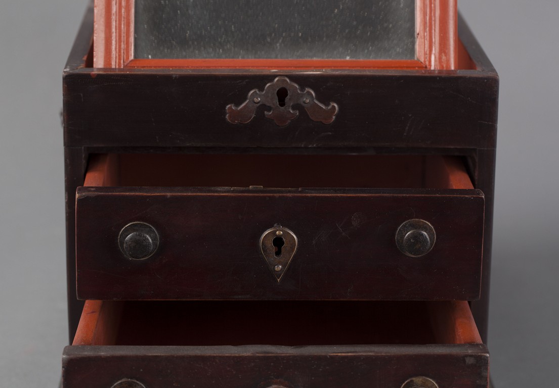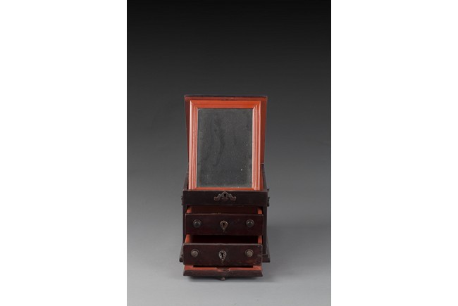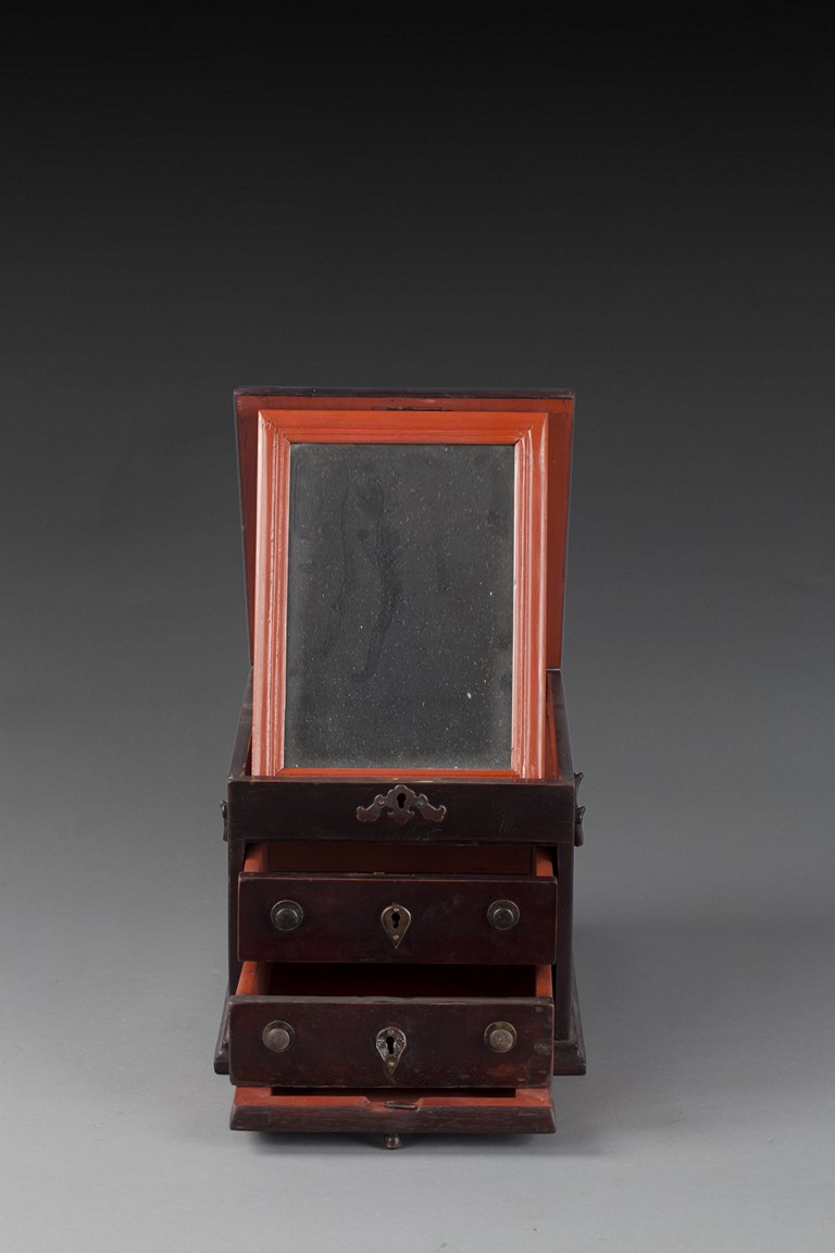 A finely made wooden box made of mahogany, with two drawers and a rectangular mirror inside.