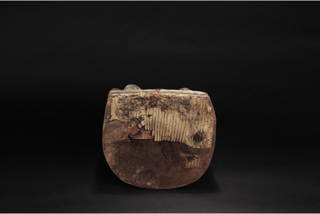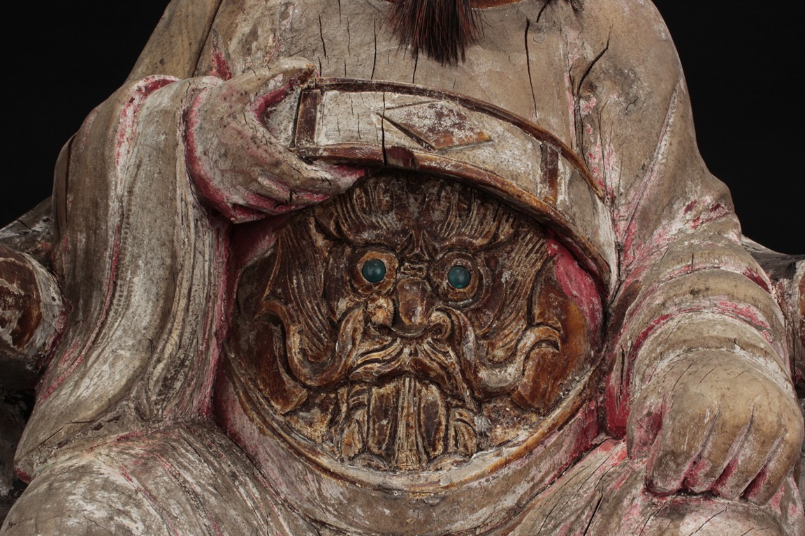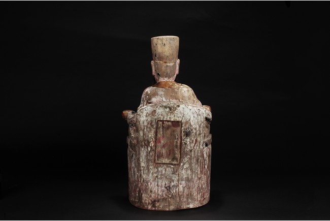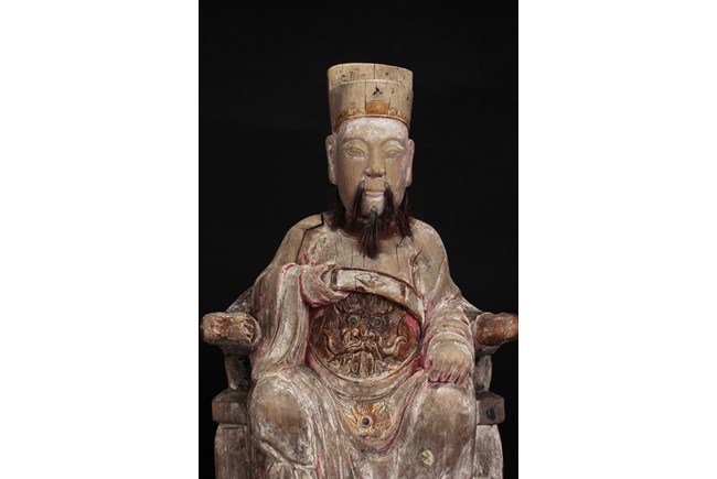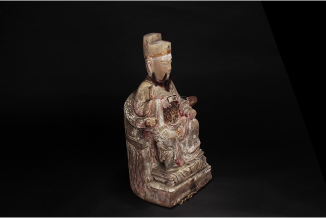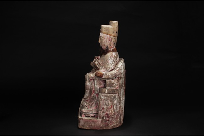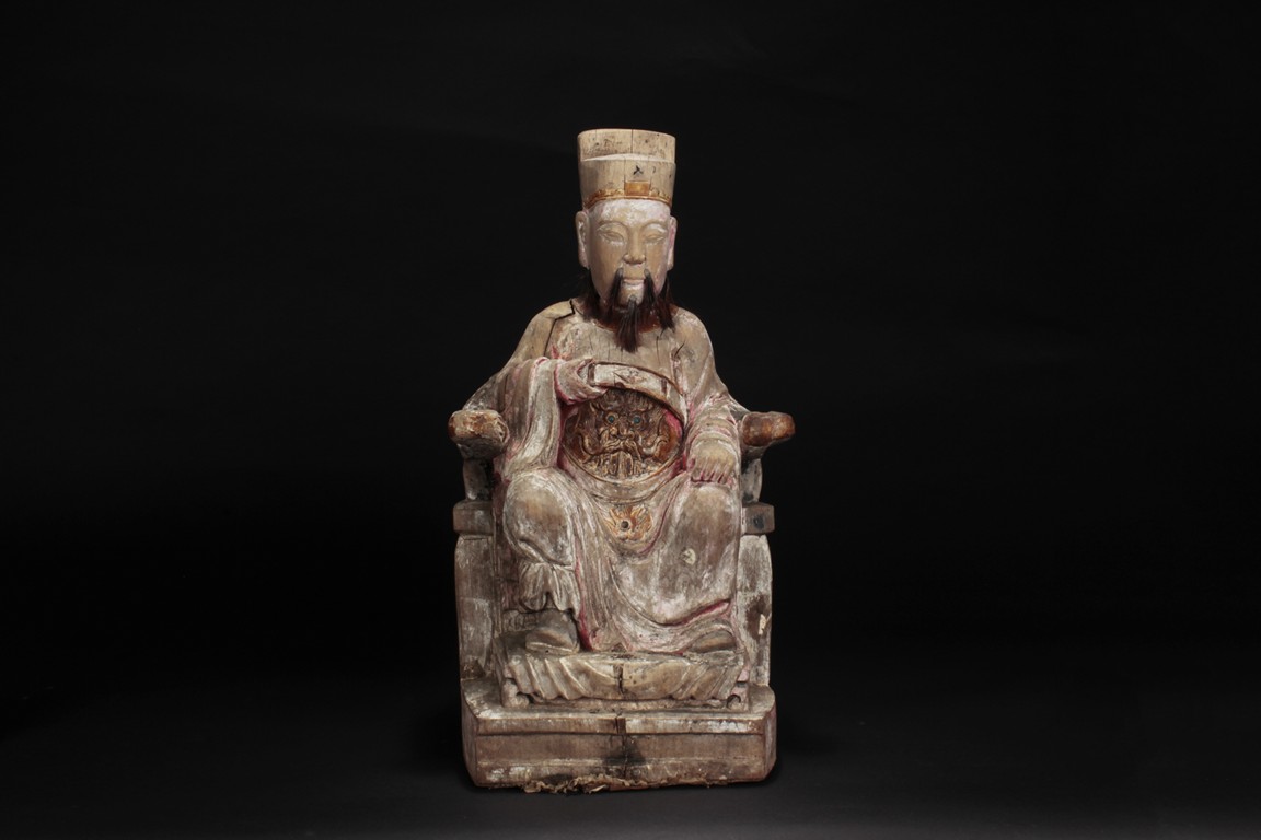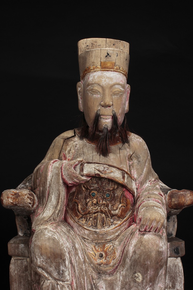 Seated in a throne-like chair, the figure dressed in long robes with a dragon head in the center and secured by two belts above and below the waist, his face with intent gaze and long beard, remnants of original paint. Age related loss of color and cracks. Qing Dynasty period.