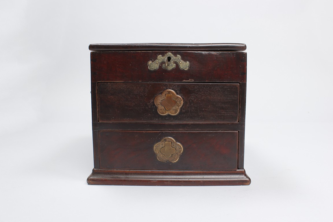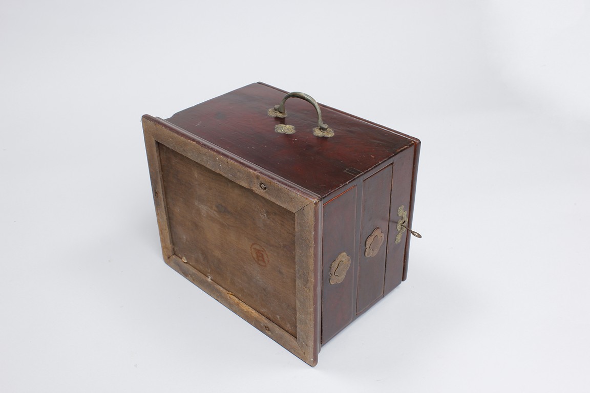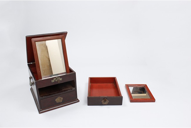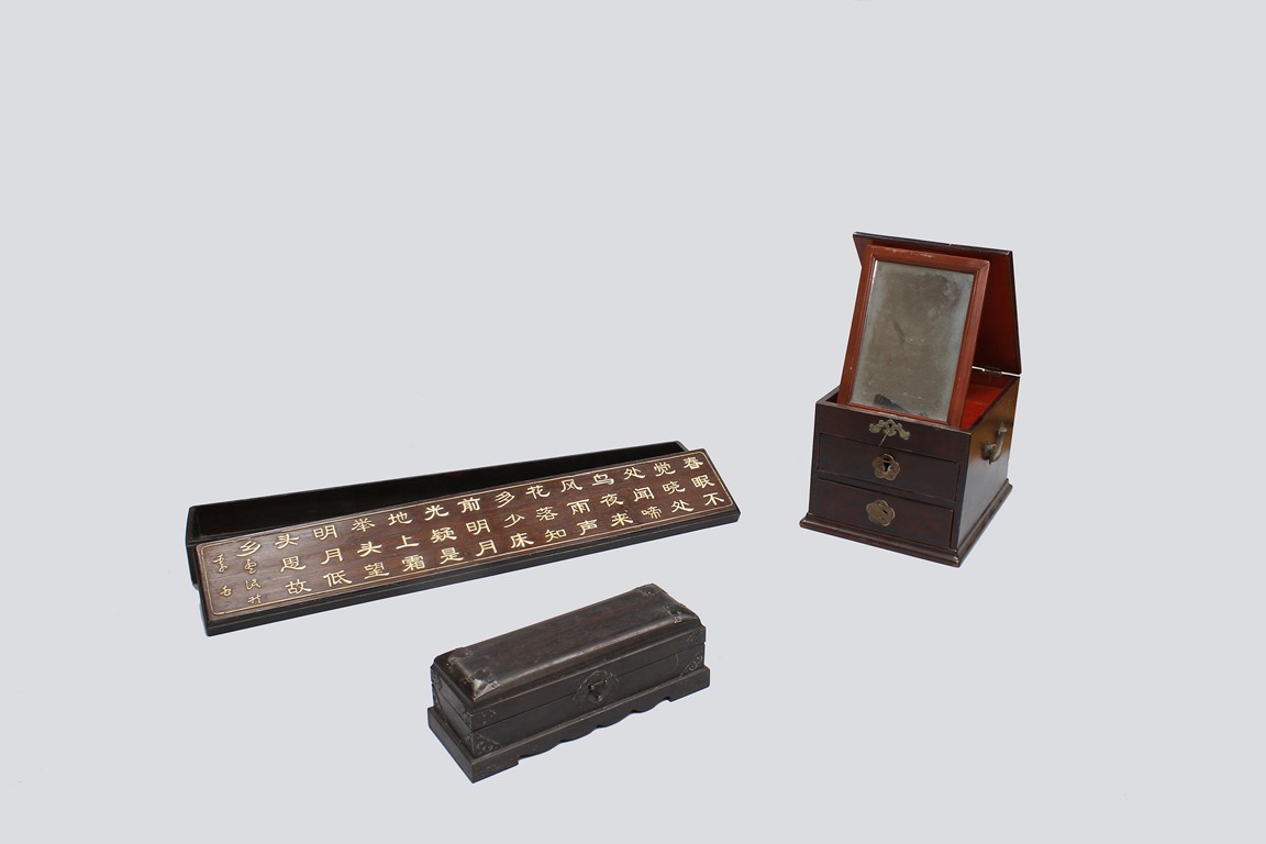 Three wooden boxes including a square Chinese traditional wood cosmetic box with bronze handles, mirror, and two pull out drawers; a Chinese hard wood rectangular box with a traditional Chinese style bronze lock lock on the front and edges reinforced; third box of rectangular form en-suited top cover with Chinese poetic writings.