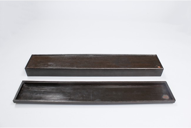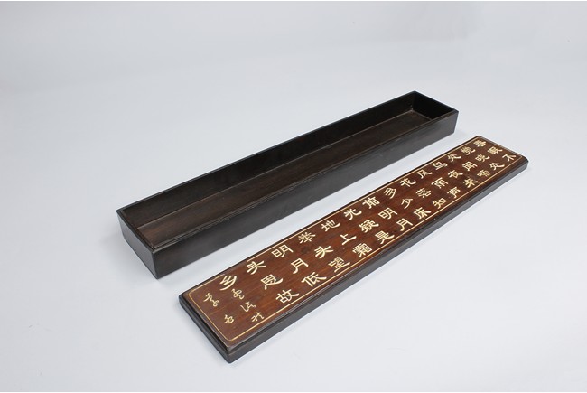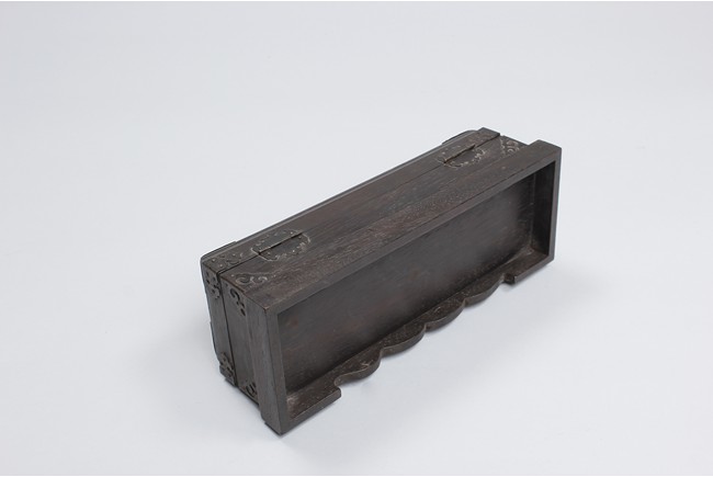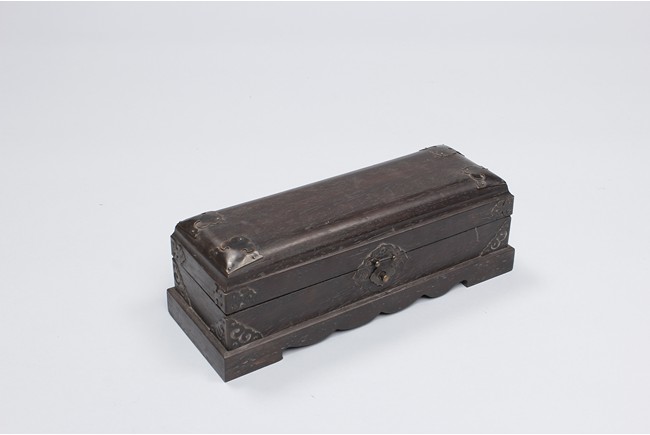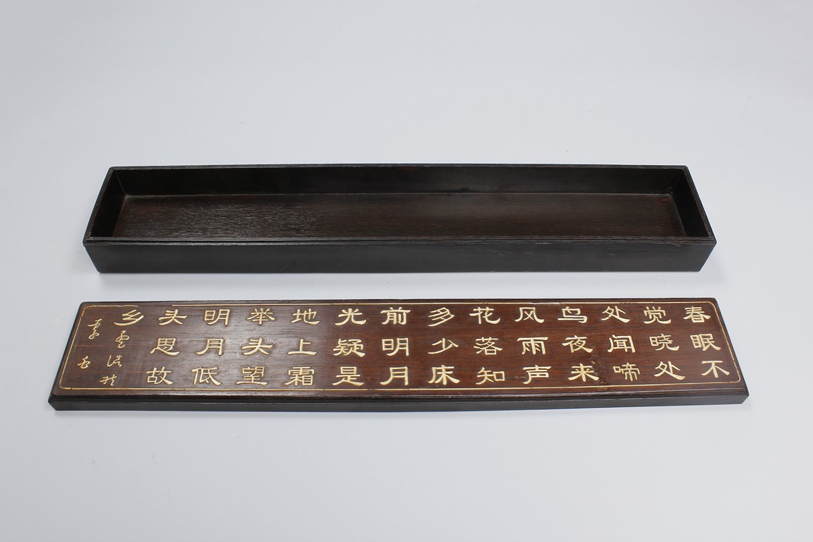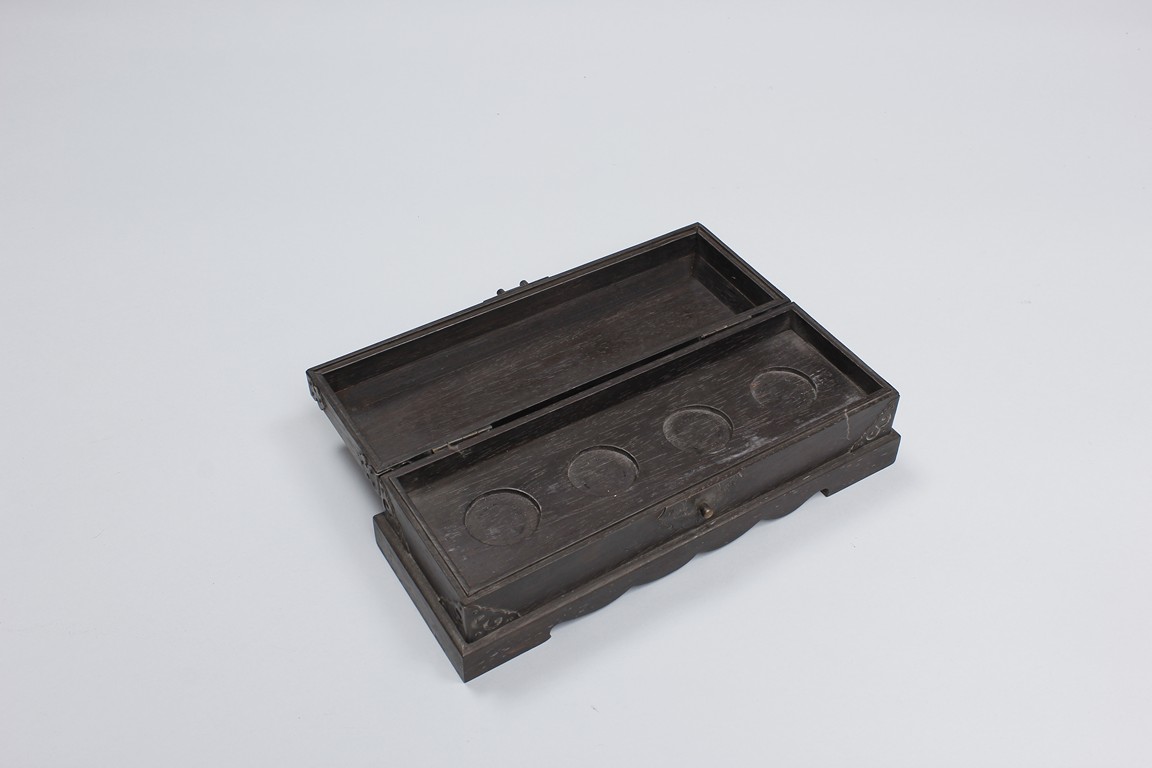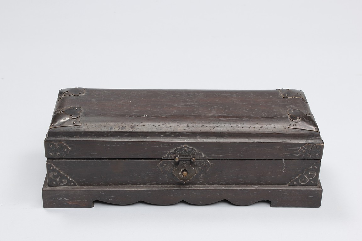 Three wooden boxes including a square Chinese traditional wood cosmetic box with bronze handles, mirror, and two pull out drawers; a Chinese hard wood rectangular box with a traditional Chinese style bronze lock lock on the front and edges reinforced; third box of rectangular form en-suited top cover with Chinese poetic writings.