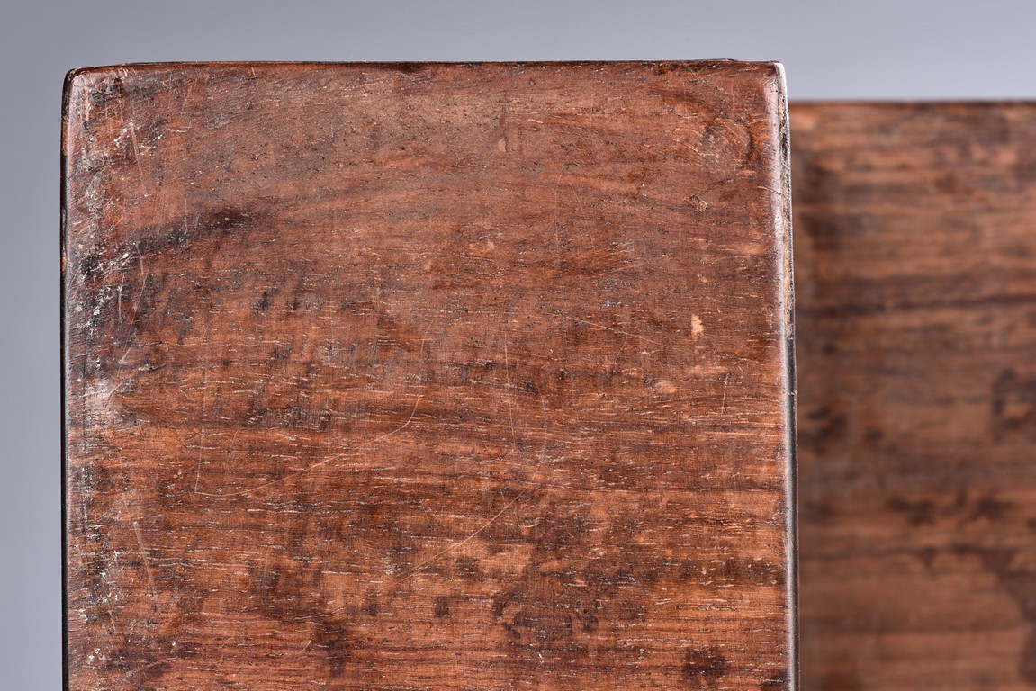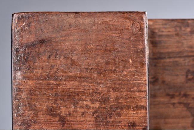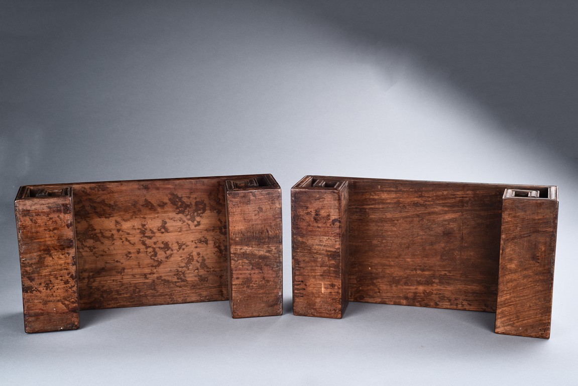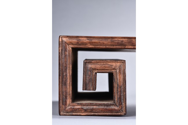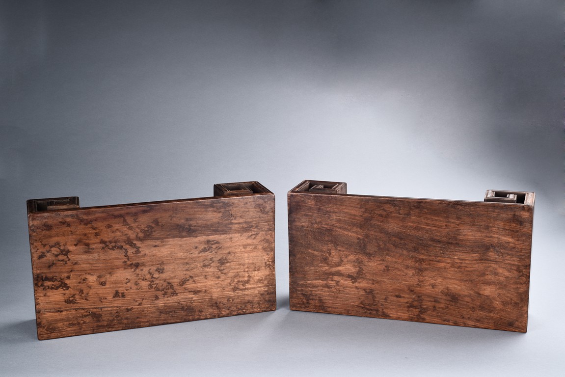 Of rectangular model, each stand is carved with key-fret formed ends. The wood surface is of natural hardwood grain and pattern.