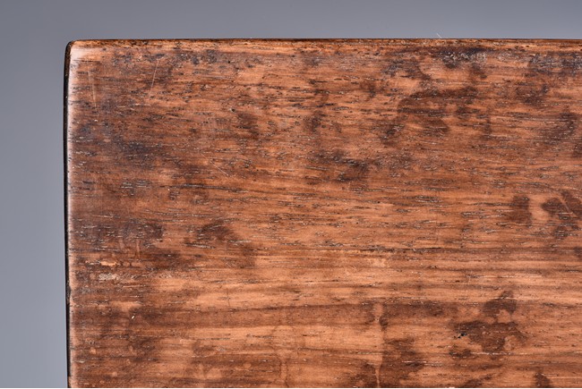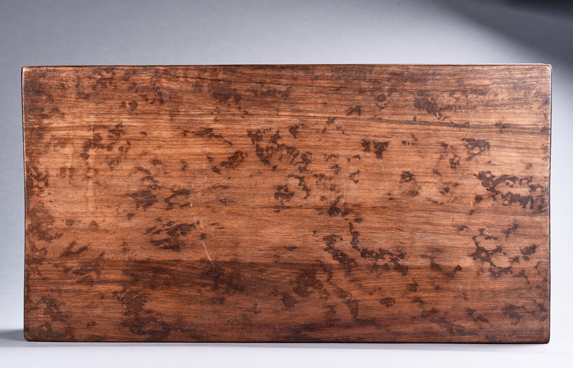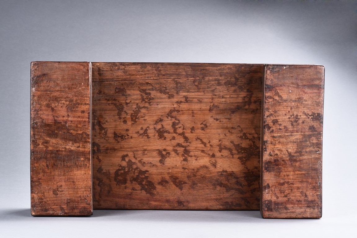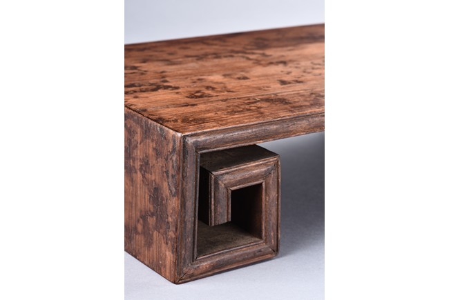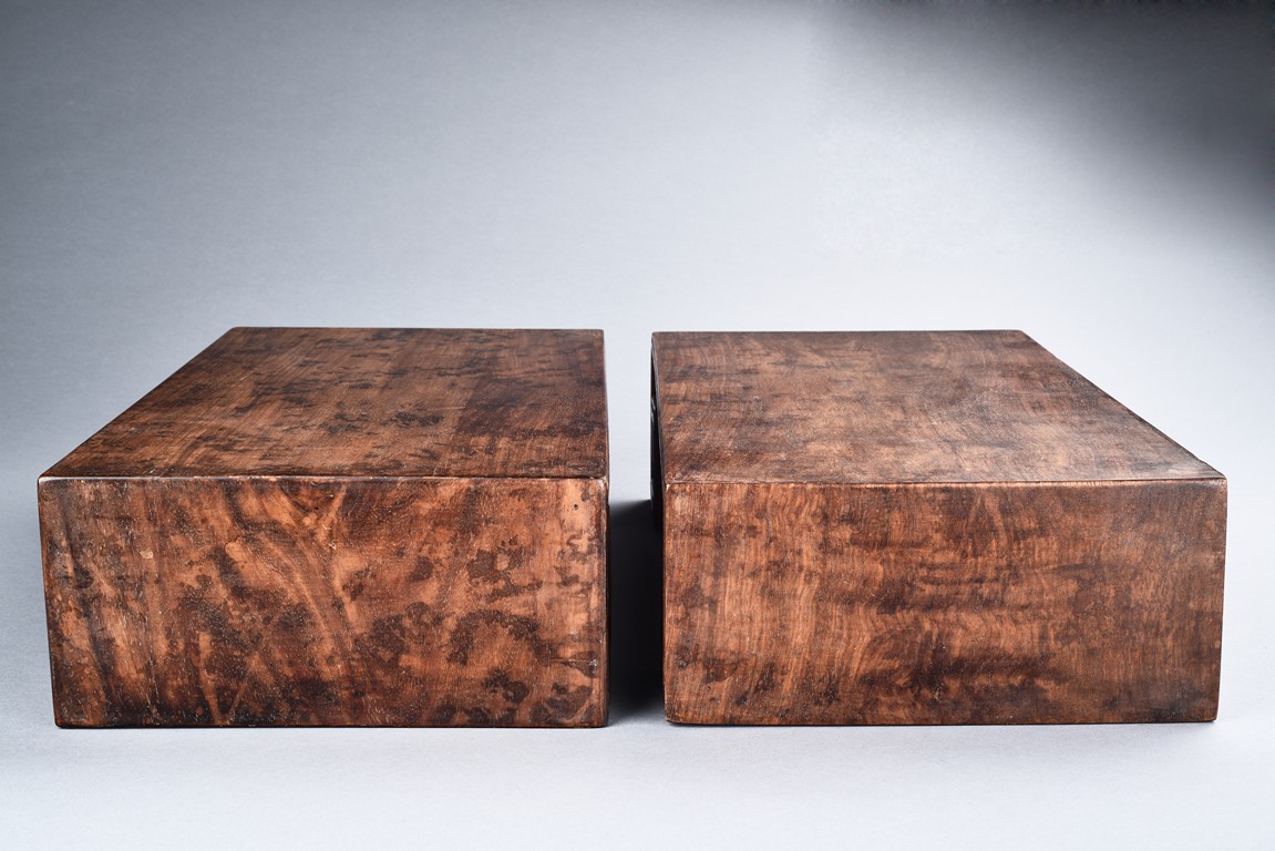 Of rectangular model, each stand is carved with key-fret formed ends. The wood surface is of natural hardwood grain and pattern.