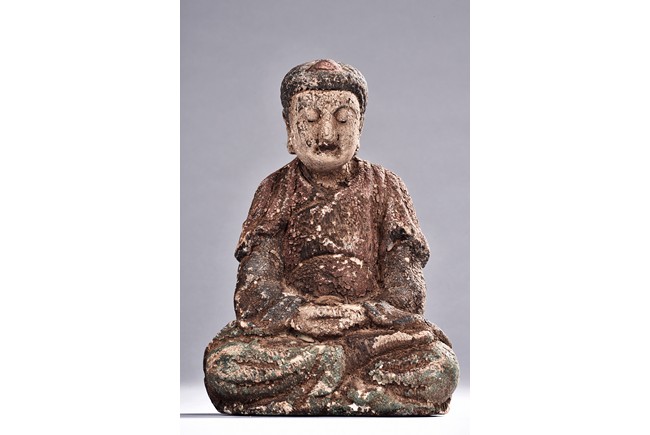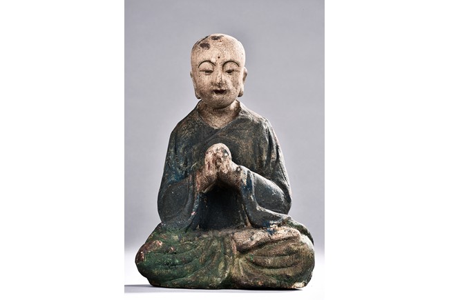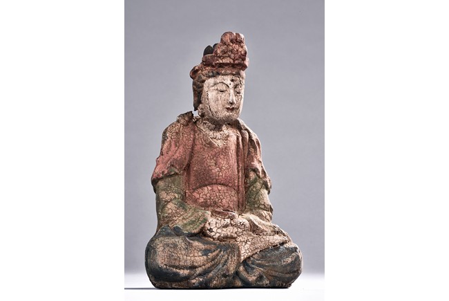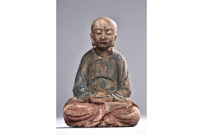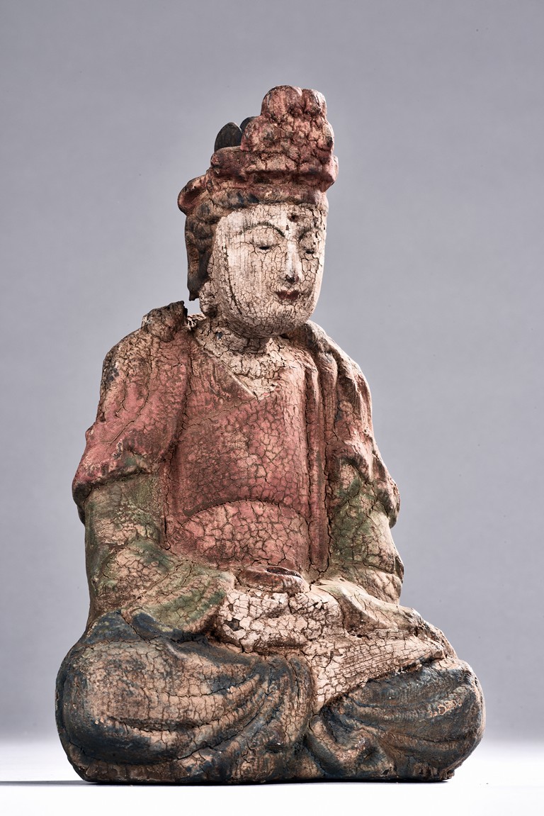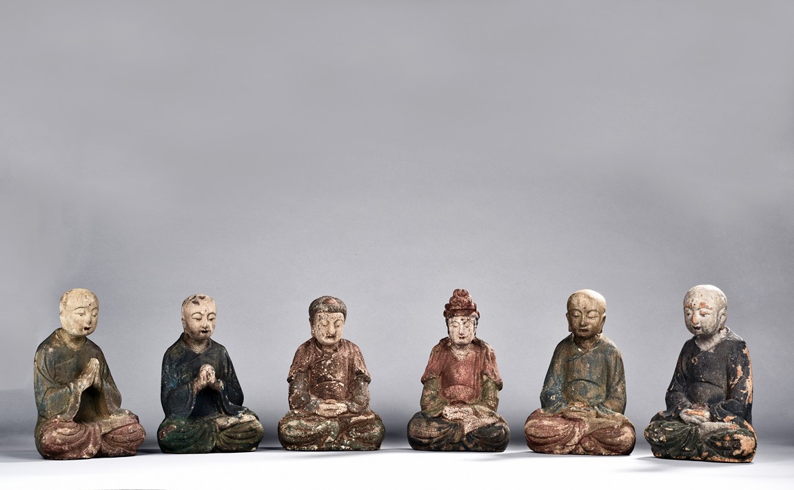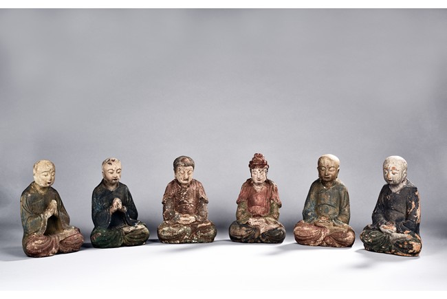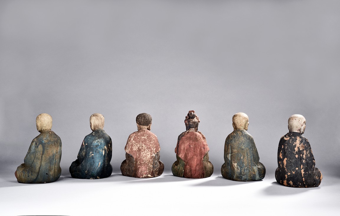 Comprising of six polychrome seated wood luohan or bodhisattva figures, each painted with blue, green, or red pigment.