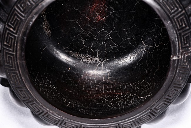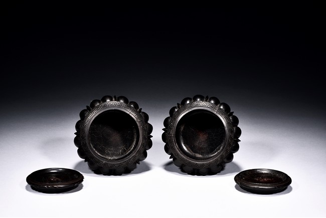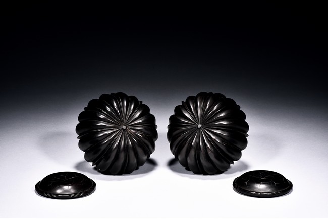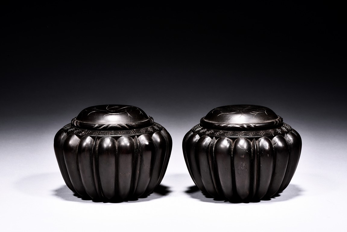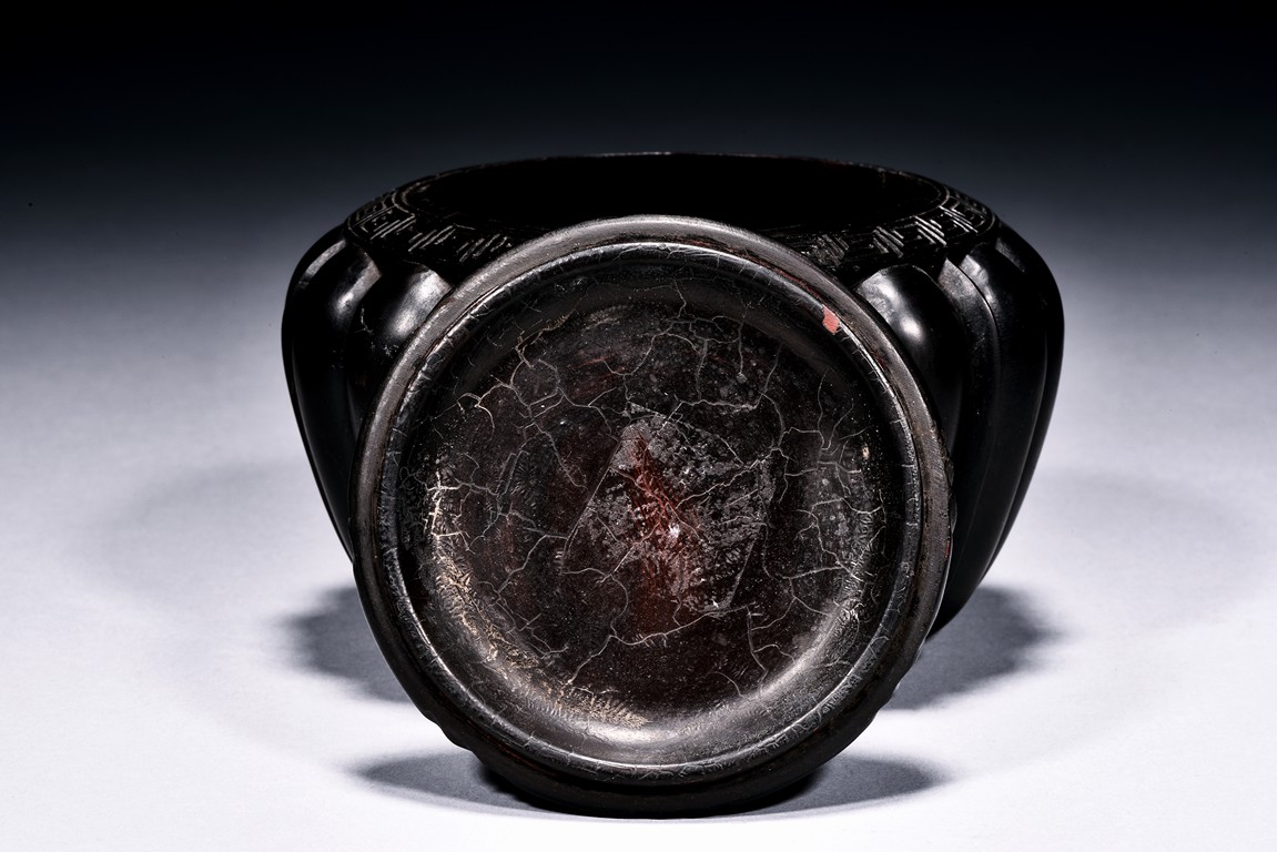 Modelled in the form of melon, the rim is incised with key-fret borders, fitted with a circular cover decorated with floral pattern. The wood is of deep dark brownish tone