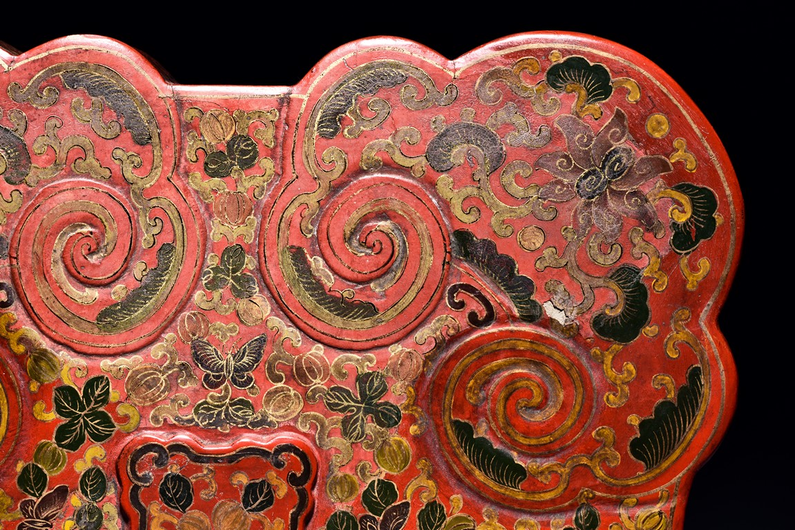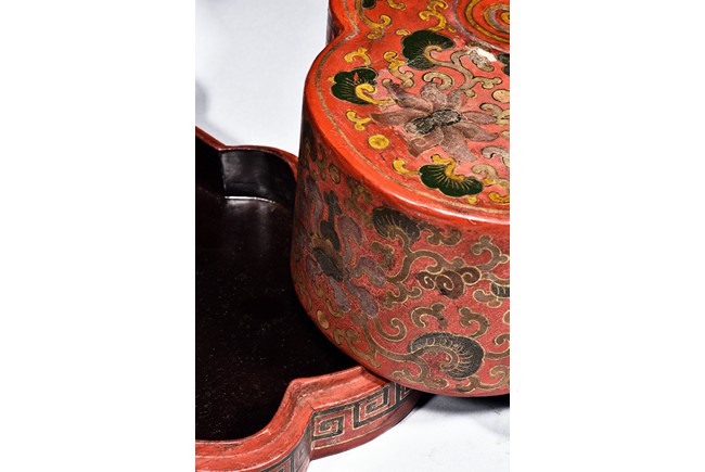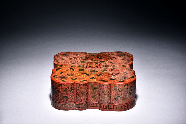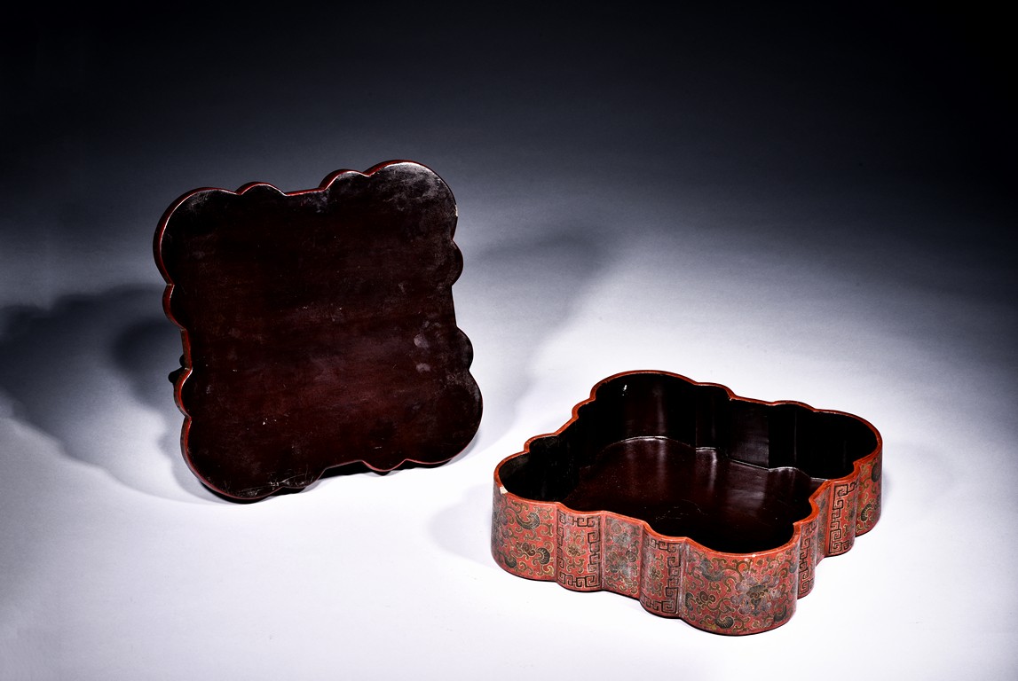 Of barbed form, the cover overall painted with scrolling floral lotus pattern and leaves in gilt and green against red lacquer ground, the box further decorated with a band of key-fret pattern. Qing Dynasty period.