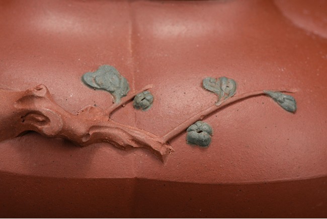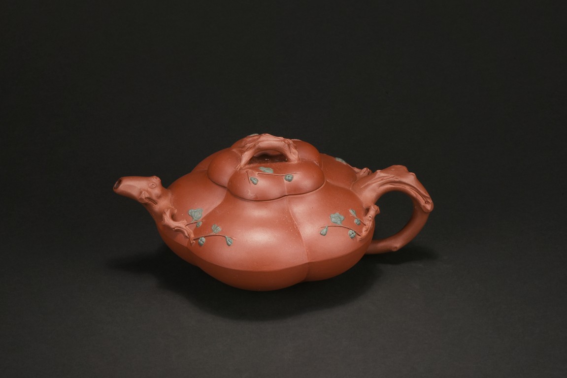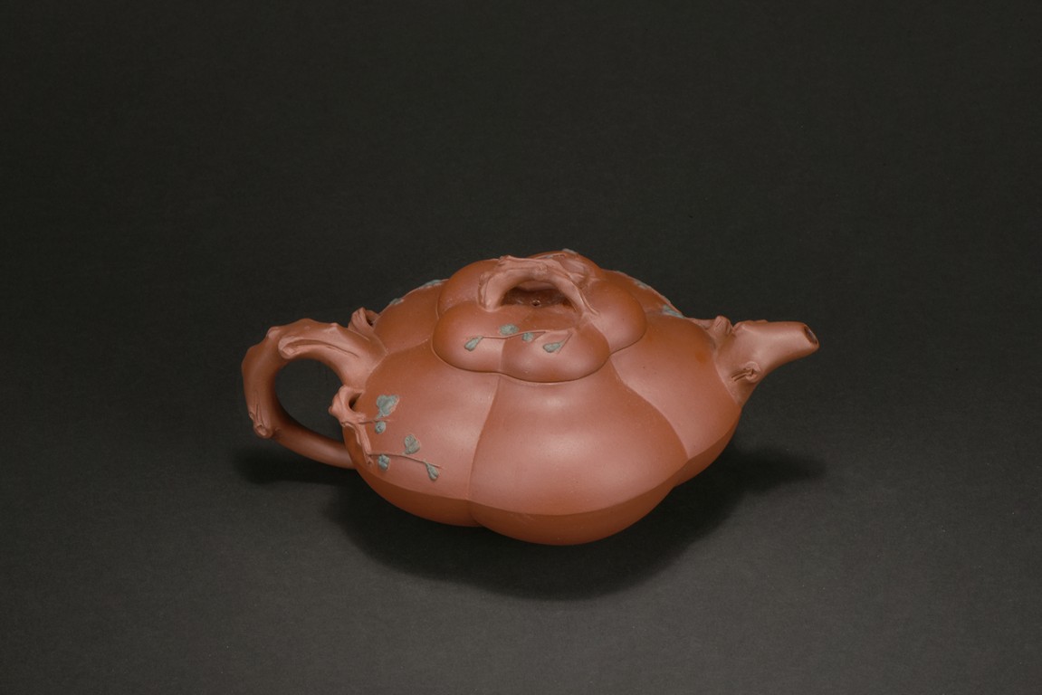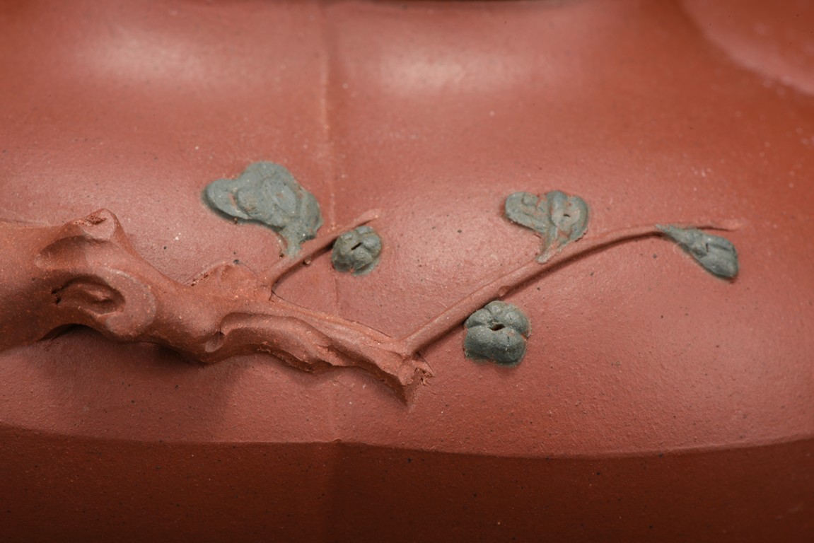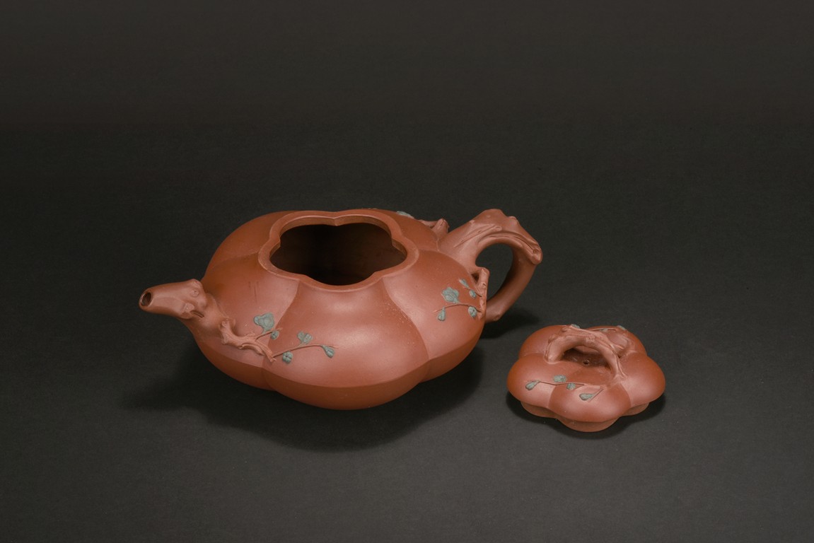 Of compressed melon form, the body modelled into five lobes, the handle, spout and finial depicts tree branches, the body and lid decorated with plum branches and flowers in relief.