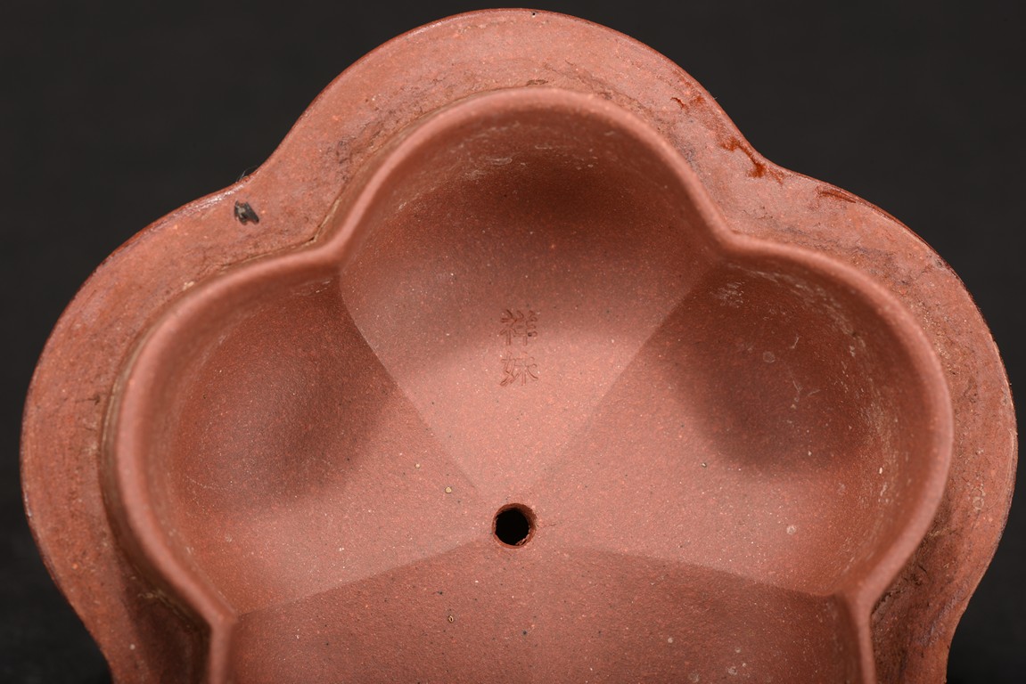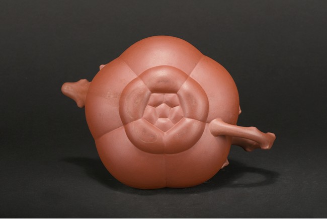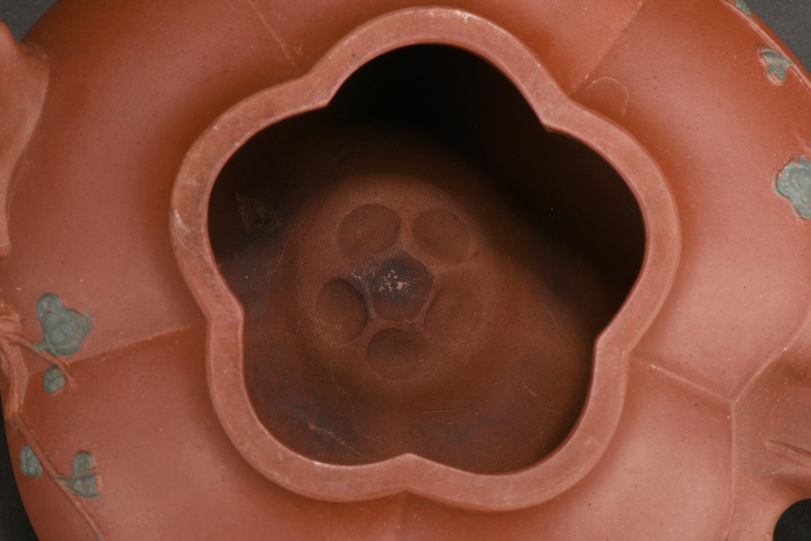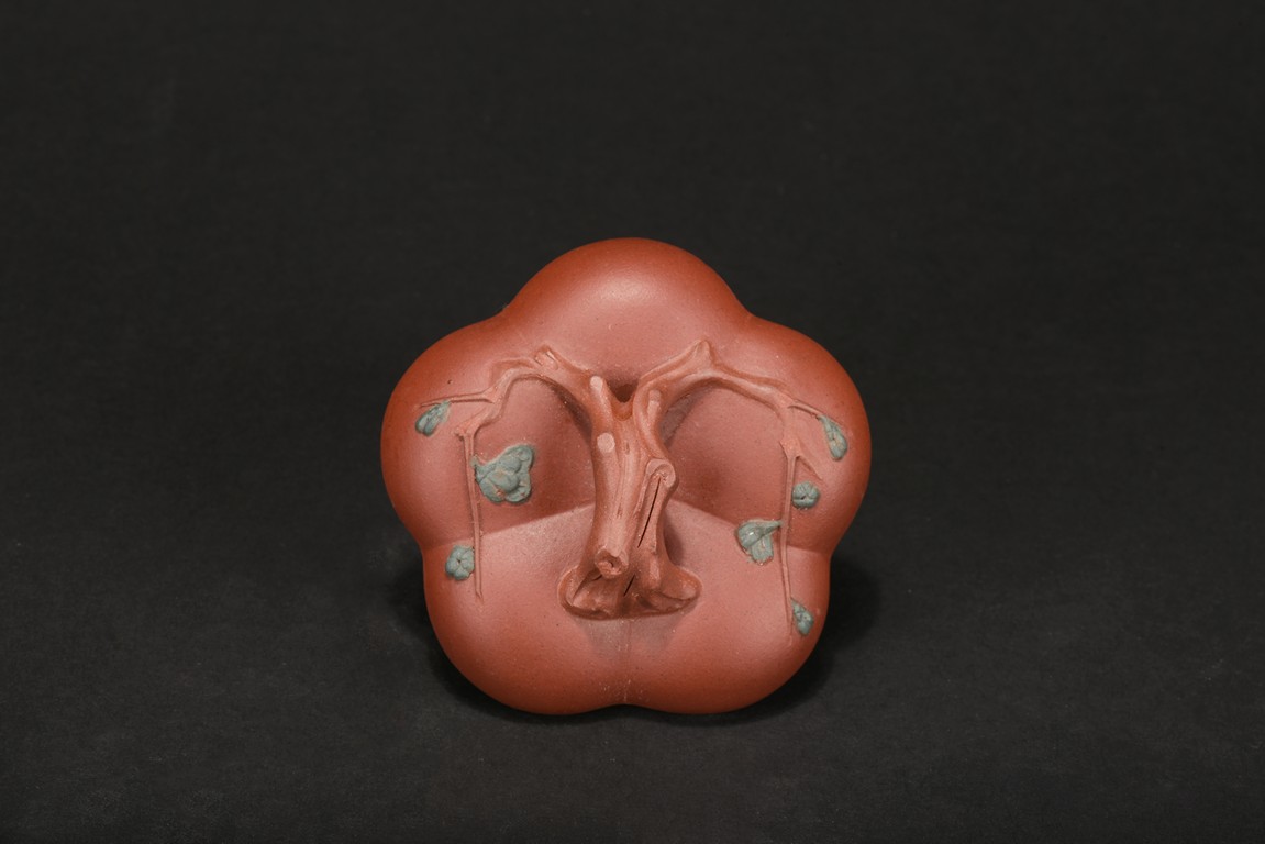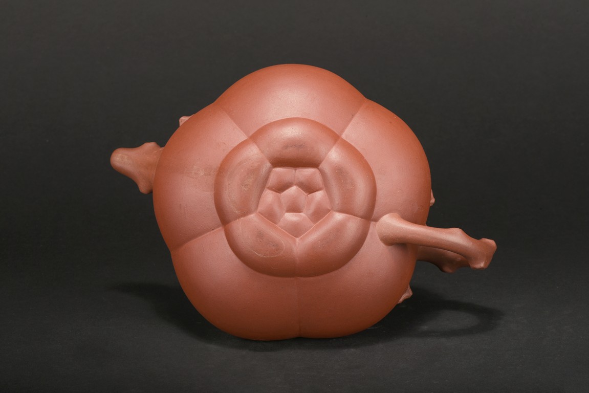 Of compressed melon form, the body modelled into five lobes, the handle, spout and finial depicts tree branches, the body and lid decorated with plum branches and flowers in relief.