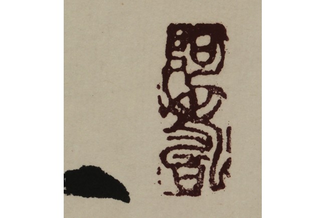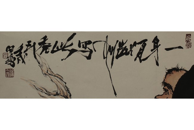 Ink and color on paper painting, hanging scroll. Painting depicts a seated Bodhidharma, facing away, with a censer in front of him. Artist signature and mark 'Pan Tianshou' on top.