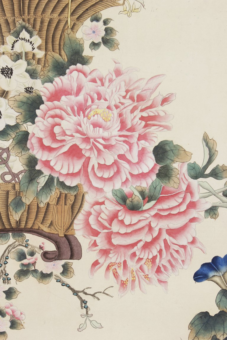 Color and ink on paper, hanging scroll. The painting depicts a scene of blossoming flowers on a tree with flower baskets, and two birds perched on stone and branch. Chinese colophon, artist signature and mark 'Chen Zhifo' on the right side.
