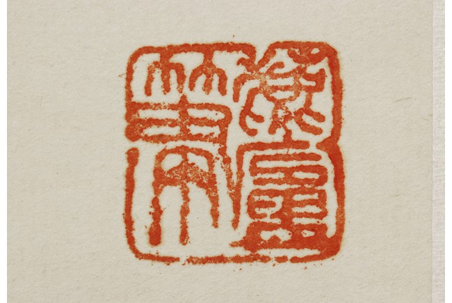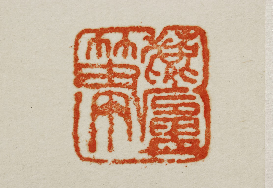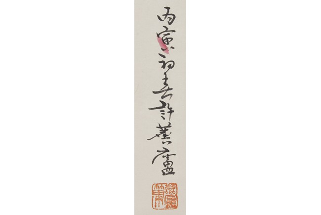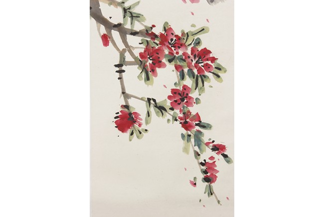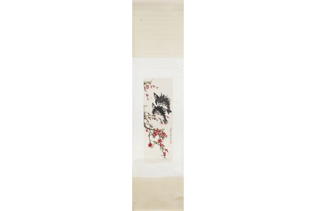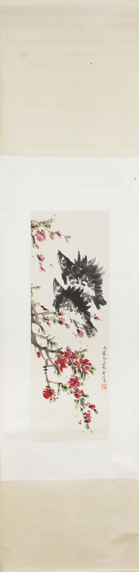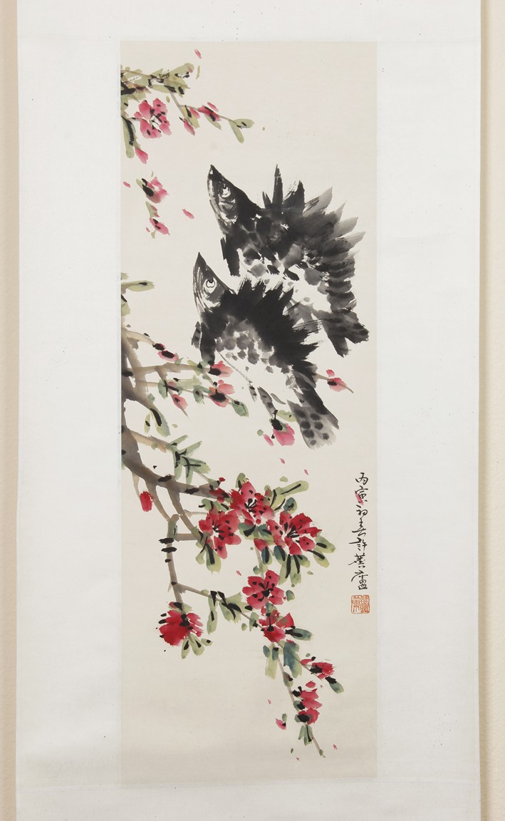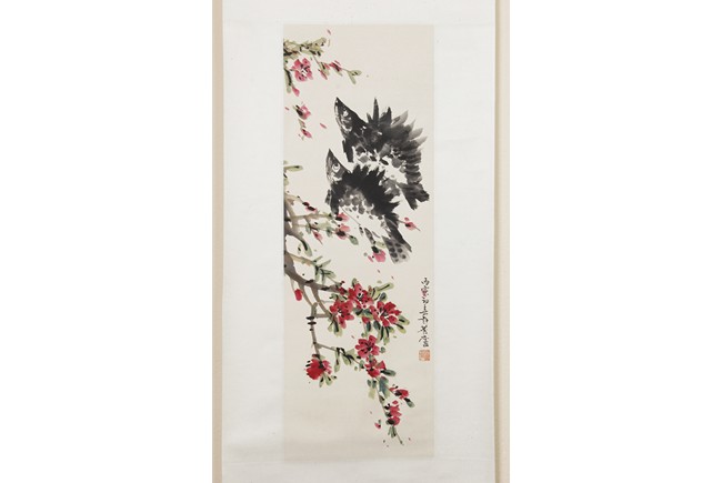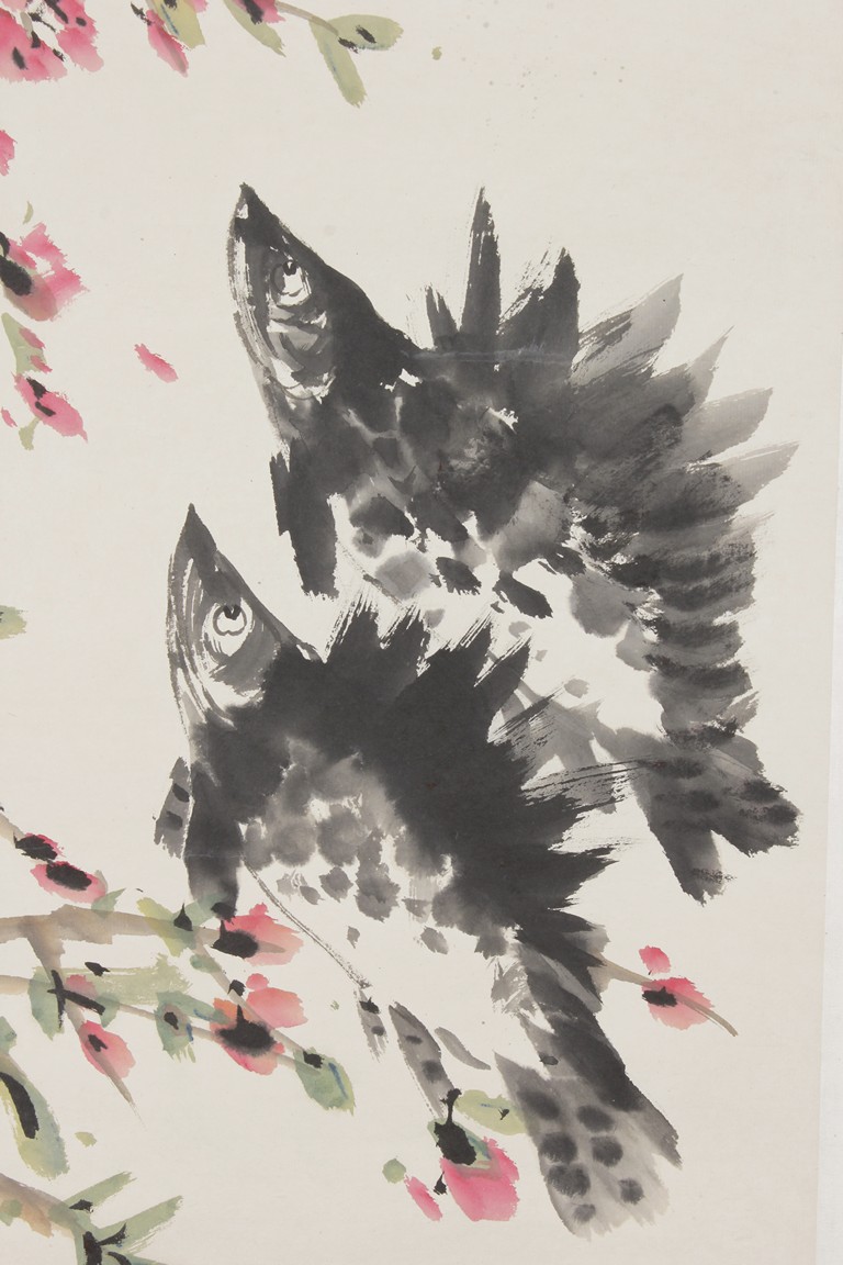 Color and ink on paper, hanging scroll. The painting depicts two fishes swimming up the river against the reflection of blossoming flower tree. Artist signature and mark 'Xu Linlu' on the right side.