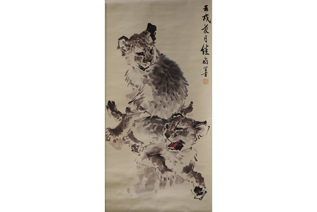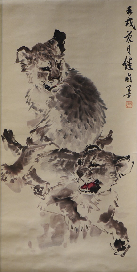 Color and ink on paper. Two tiger cubs. Signed and with one seal of the artist.