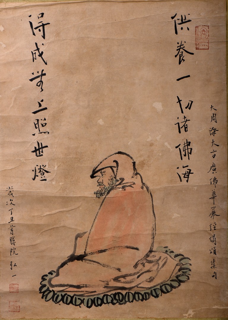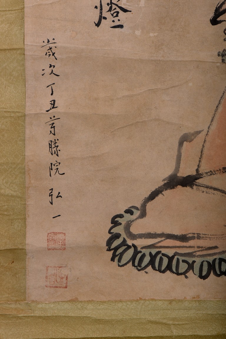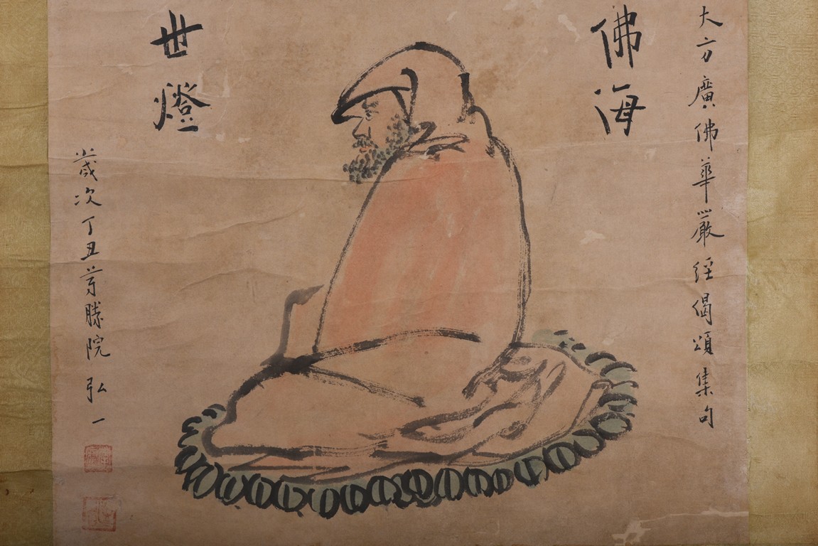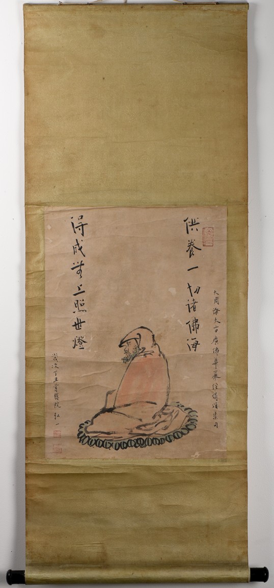 Ink and color on paper. Figure. Hanging scroll. Inscribed, signed, and with three seals of the artist. Attributed to Hong Yi.