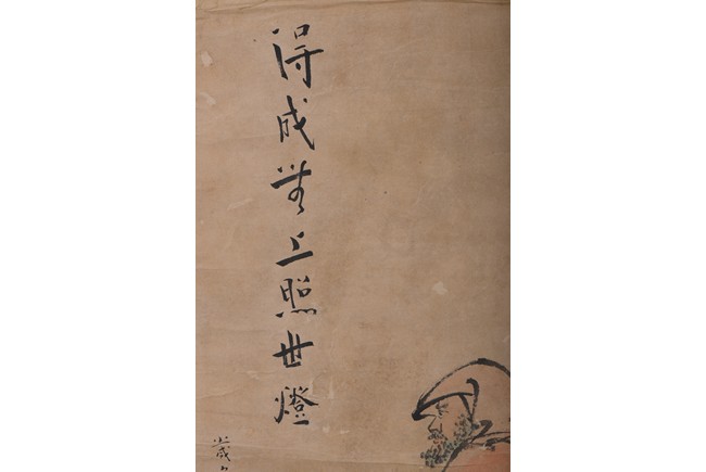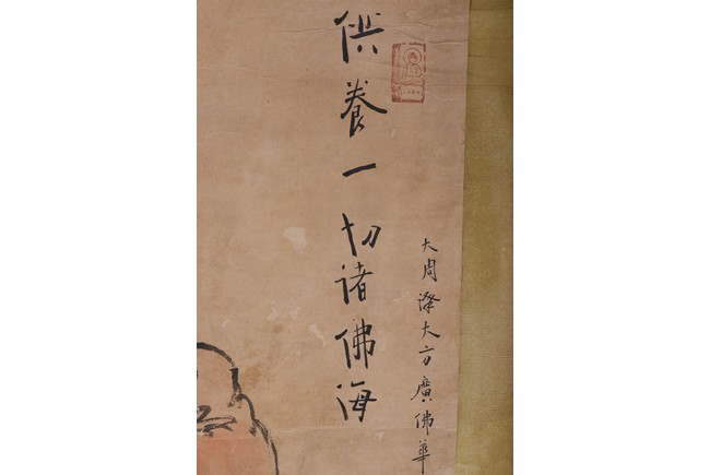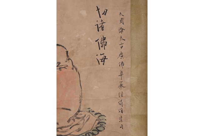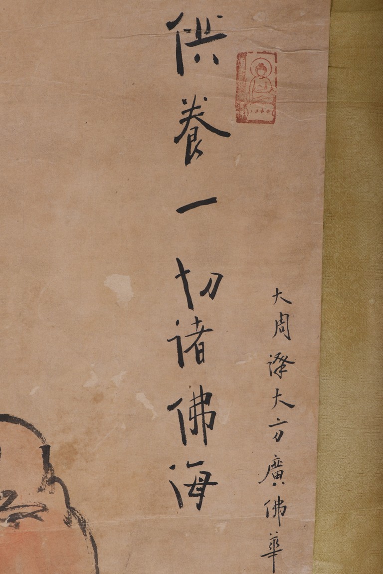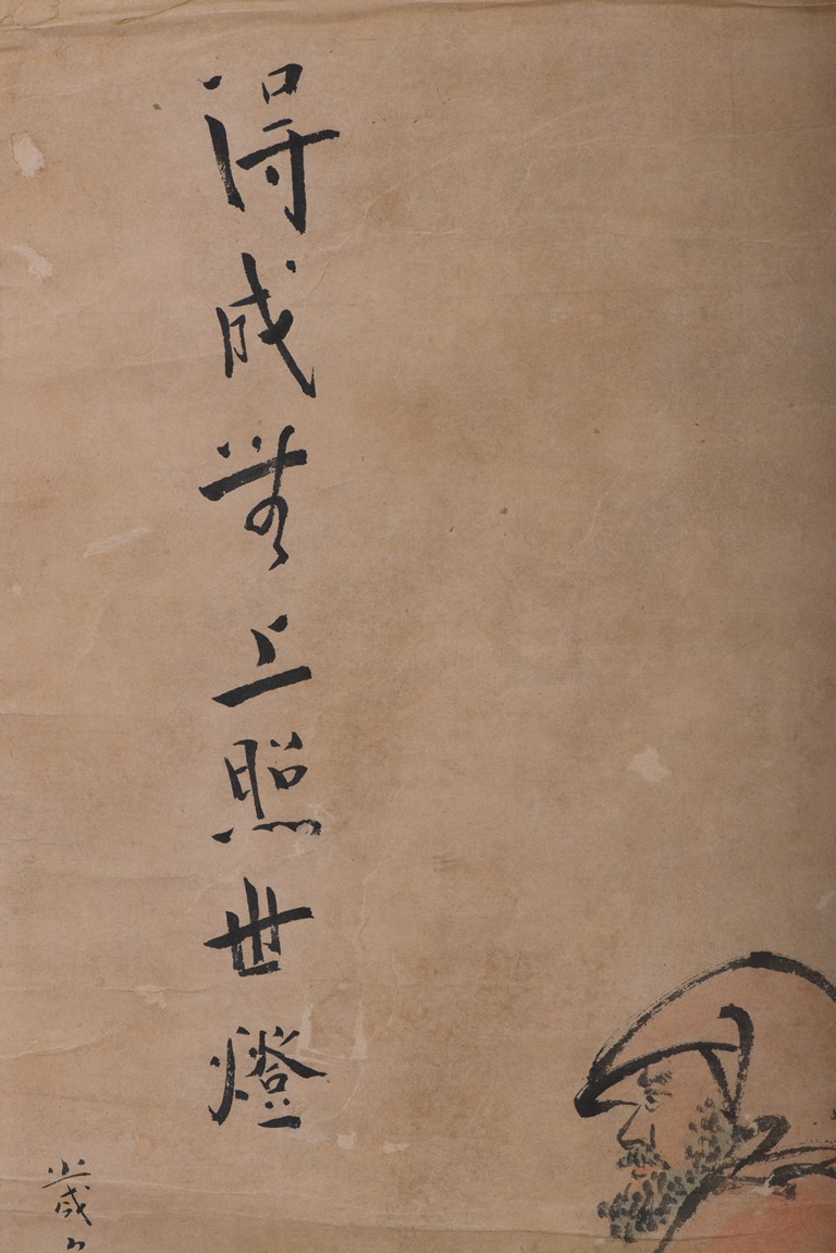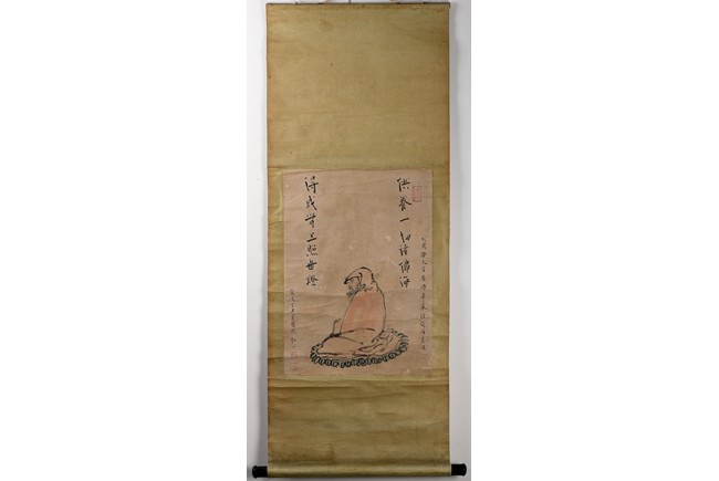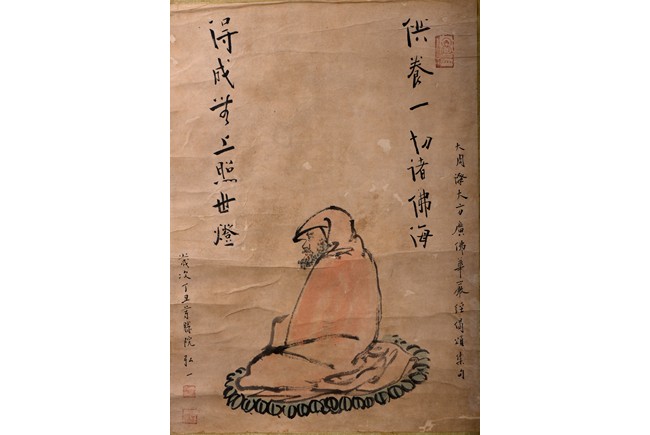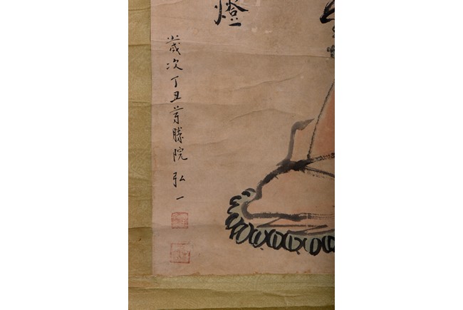 Ink and color on paper. Figure. Hanging scroll. Inscribed, signed, and with three seals of the artist. Attributed to Hong Yi.