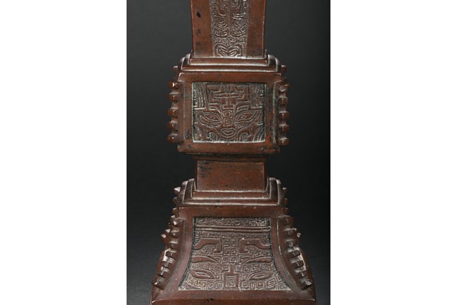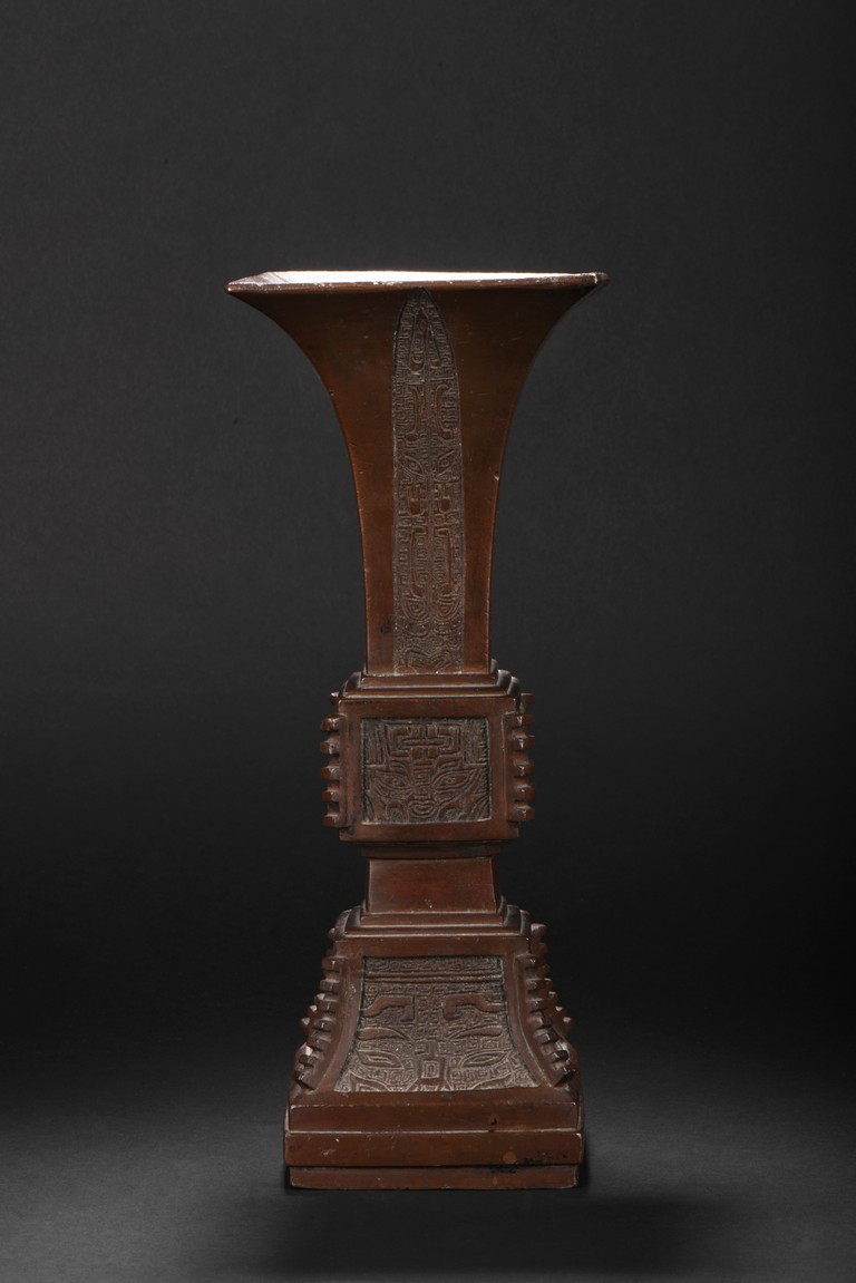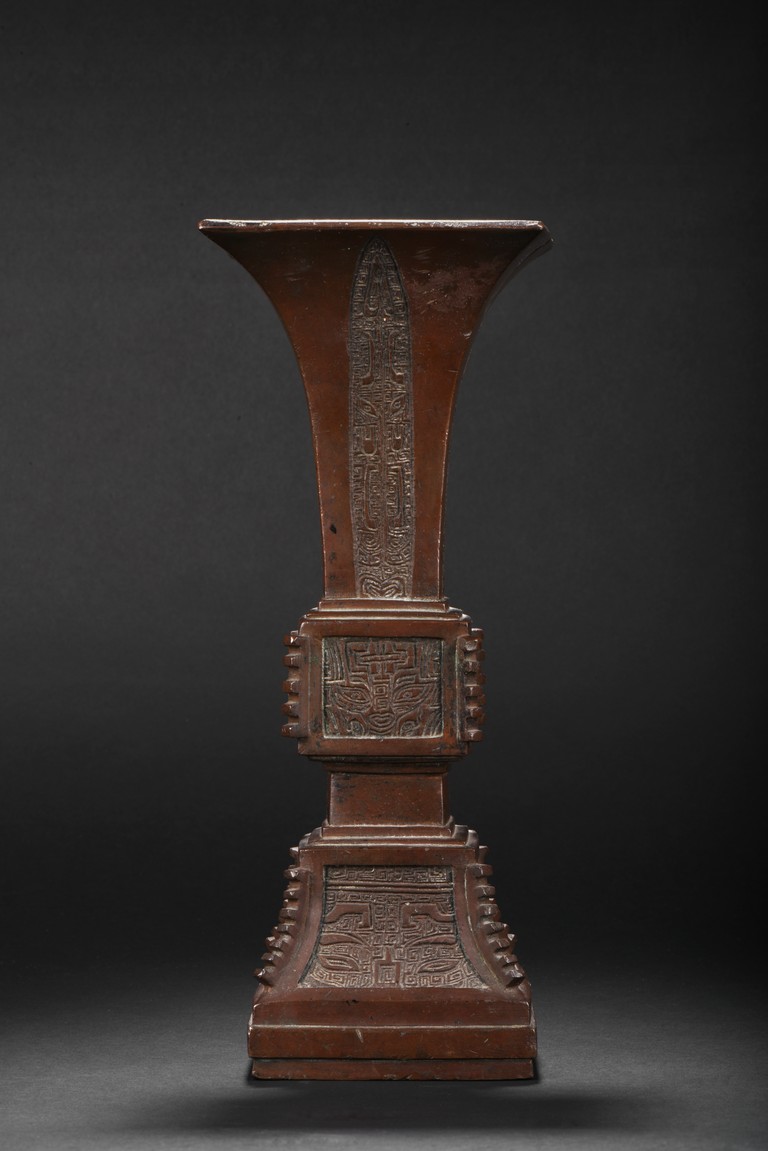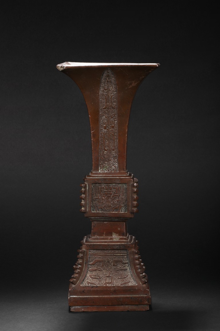 Of slender form rising from a spreading base to a square-shaped trumpet mouth, the neck cast with four tapering cicada blades shaped pattern, the central bulb and foot crisply cast with taotiemasks set with raised eyes and brows divided by notched flanges and the leiwen spiral ground finely cast, the bronze with a smooth brownish patina to the decorated surfaces, some malachite encrustration inside the vessel. Qing Dynasty period.