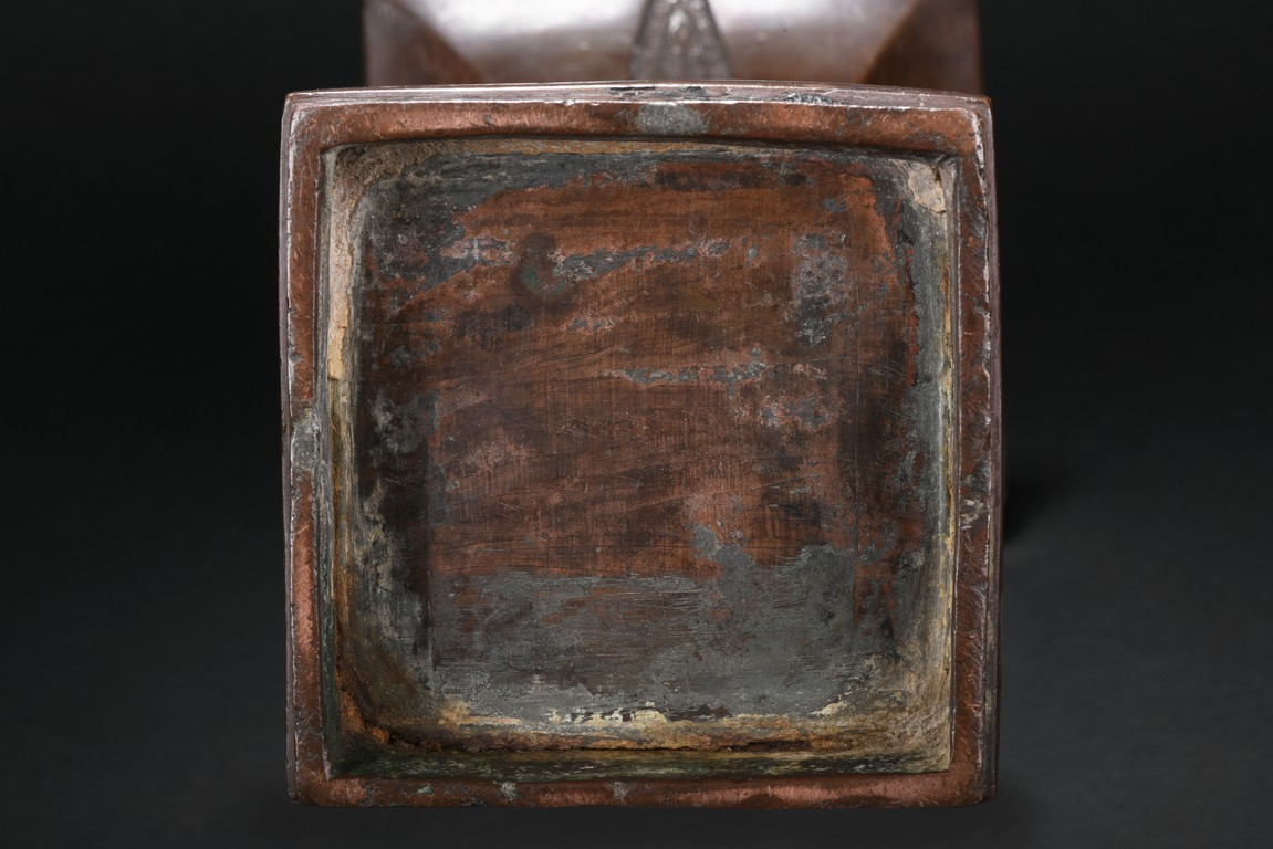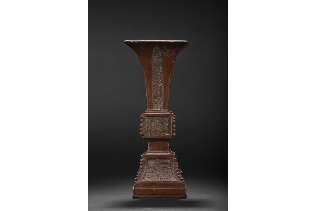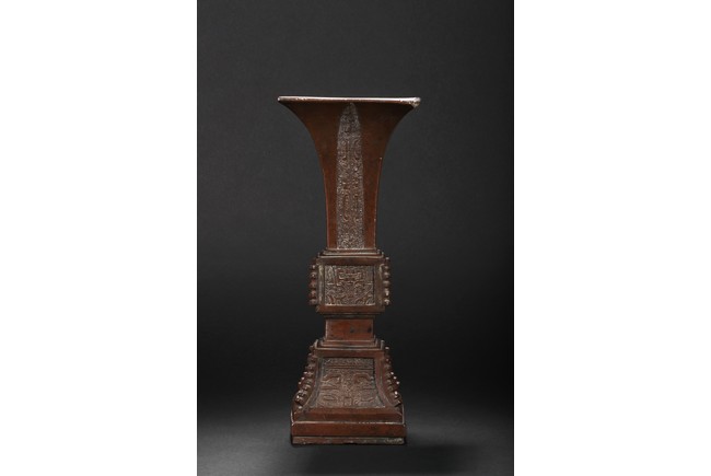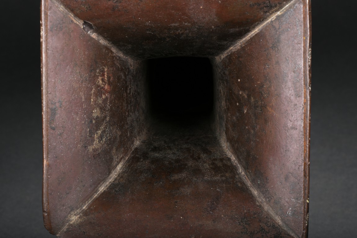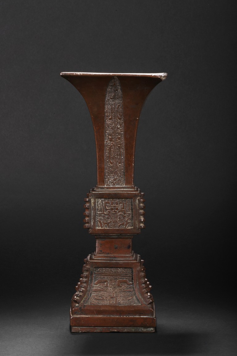 Of slender form rising from a spreading base to a square-shaped trumpet mouth, the neck cast with four tapering cicada blades shaped pattern, the central bulb and foot crisply cast with taotiemasks set with raised eyes and brows divided by notched flanges and the leiwen spiral ground finely cast, the bronze with a smooth brownish patina to the decorated surfaces, some malachite encrustration inside the vessel. Qing Dynasty period.