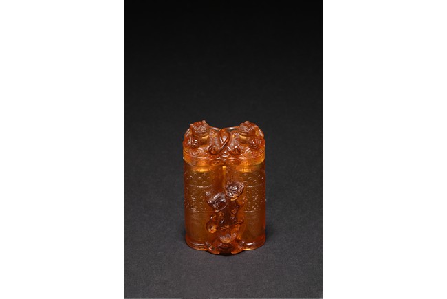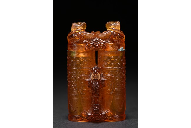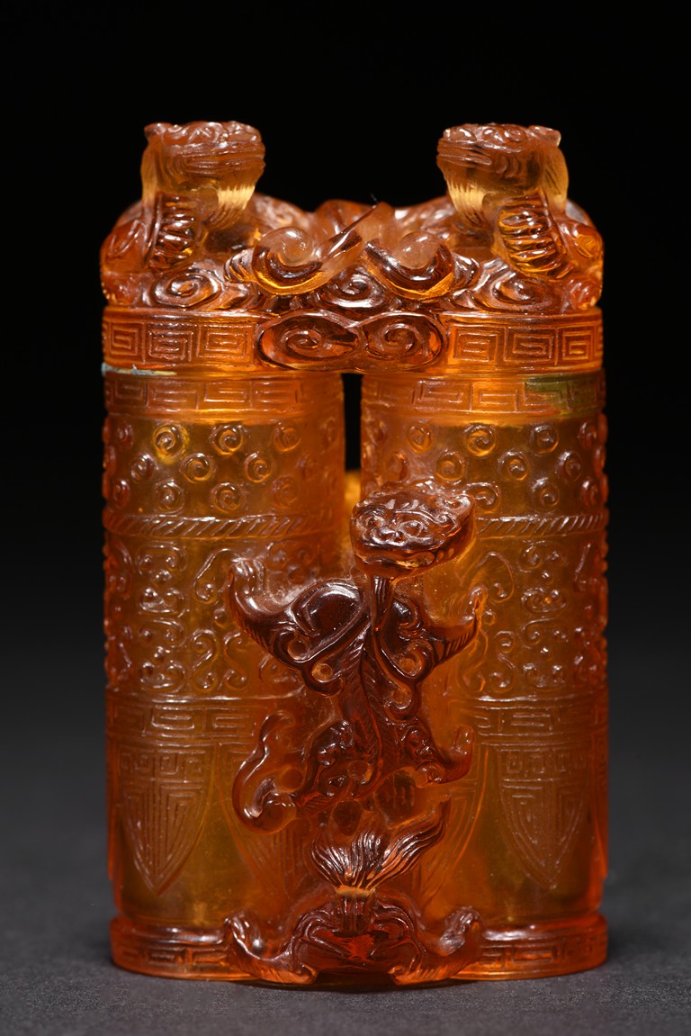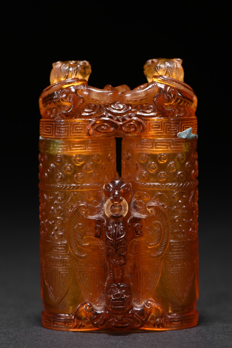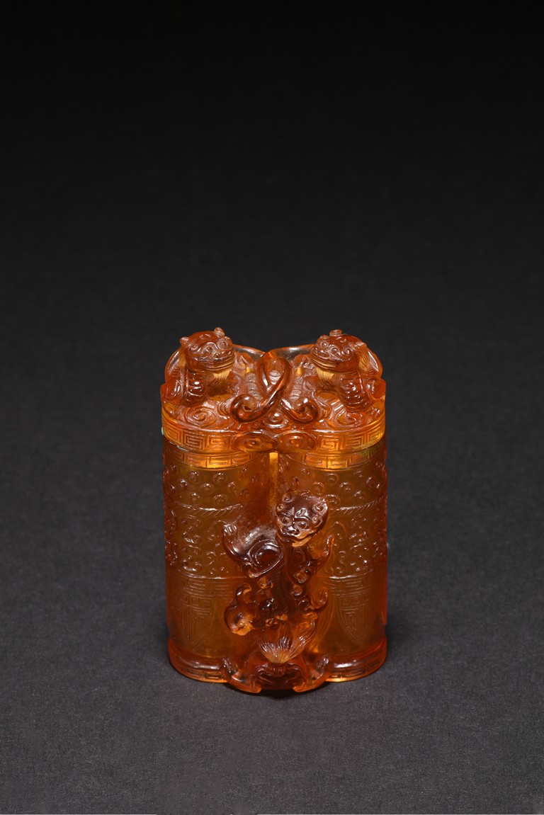 Delicately worked and hollowed in the form of two tubular pedestal vases flanking an eagle standing on the head of a recumbent bear, the eagle suspending a fixed ring from its beak with wings outstretched across both vases, each vase carved in low relief with a band of archaistic motifs between pendent cicada lappets, the rim and foot encircled with a key-fret border, the bear's hindquarters and tails protruding at the bottom on the reverse, above it standing a chilong with long mane, the double cover detailed with two recumbent mythical beasts turning their heads to stare at each other. Each base bears a four character mark. Qing Dynasty Qianlong period.