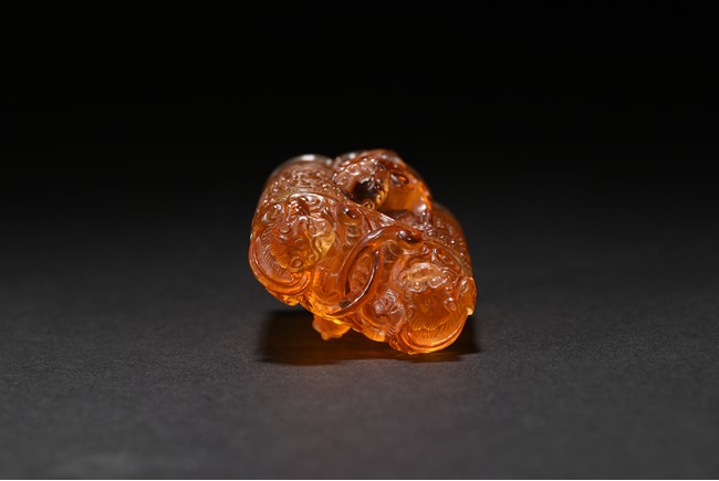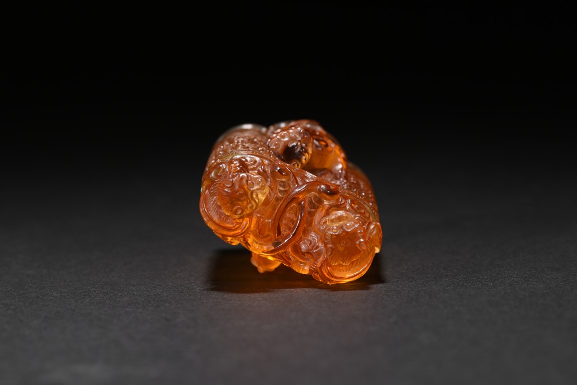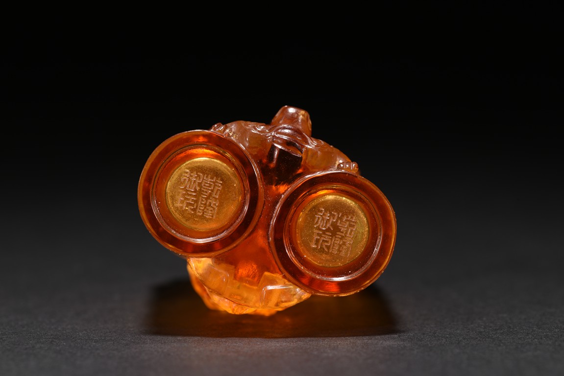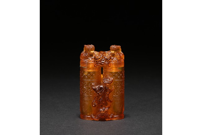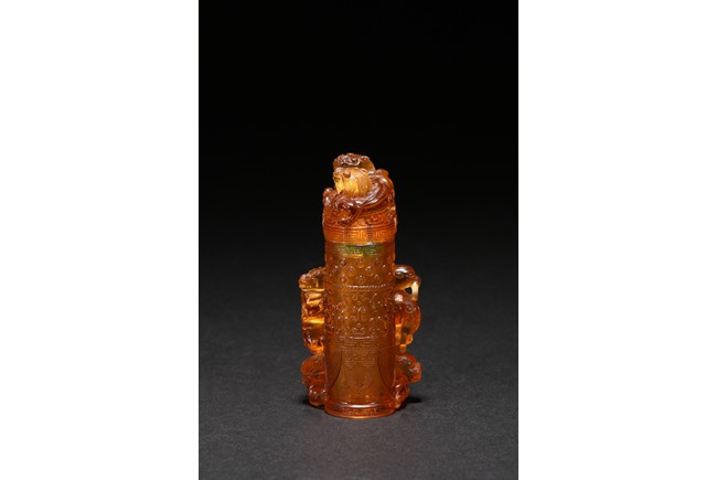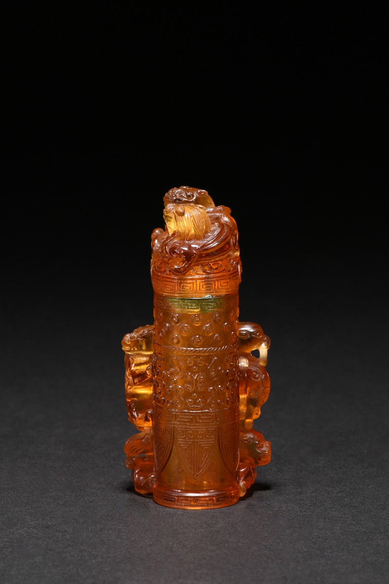 Delicately worked and hollowed in the form of two tubular pedestal vases flanking an eagle standing on the head of a recumbent bear, the eagle suspending a fixed ring from its beak with wings outstretched across both vases, each vase carved in low relief with a band of archaistic motifs between pendent cicada lappets, the rim and foot encircled with a key-fret border, the bear's hindquarters and tails protruding at the bottom on the reverse, above it standing a chilong with long mane, the double cover detailed with two recumbent mythical beasts turning their heads to stare at each other. Each base bears a four character mark. Qing Dynasty Qianlong period.